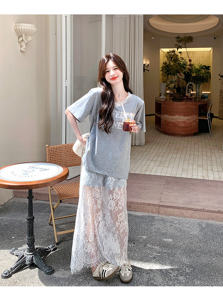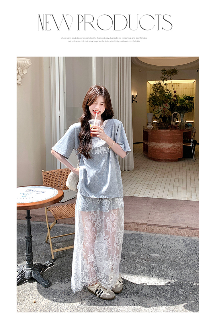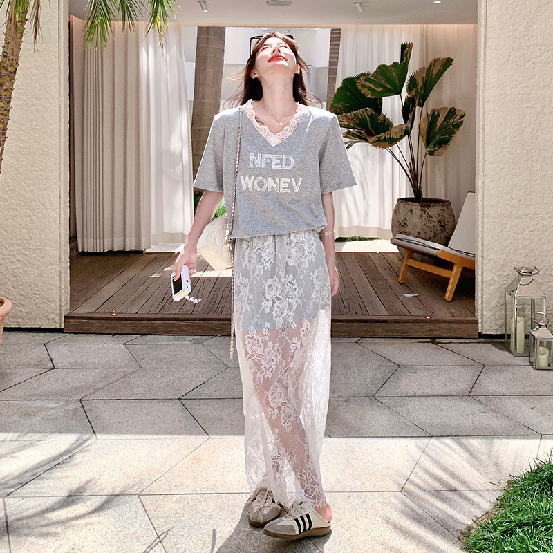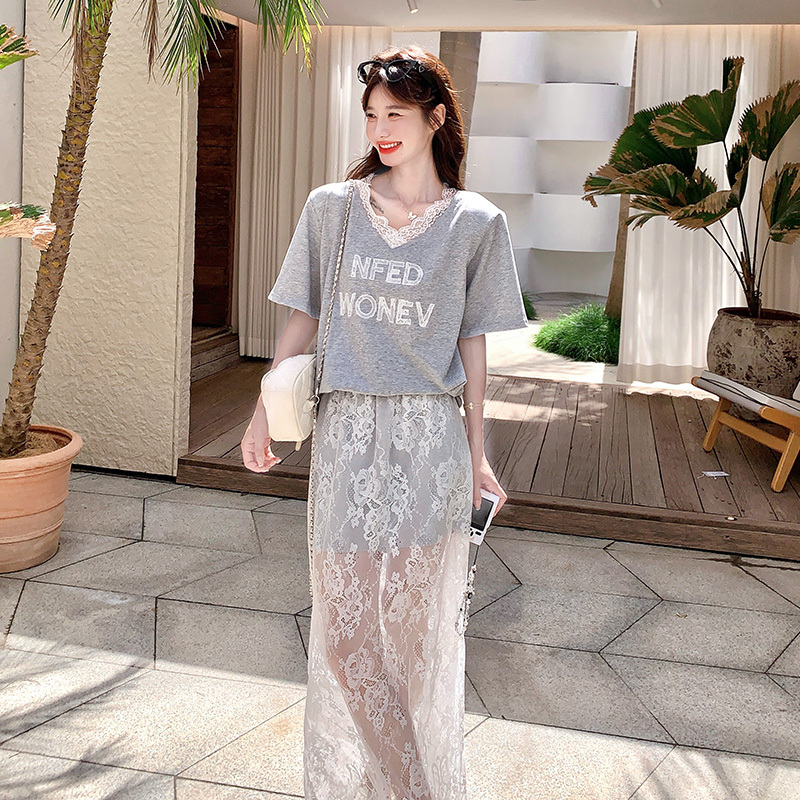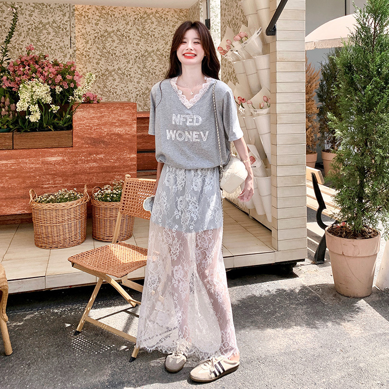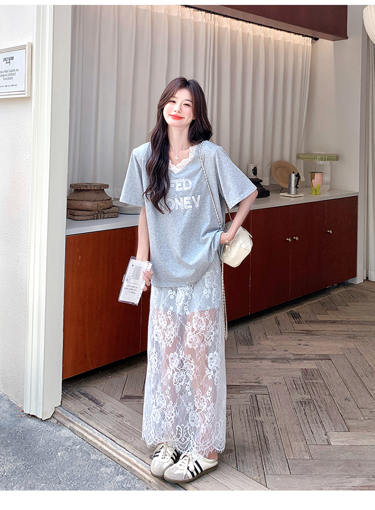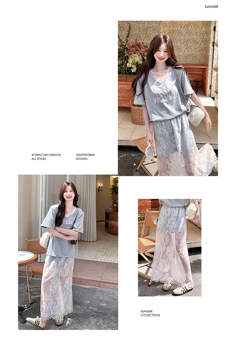 獨家訂製│2件式 V領蕾絲拼接T恤+蕾絲拼接假兩件A字裙(07A1592)