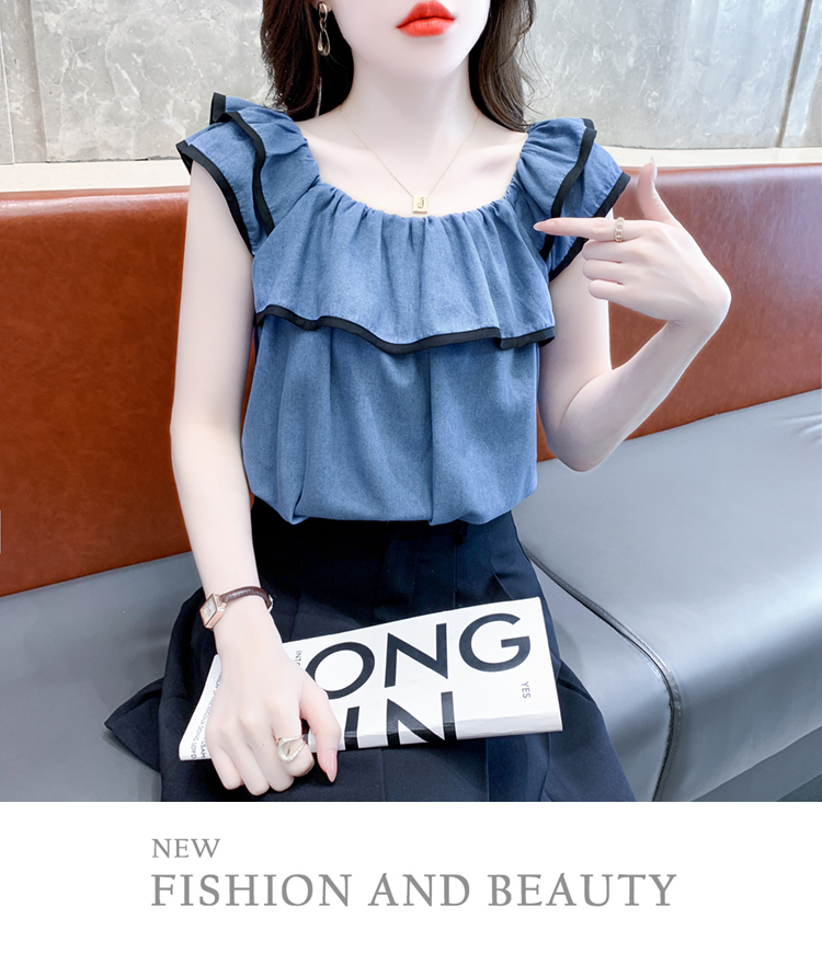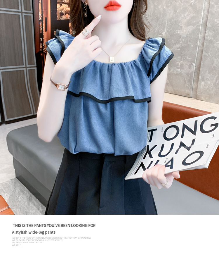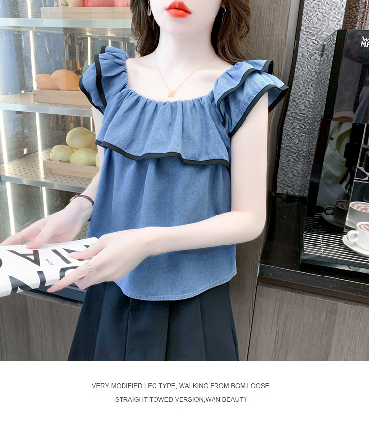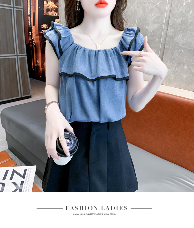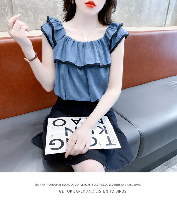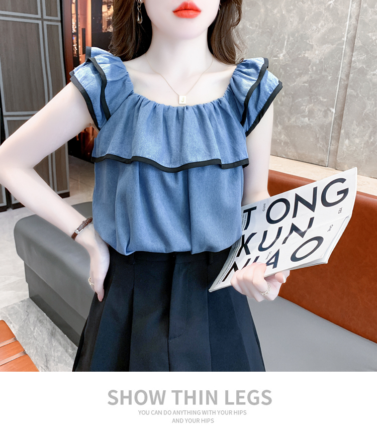 限量特惠|甜美撞色荷葉邊造型牛仔上衣(08H4185)