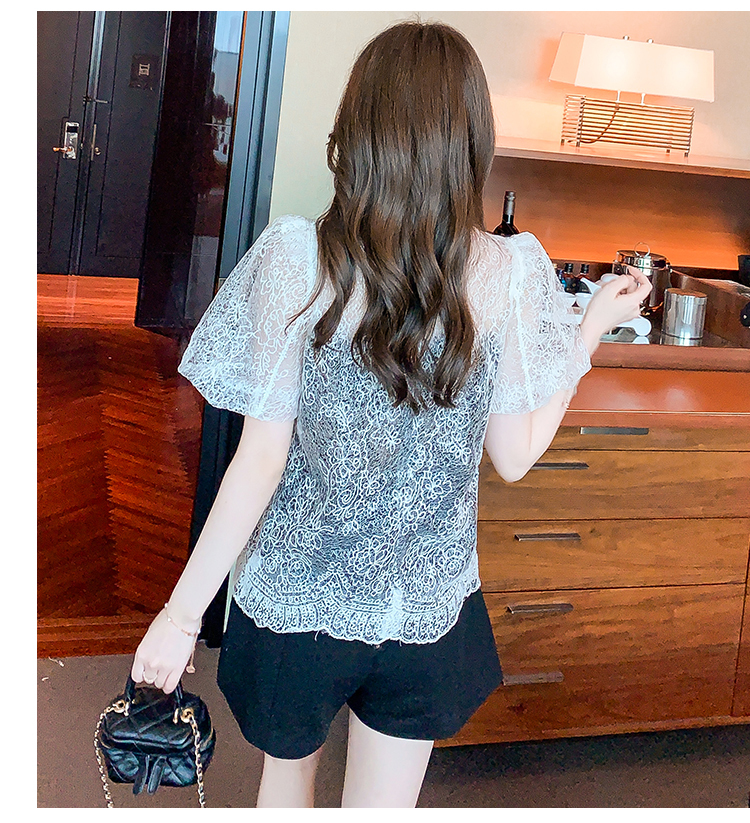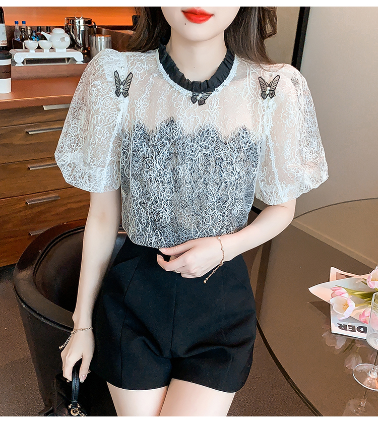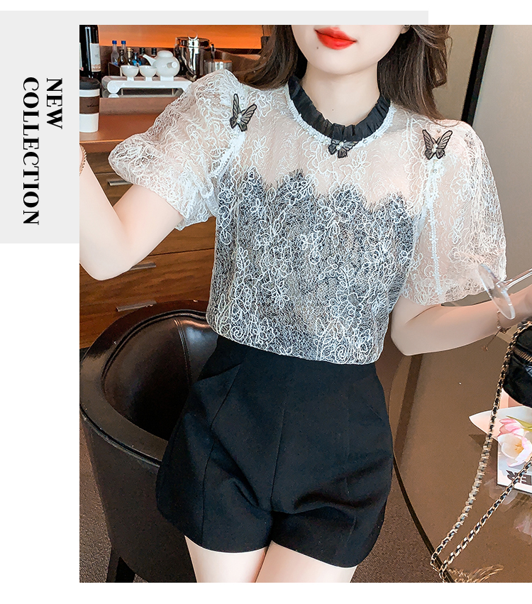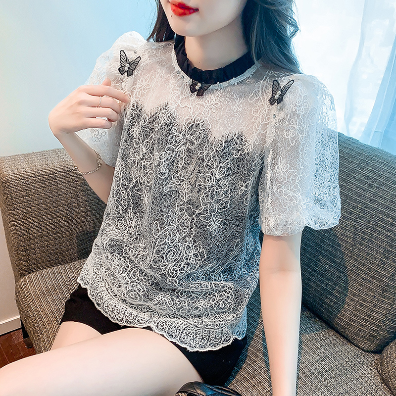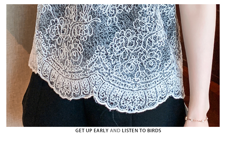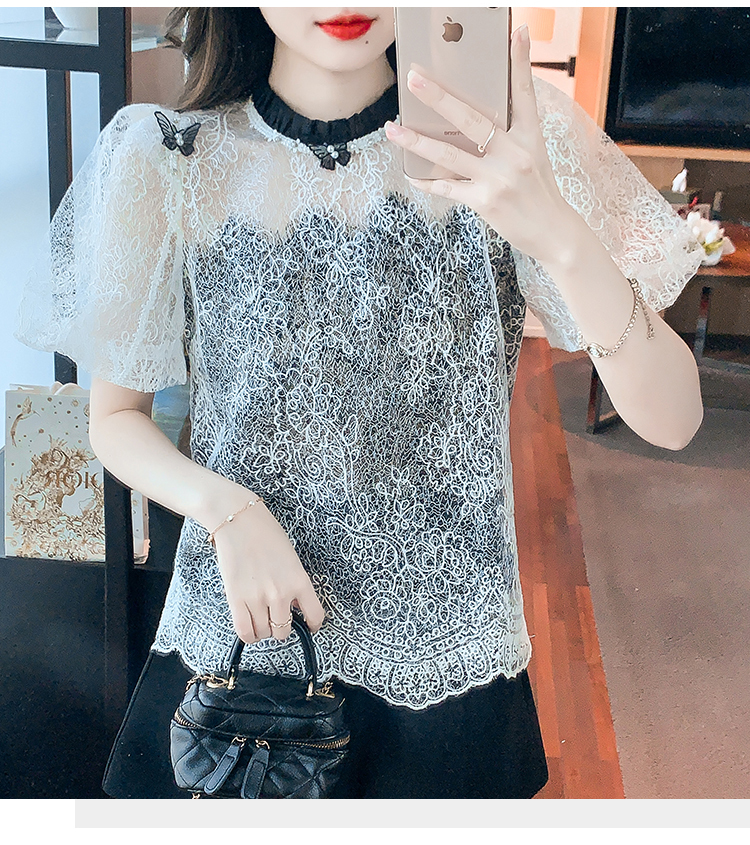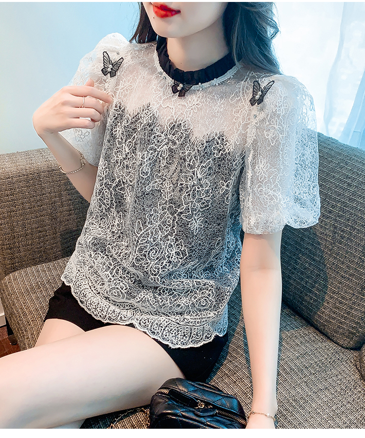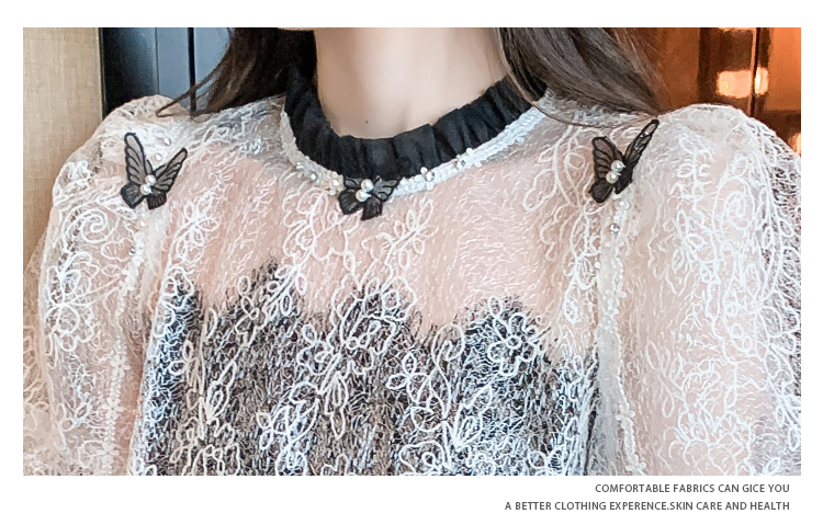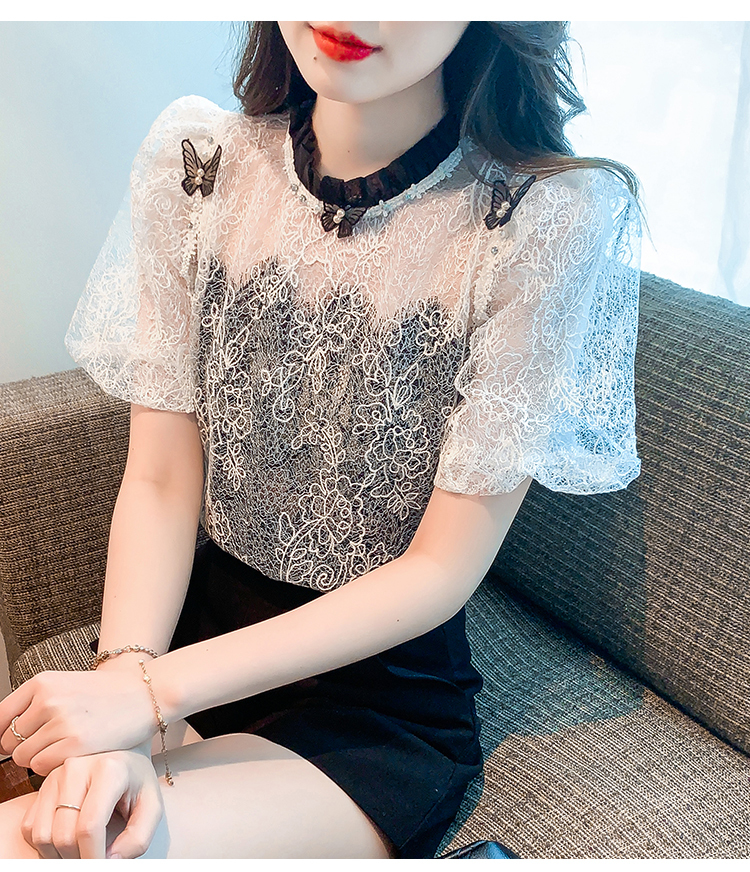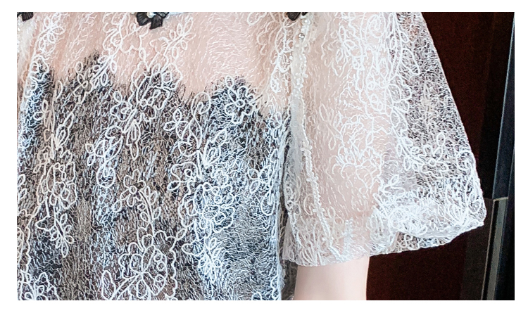 限量特惠|性感重工微透膚撞色拼接鈎花蕾絲衫(08H4235)