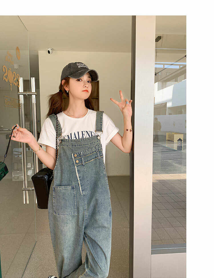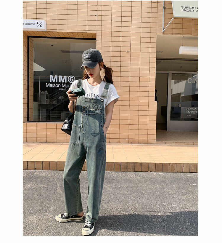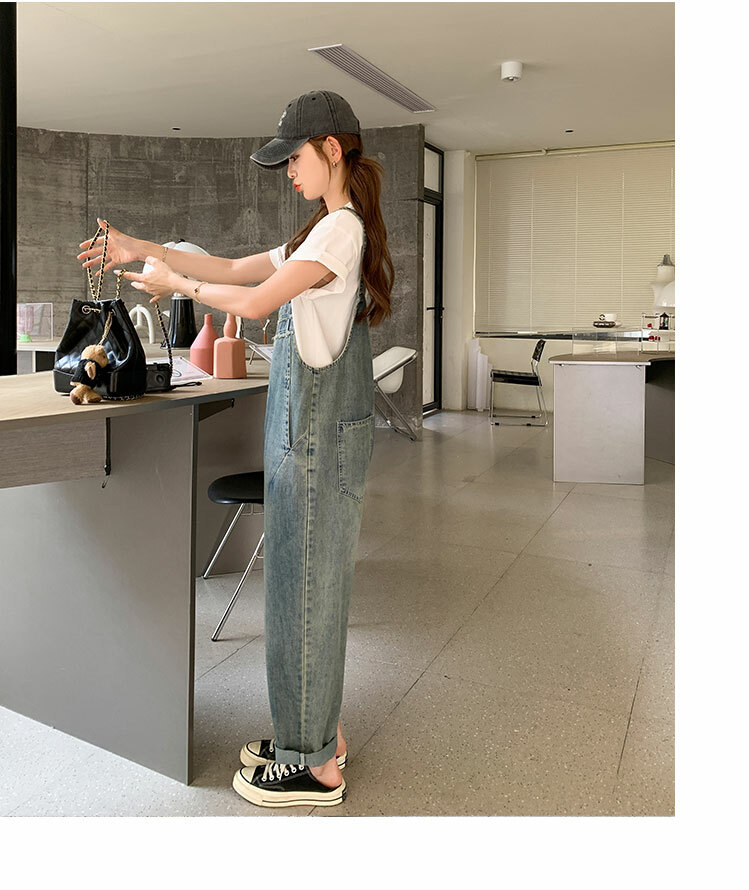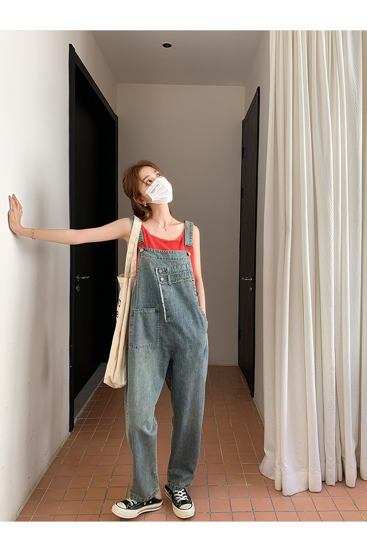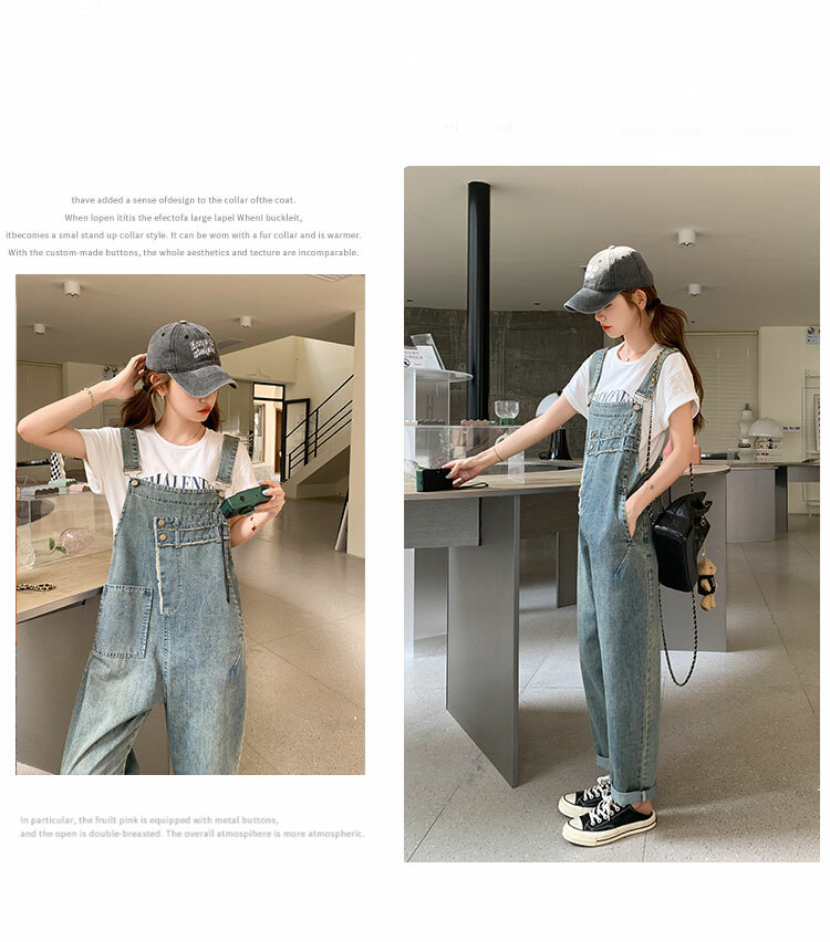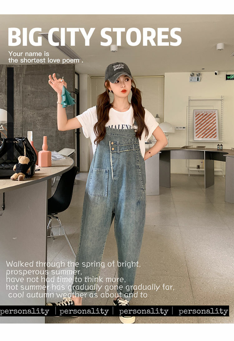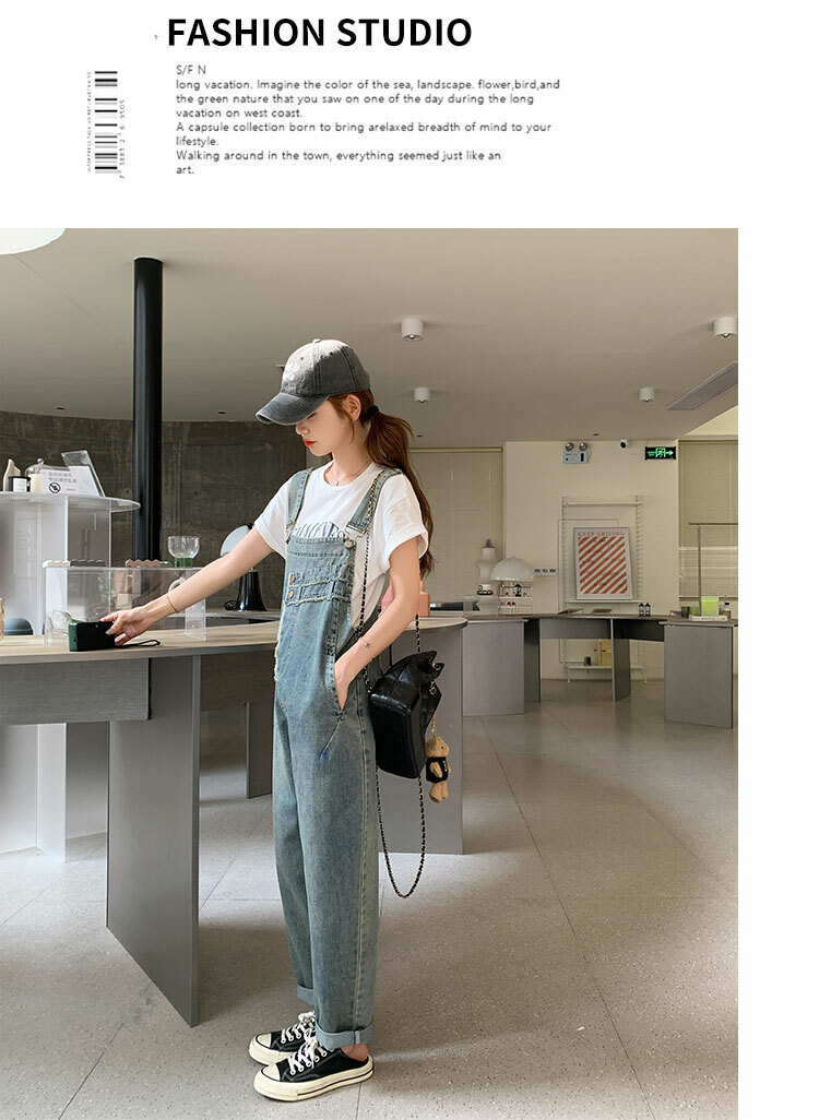 獨家訂製│韓系甜酷風刷毛邊拼接造型牛仔吊帶褲(08H4437)