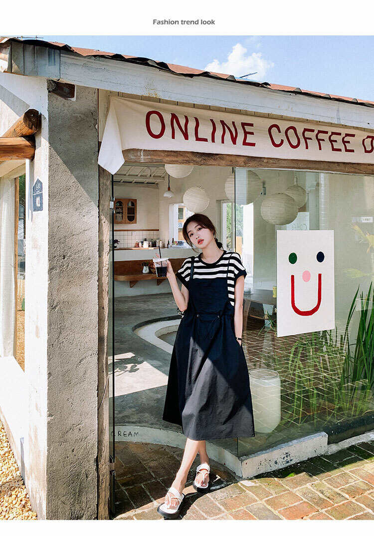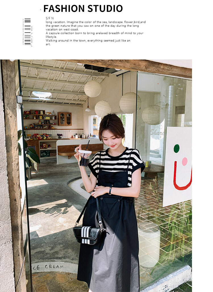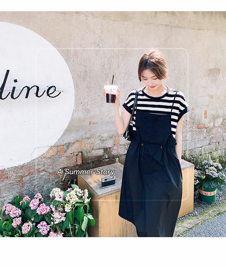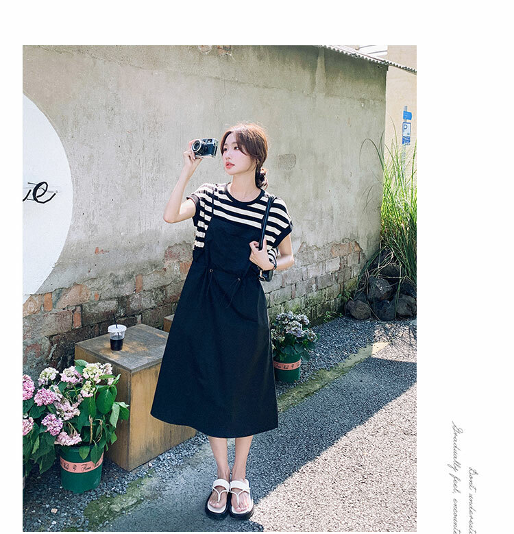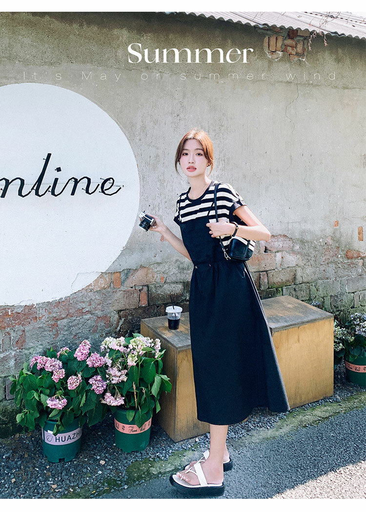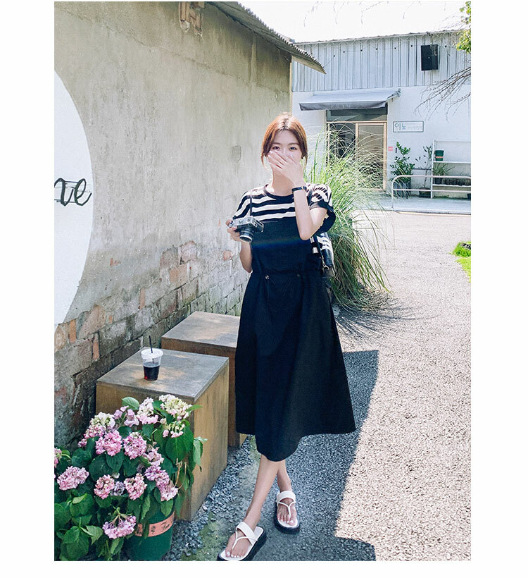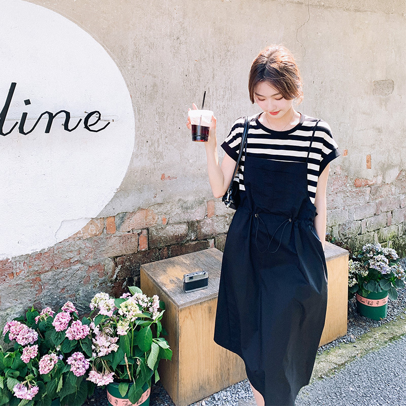 獨家訂製│韓系甜姊兒拼接條紋抽繩收腰假兩件式連身裙(08H4439)