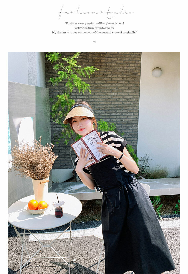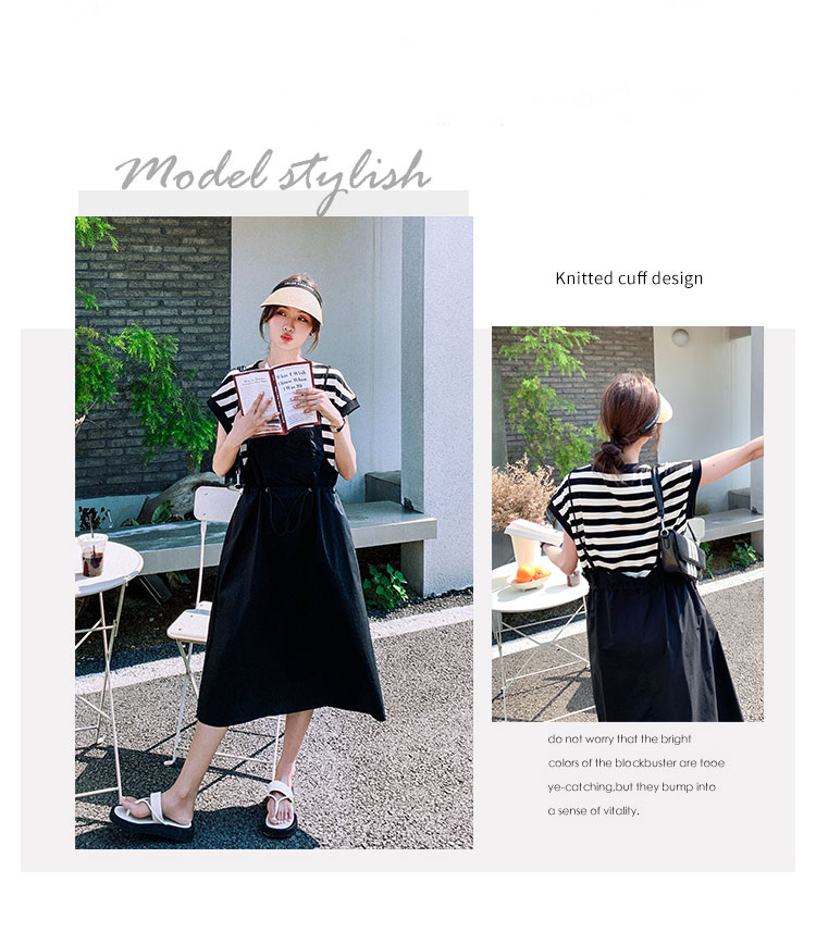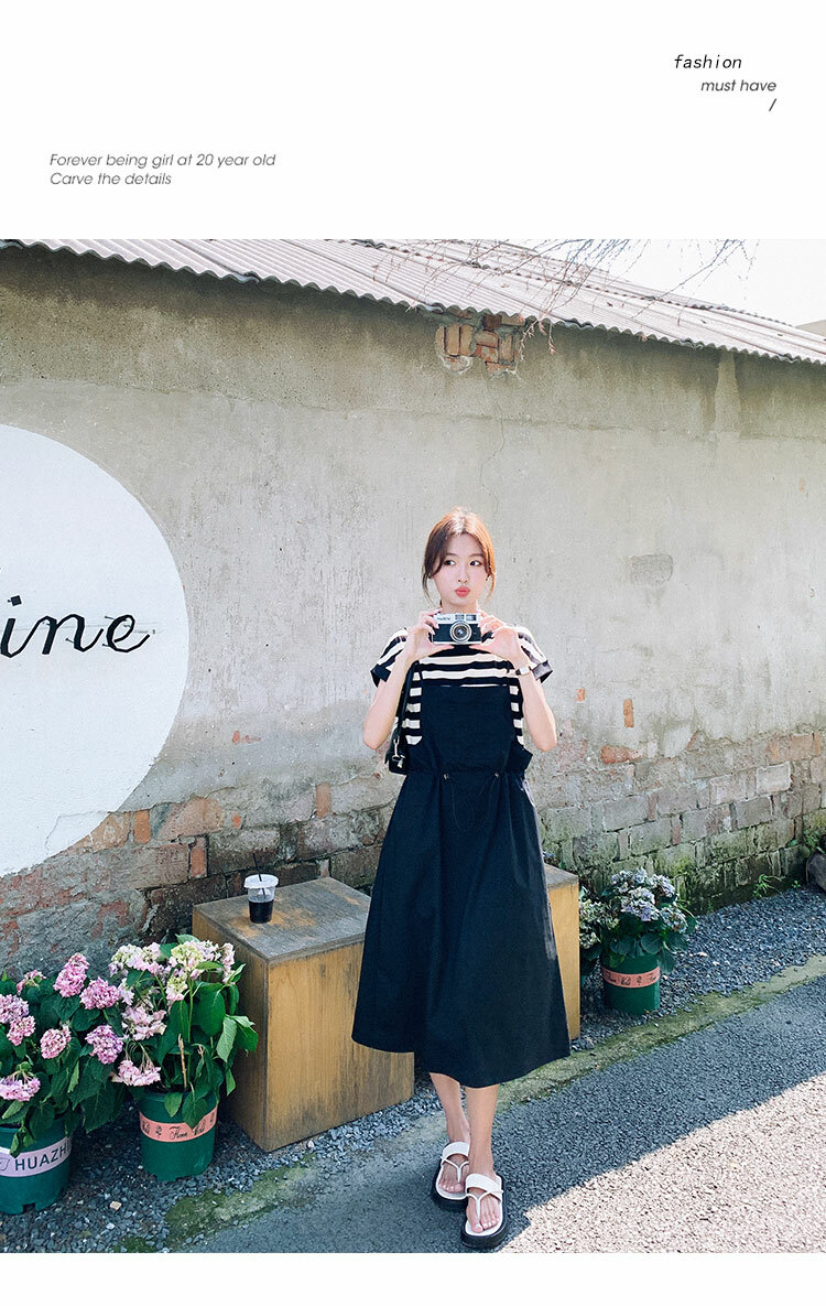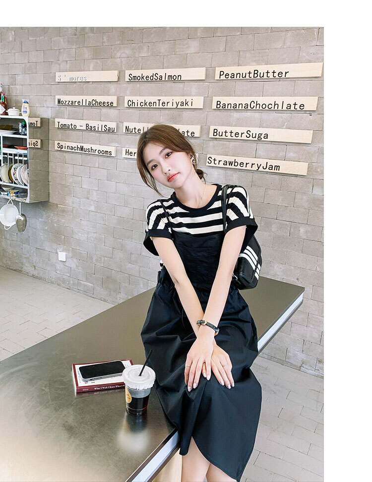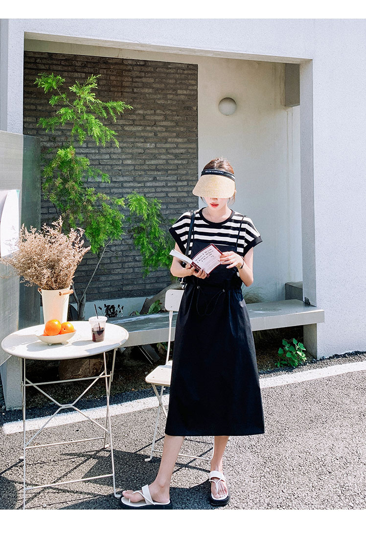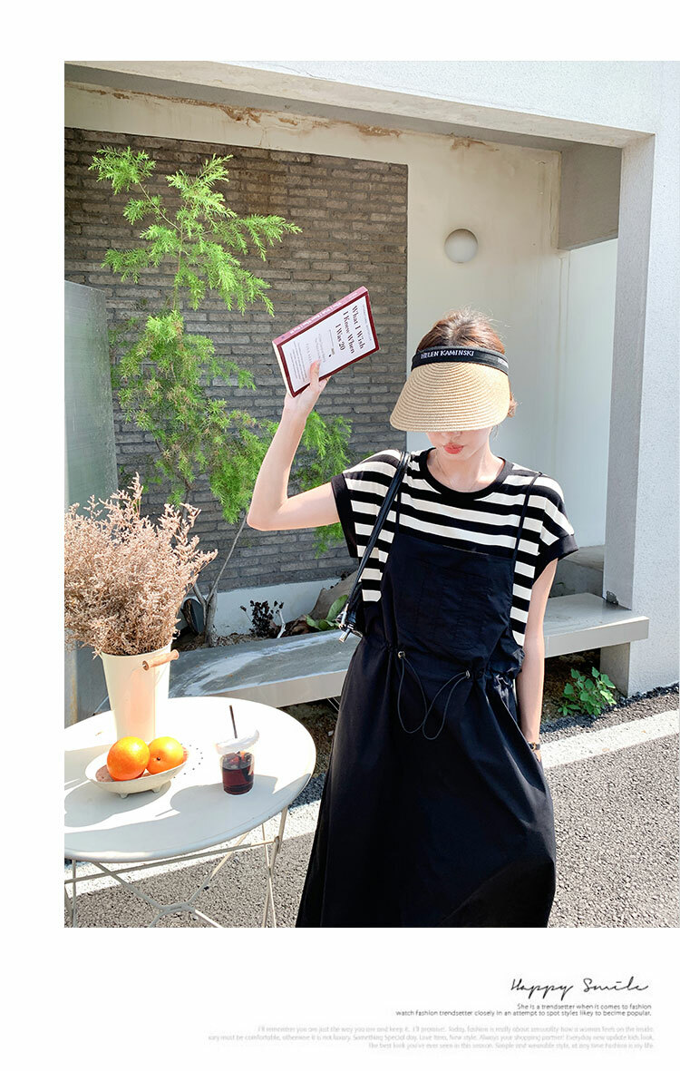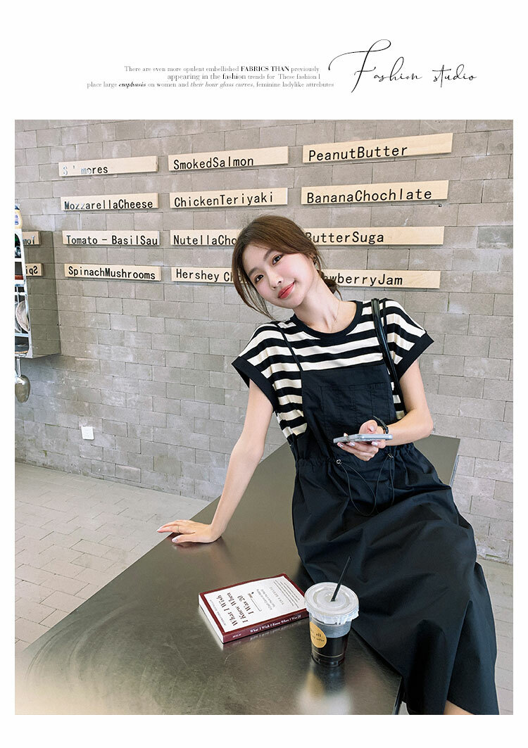 獨家訂製│韓系甜姊兒拼接條紋抽繩收腰假兩件式連身裙(08H4439)
