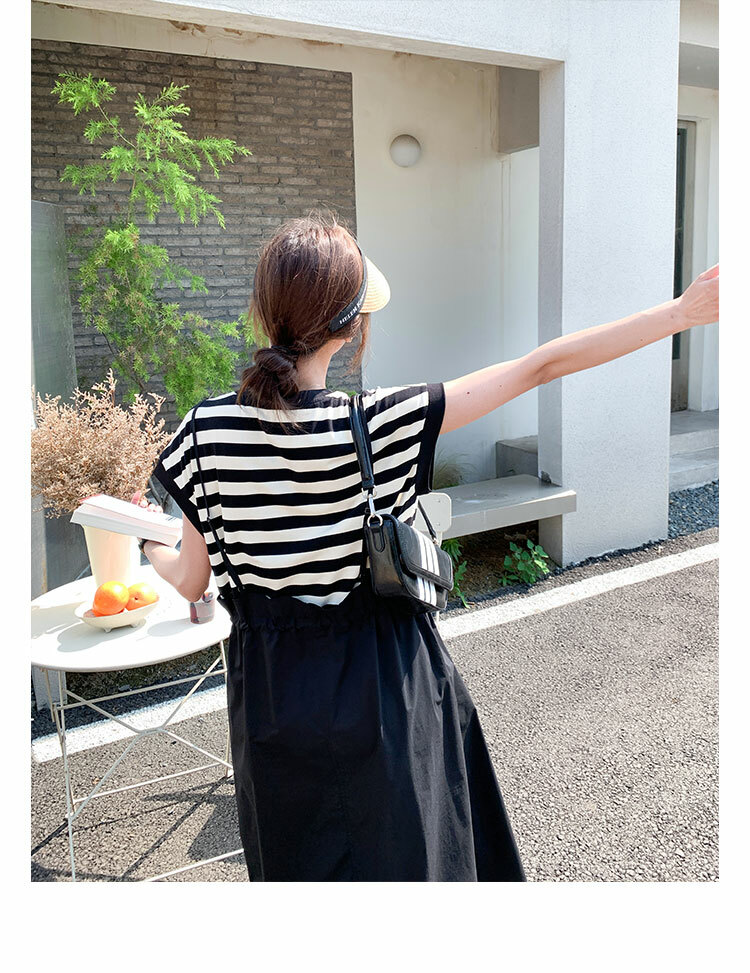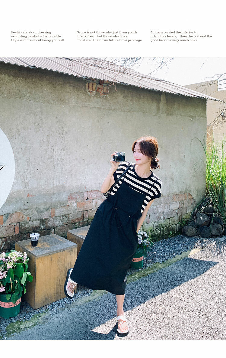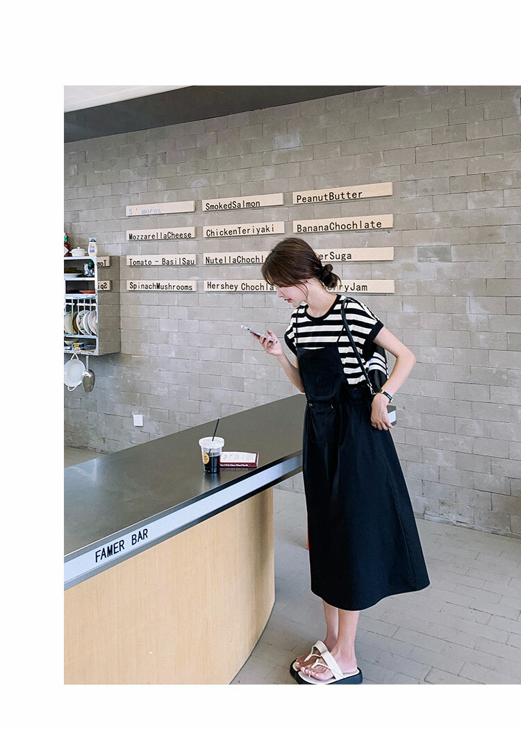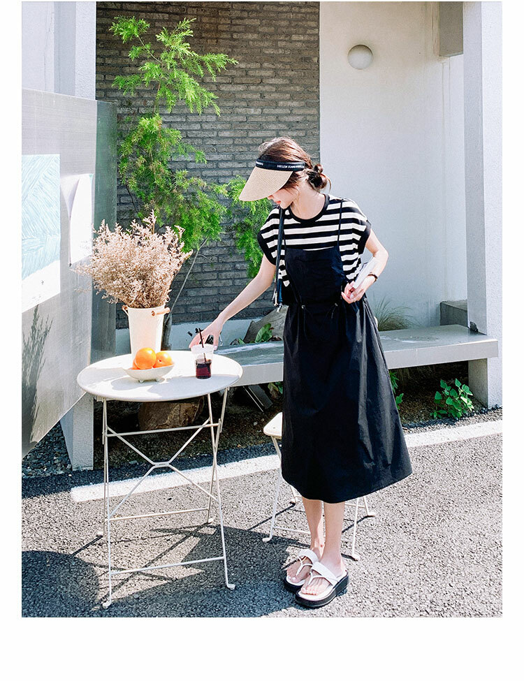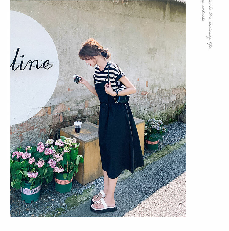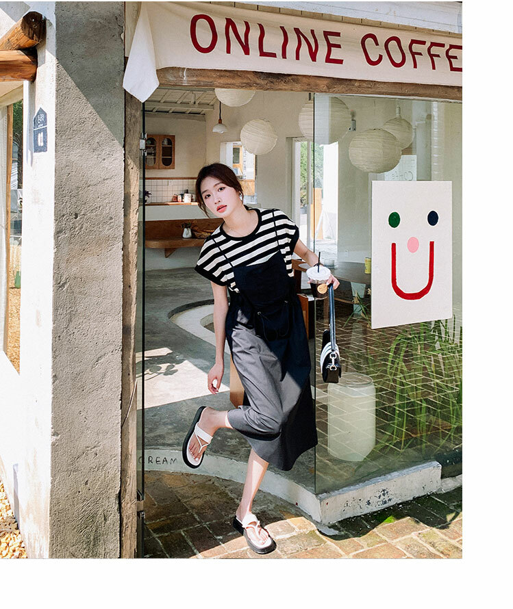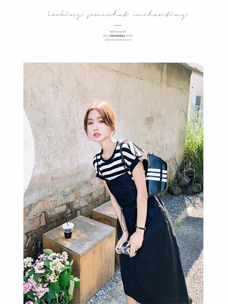 獨家訂製│韓系甜姊兒拼接條紋抽繩收腰假兩件式連身裙(08H4439)