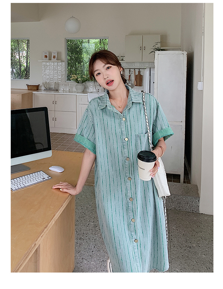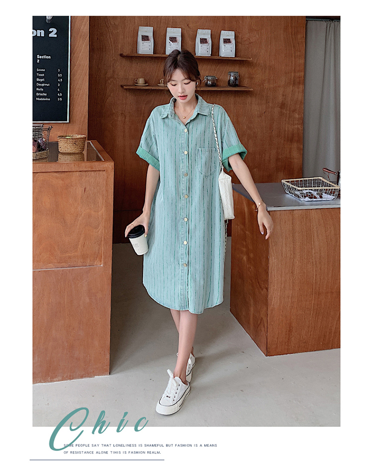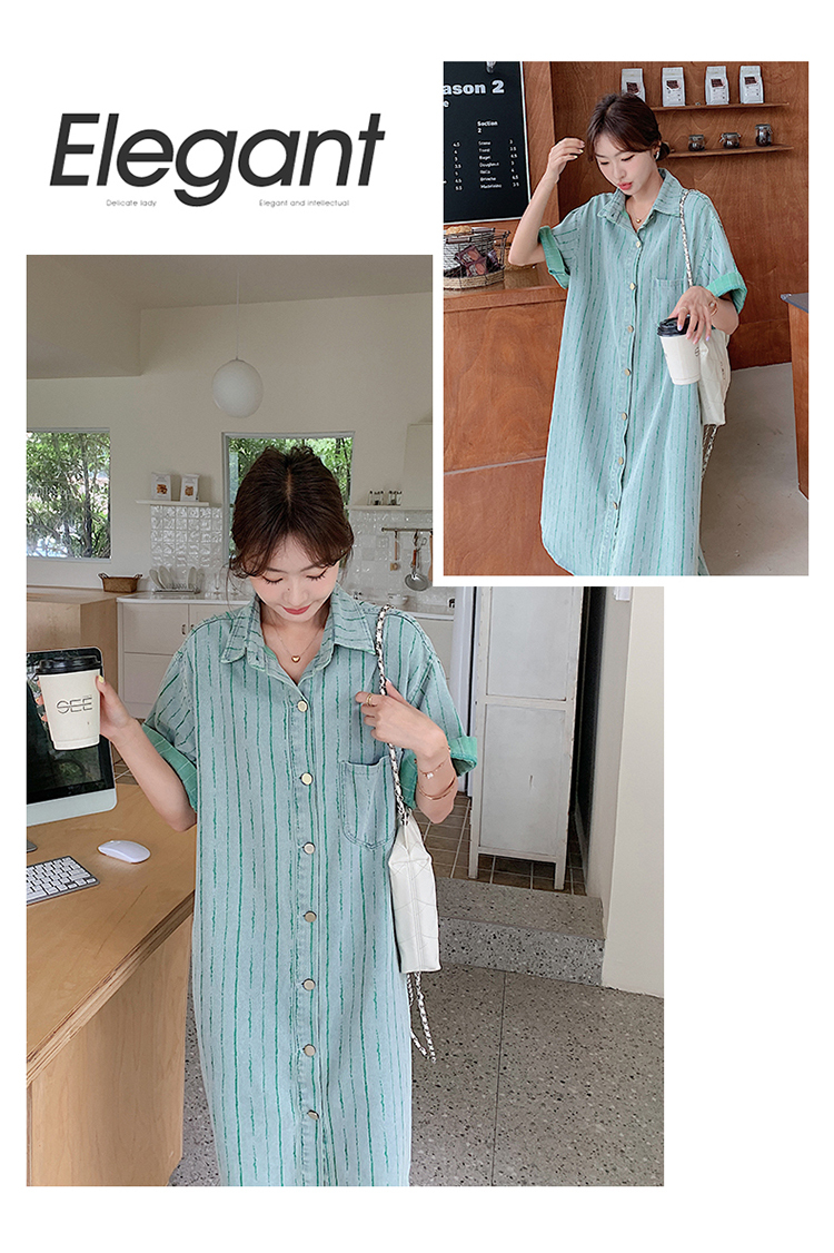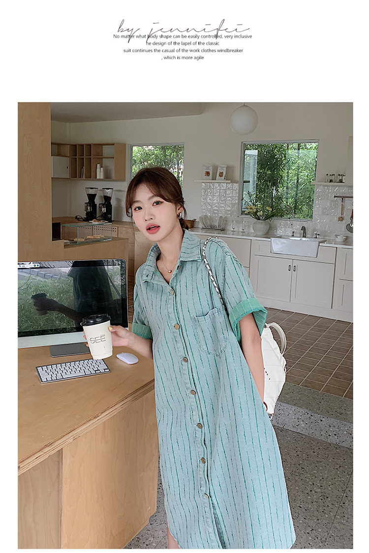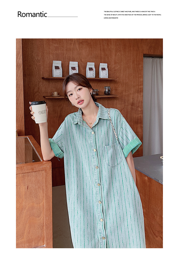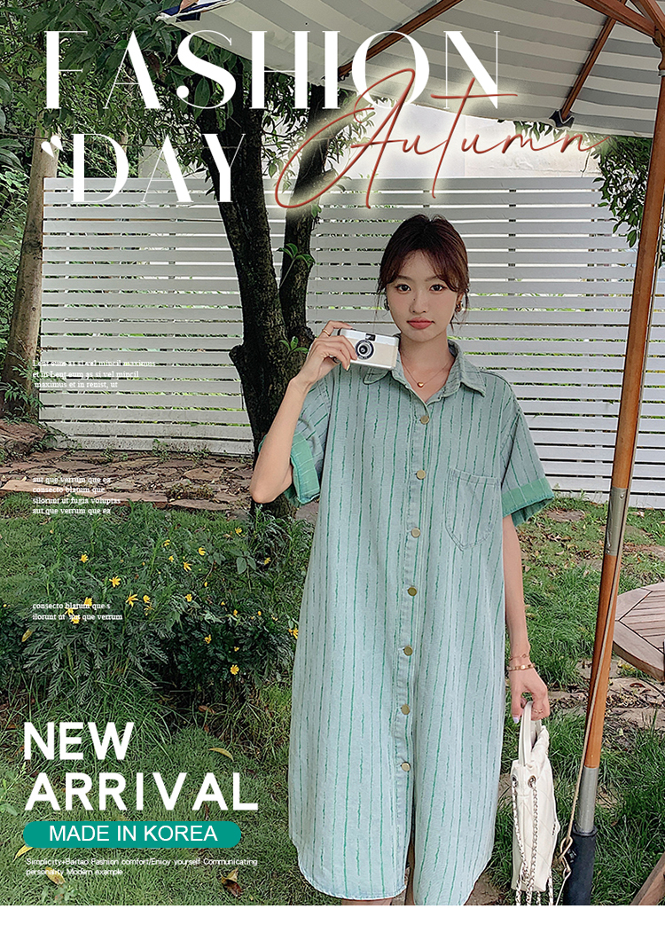 獨家訂製│韓系甜姊兒豎條紋捲邊袖牛仔連身裙(08H4451)
