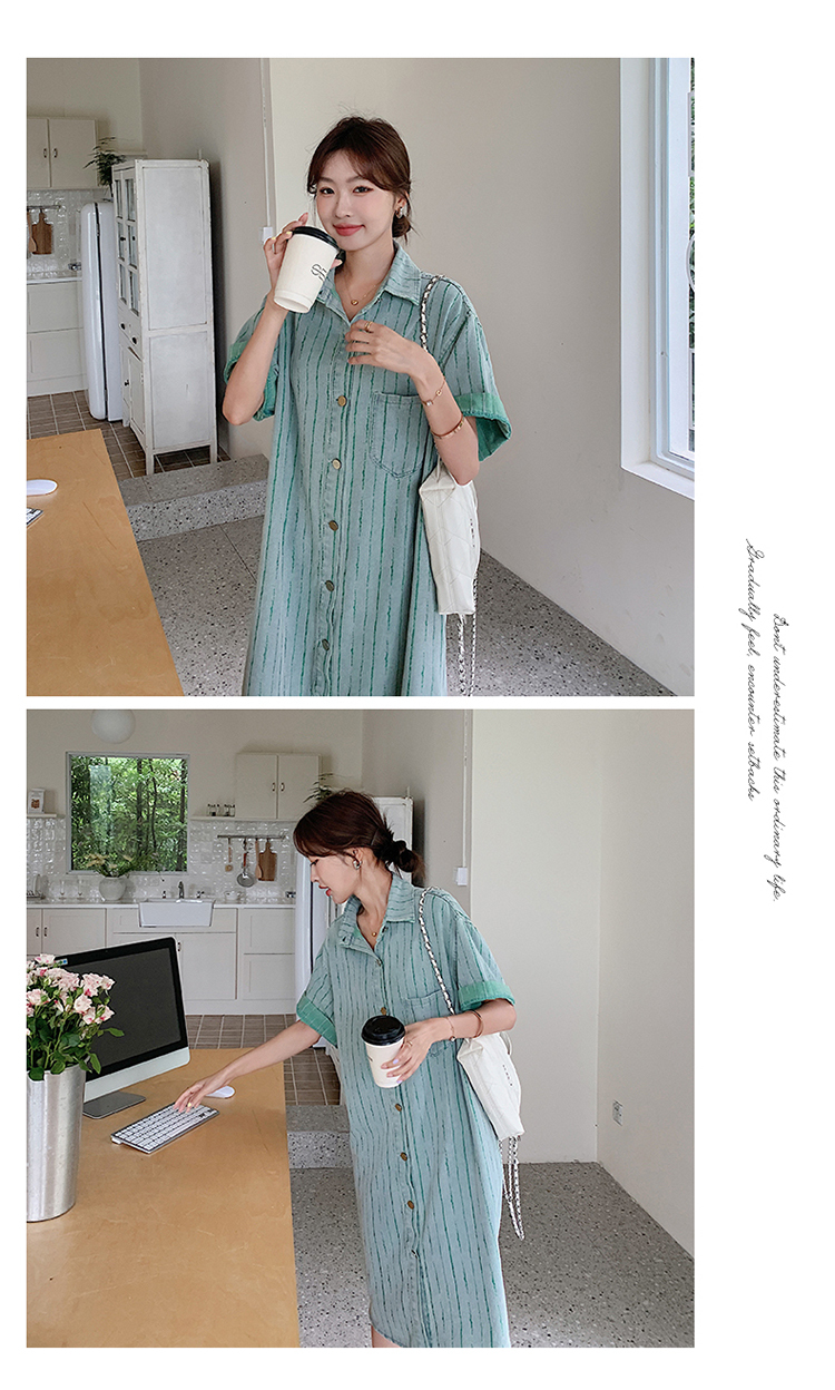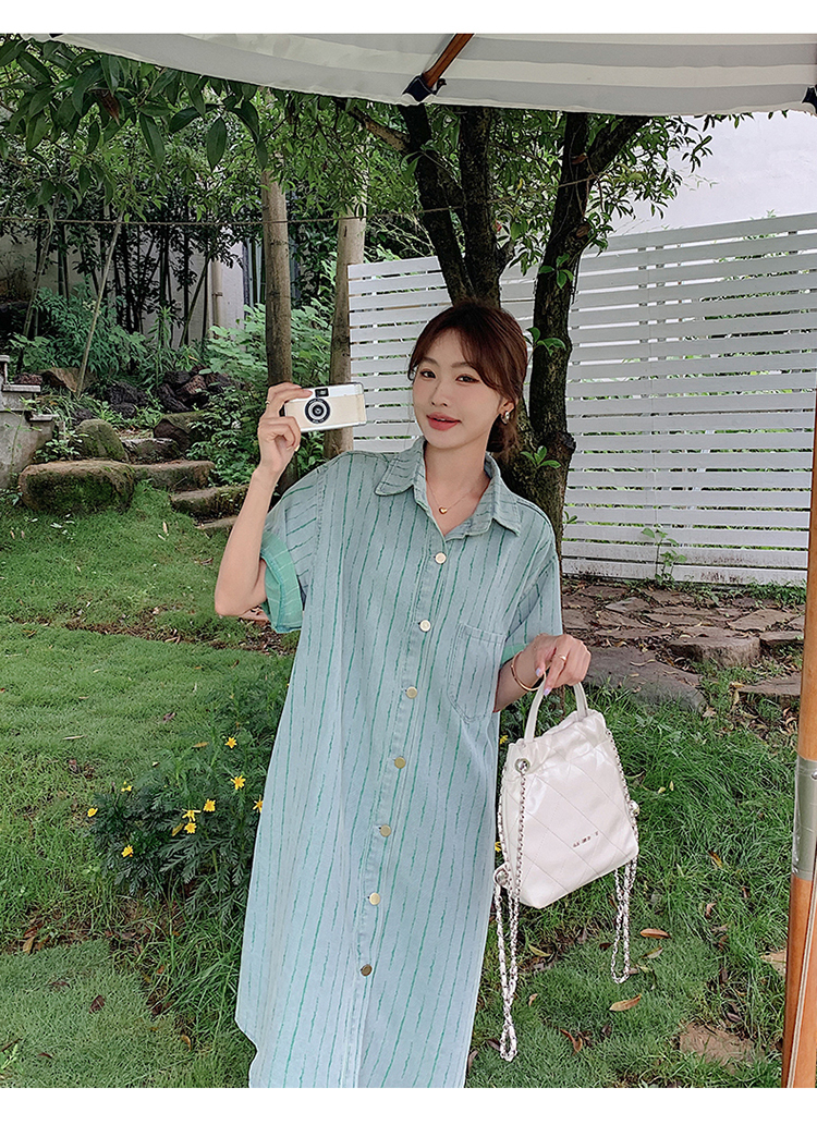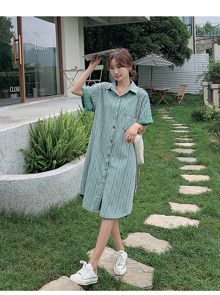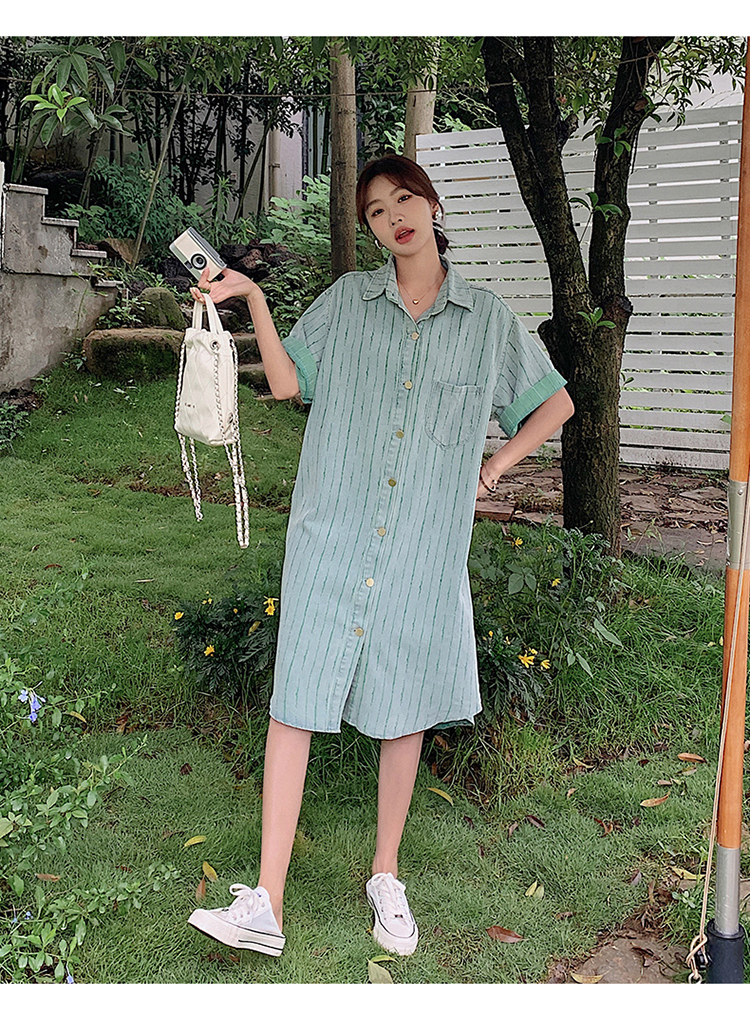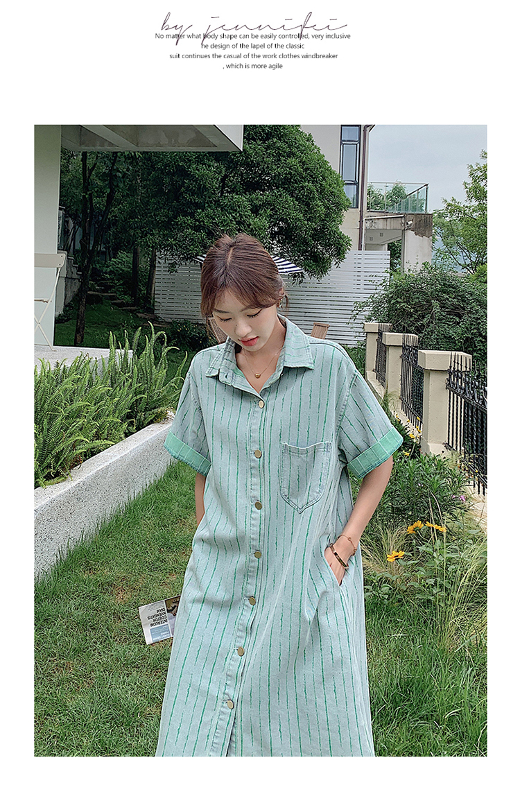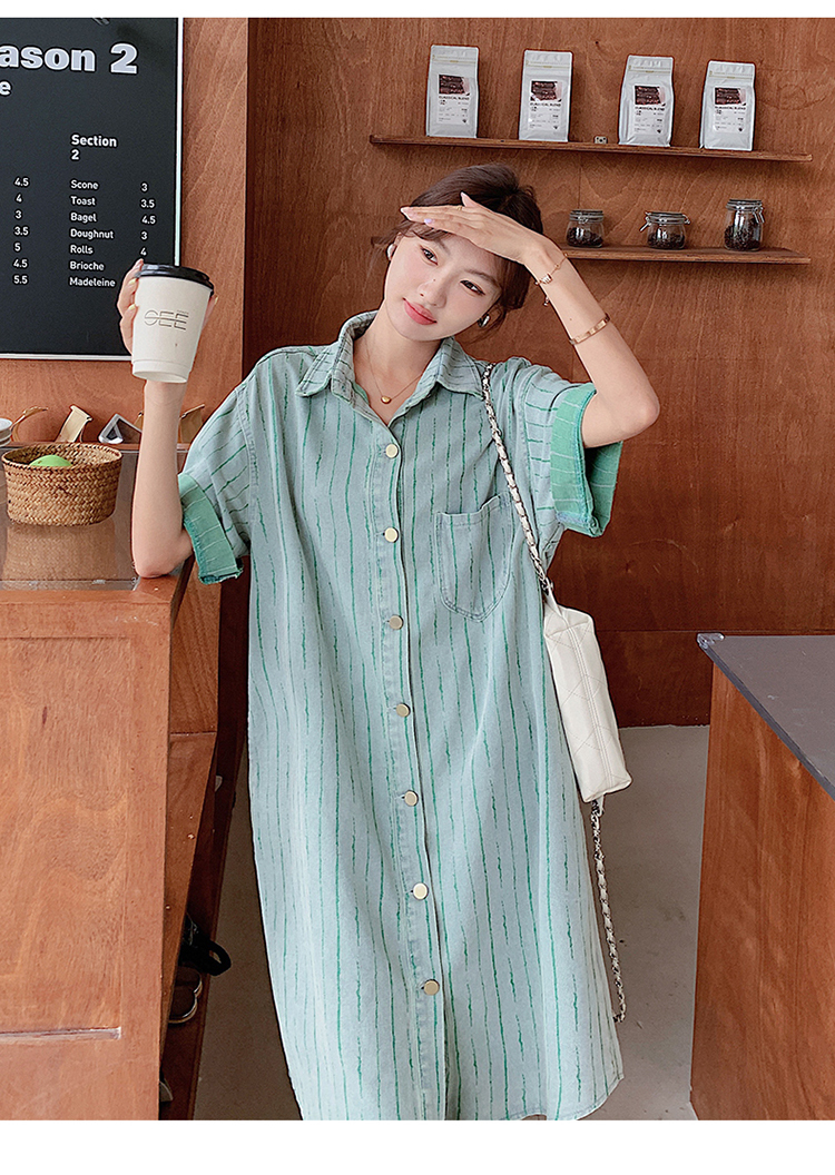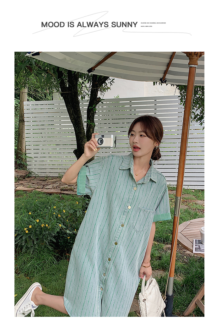 獨家訂製│韓系甜姊兒豎條紋捲邊袖牛仔連身裙(08H4451)