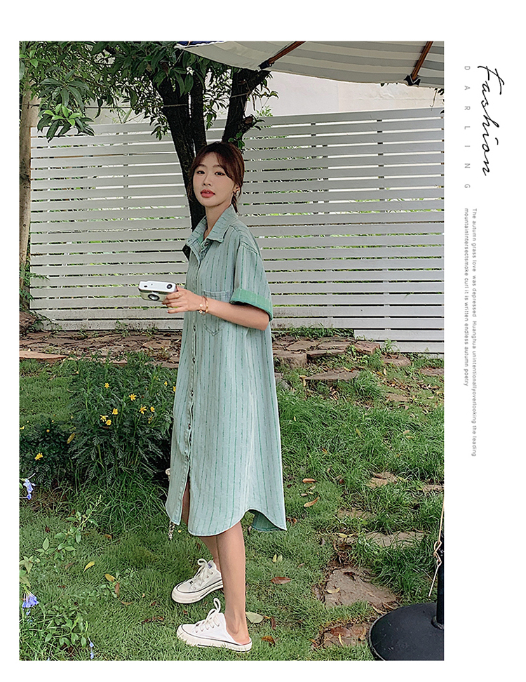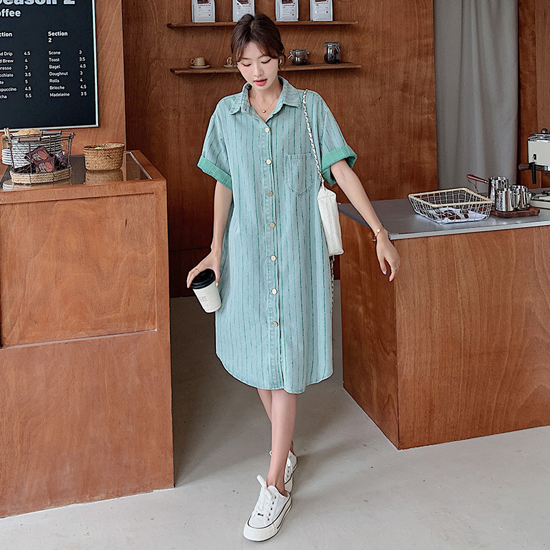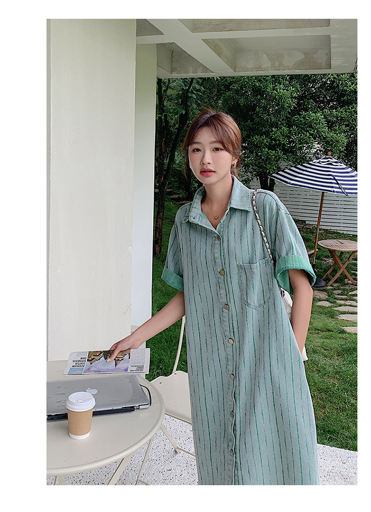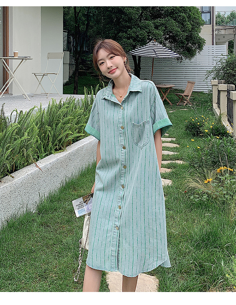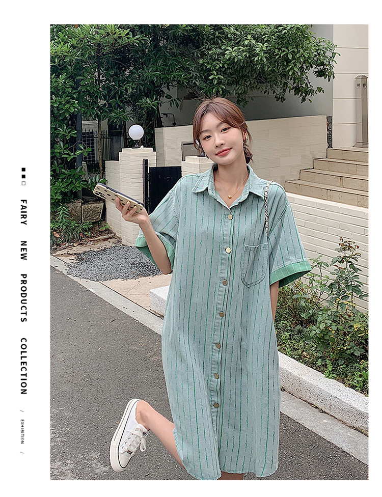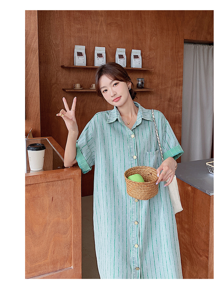獨家訂製│韓系甜姊兒豎條紋捲邊袖牛仔連身裙(08H4451)
