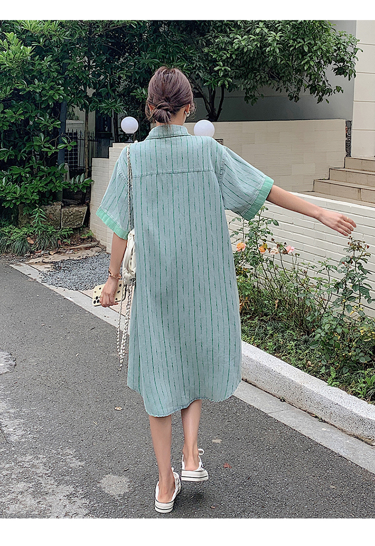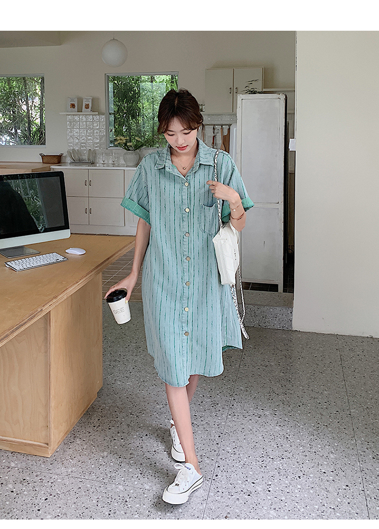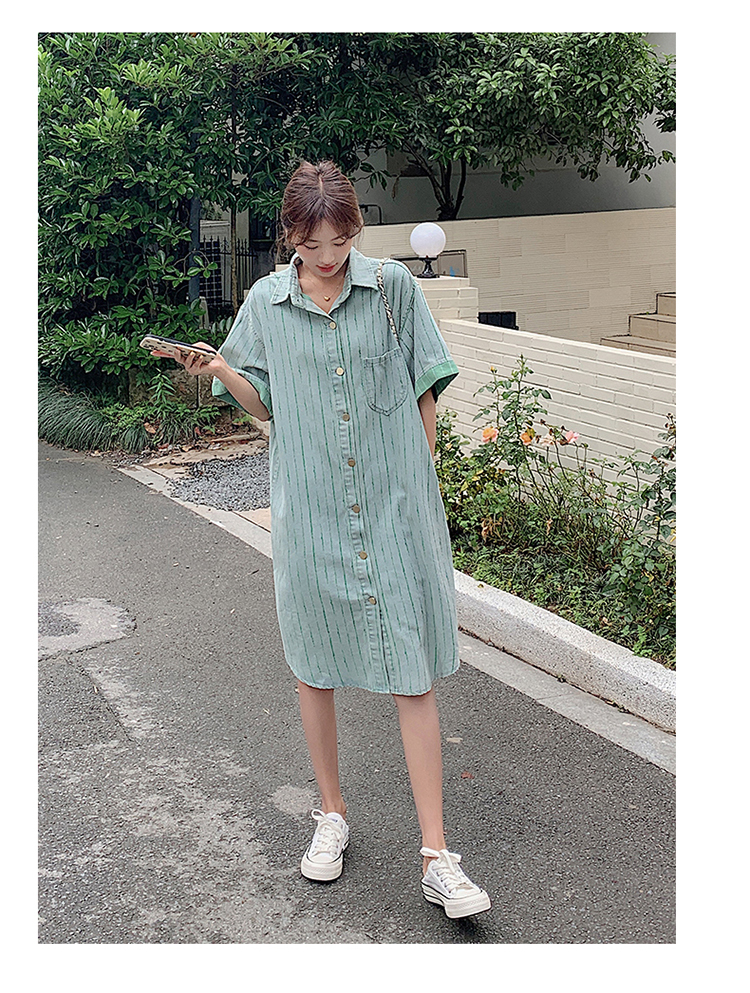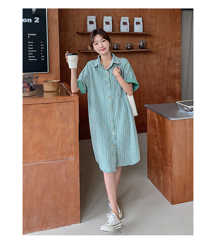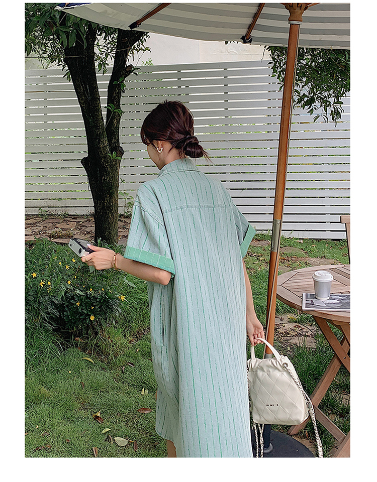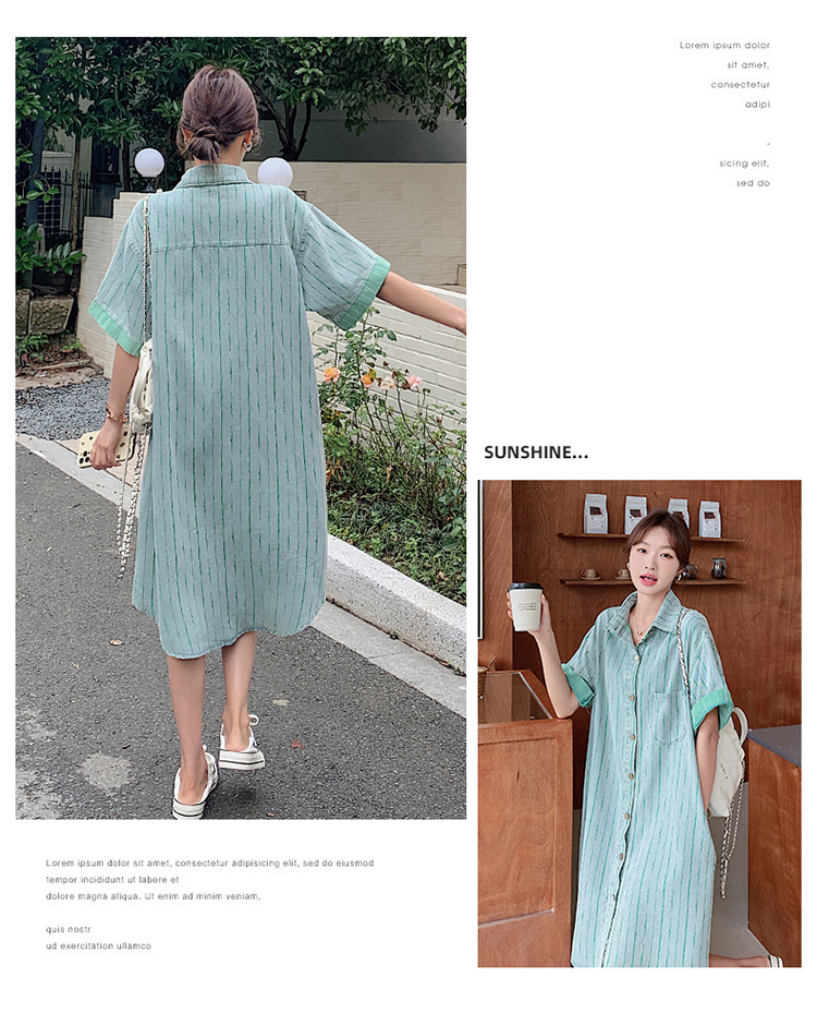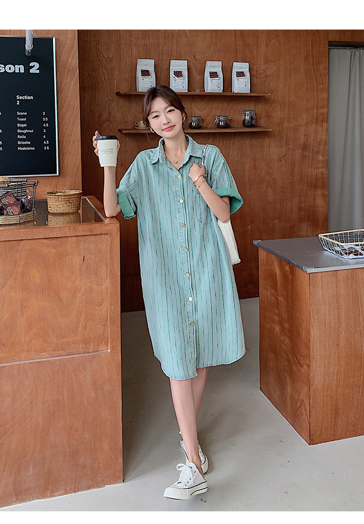 獨家訂製│韓系甜姊兒豎條紋捲邊袖牛仔連身裙(08H4451)