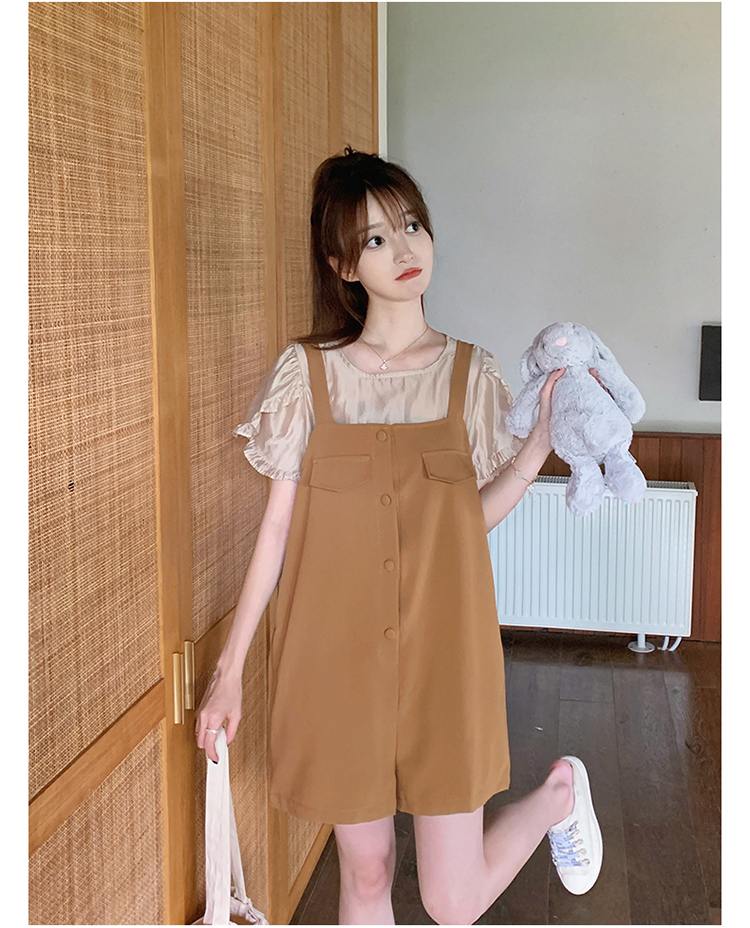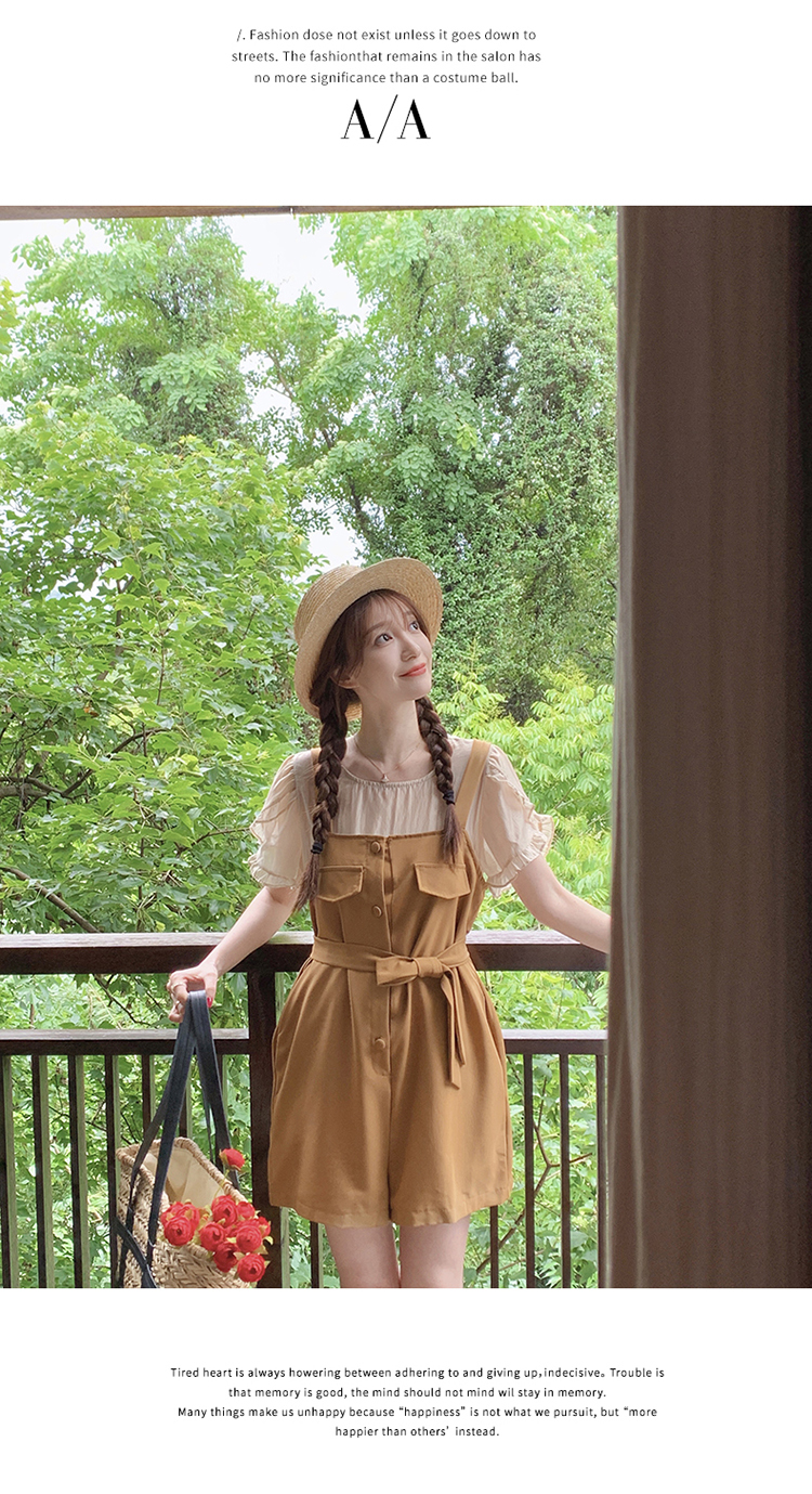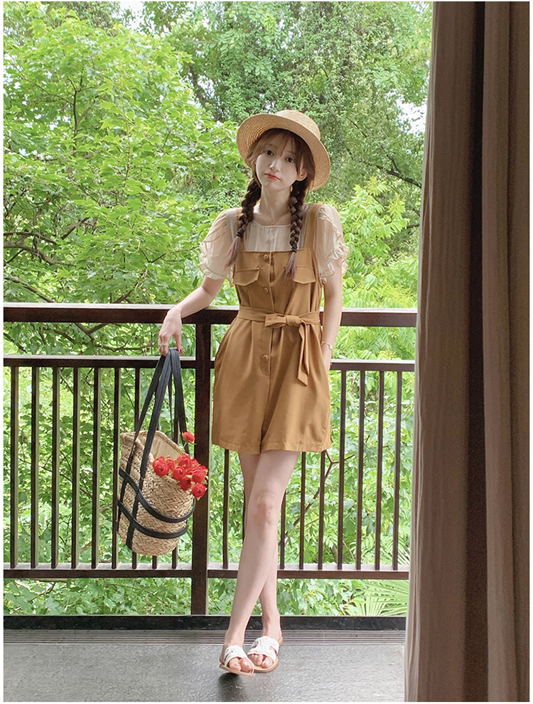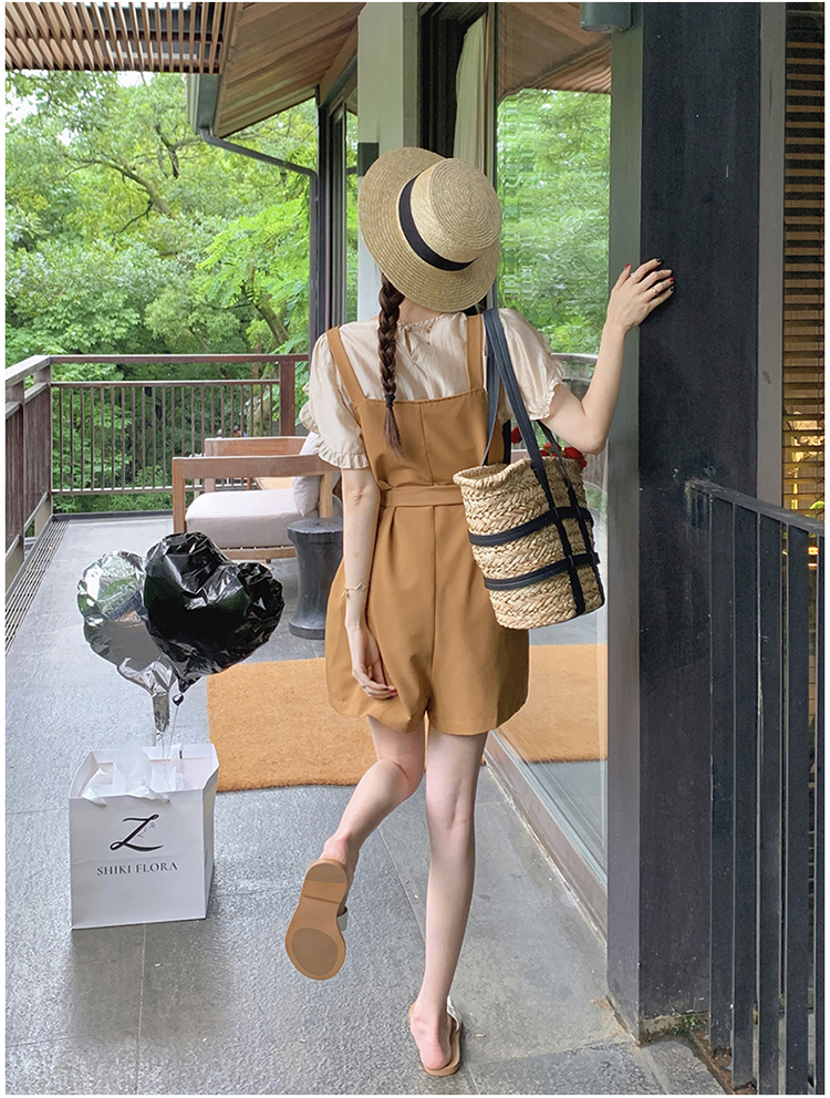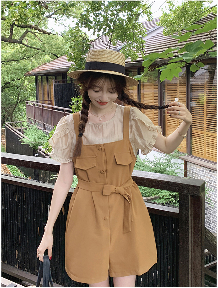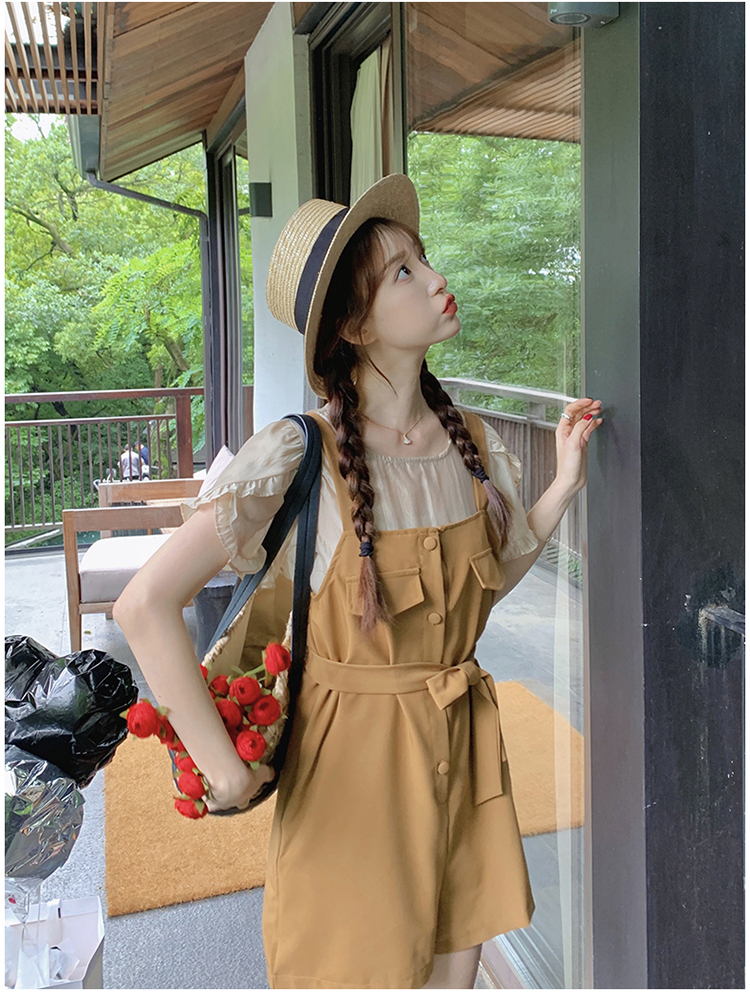 獨家訂製│韓系甜感荷葉邊雪紡衫+排釦繫帶雪紡吊帶褲兩件式套裝組(08H4472)