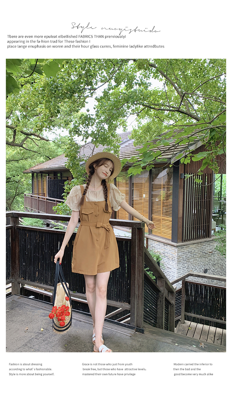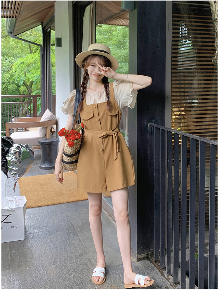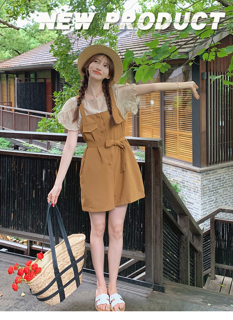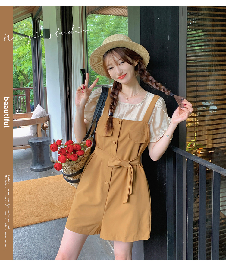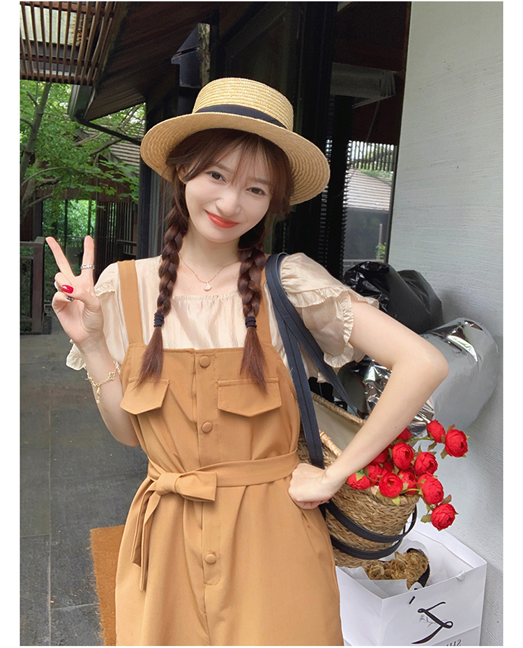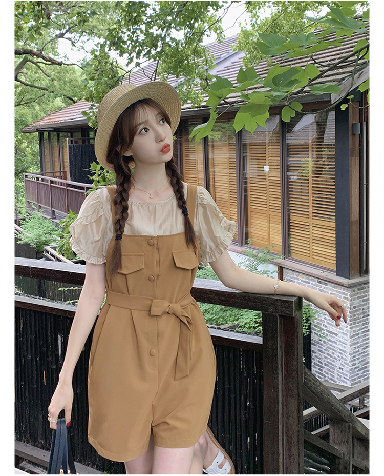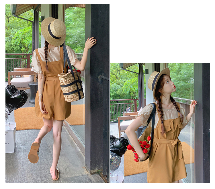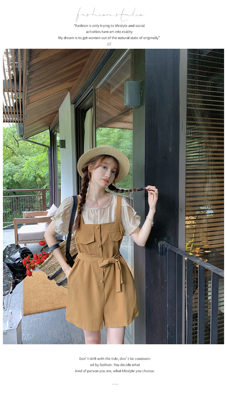 獨家訂製│韓系甜感荷葉邊雪紡衫+排釦繫帶雪紡吊帶褲兩件式套裝組(08H4472)