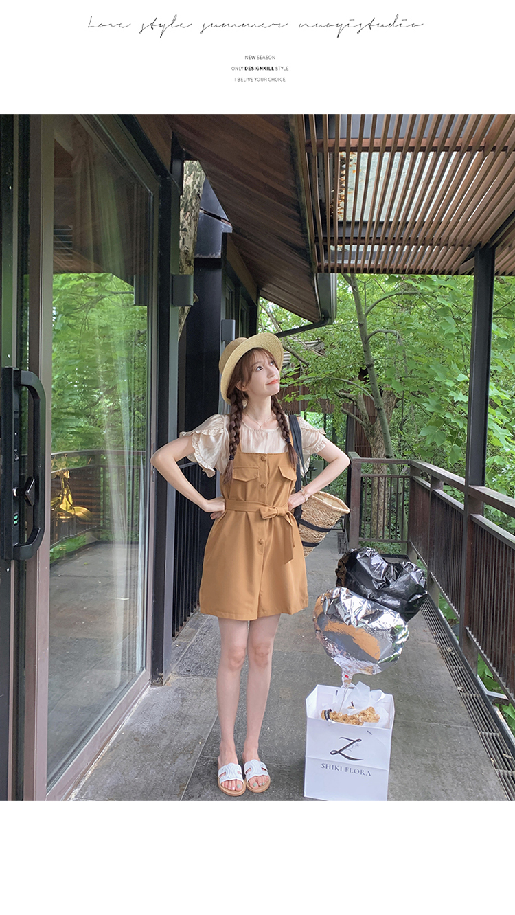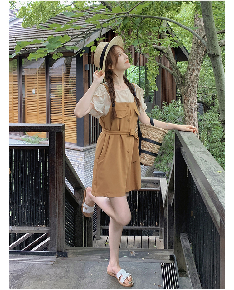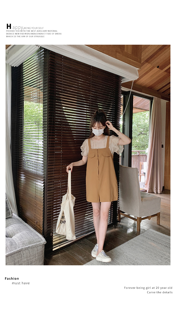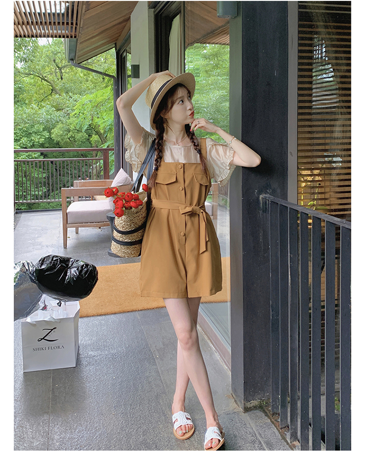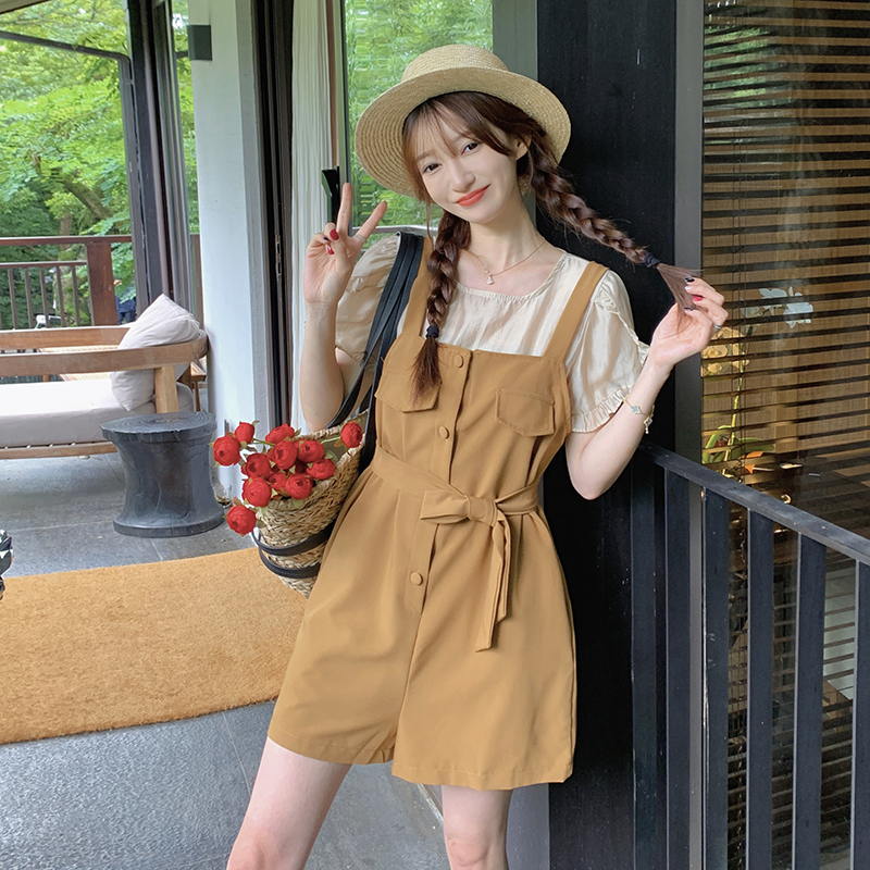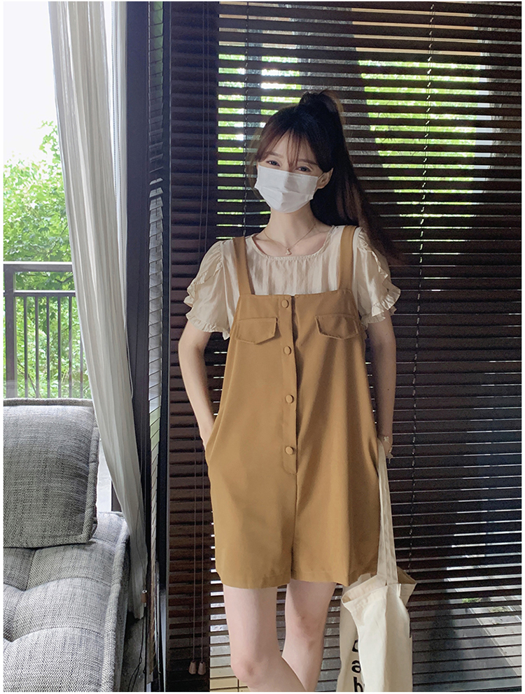 獨家訂製│韓系甜感荷葉邊雪紡衫+排釦繫帶雪紡吊帶褲兩件式套裝組(08H4472)