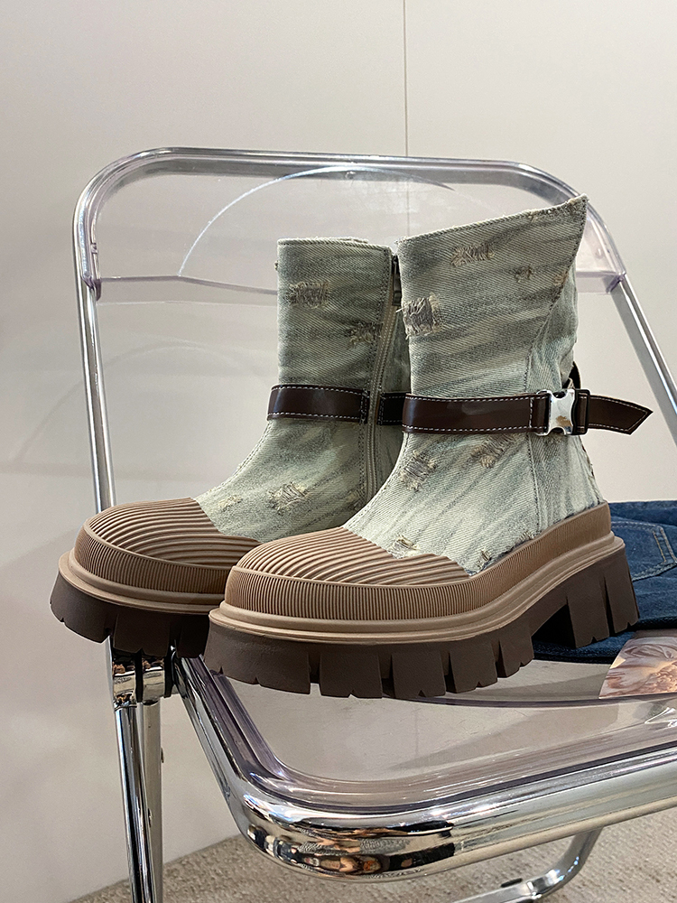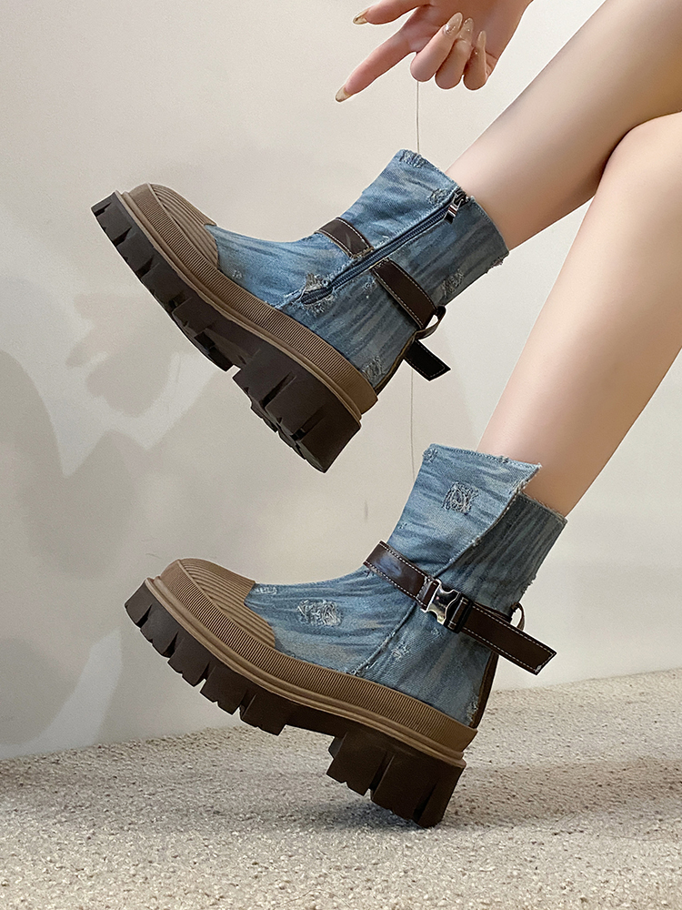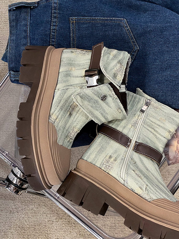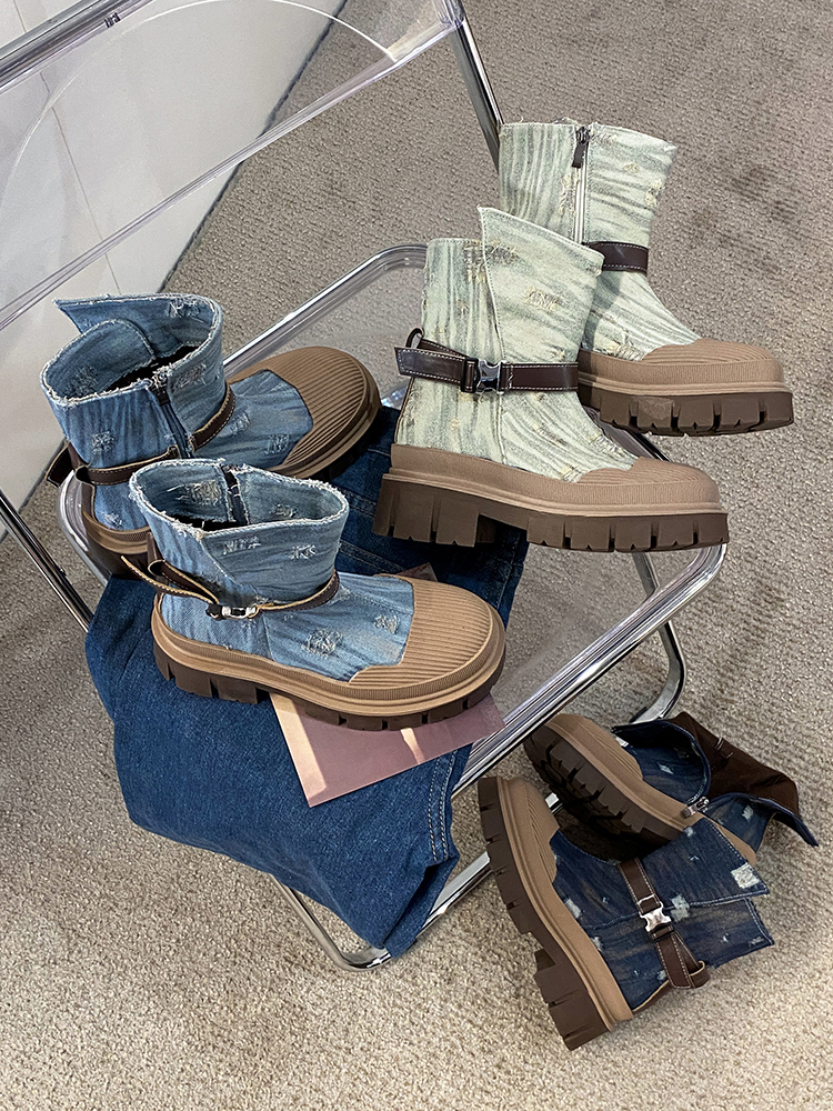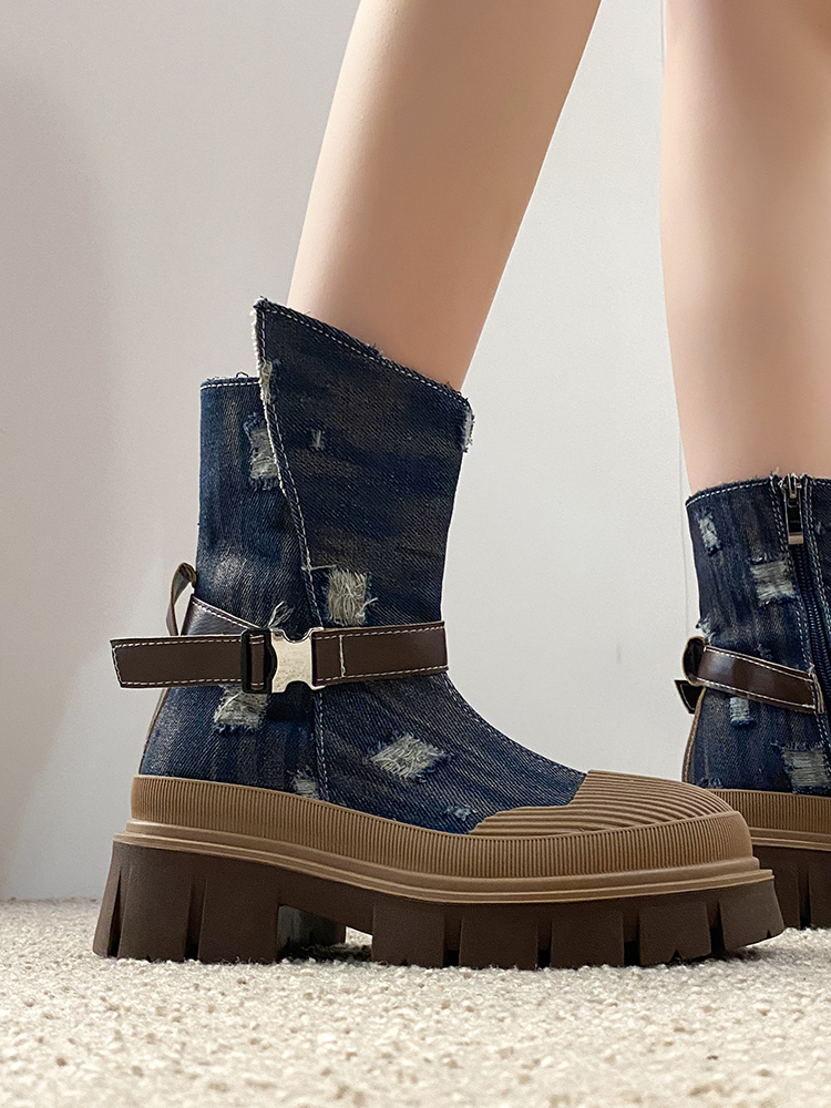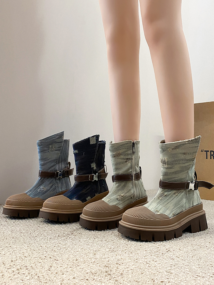 率性側扣拉鍊騎士刷破造型牛仔靴-3色(08H4508)