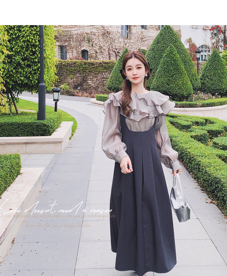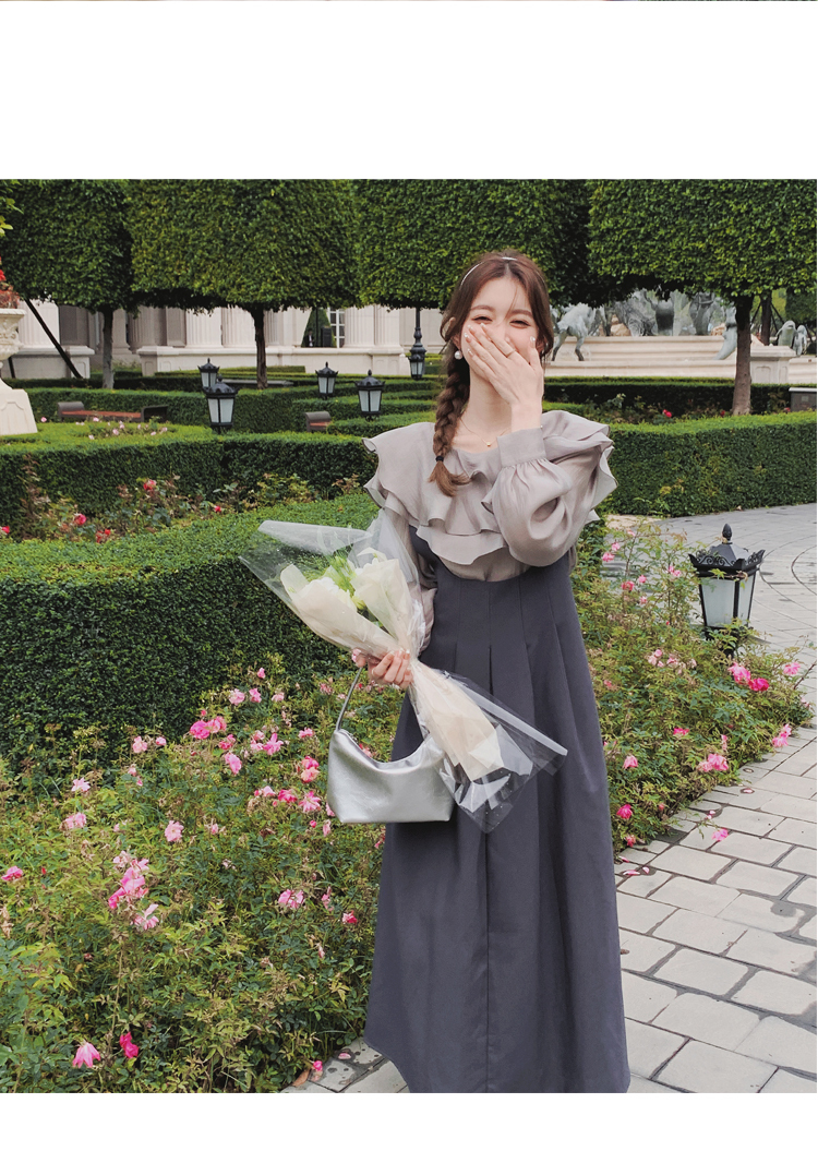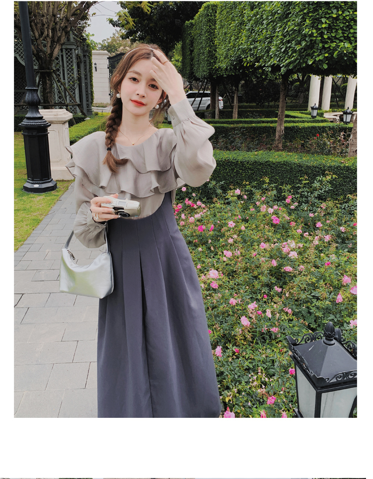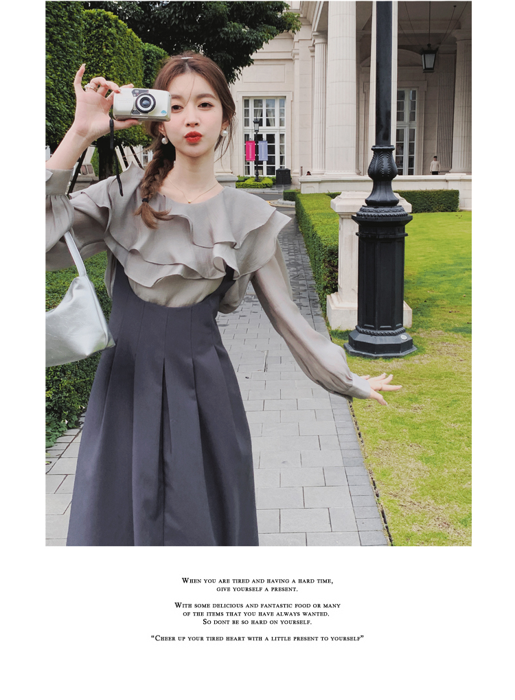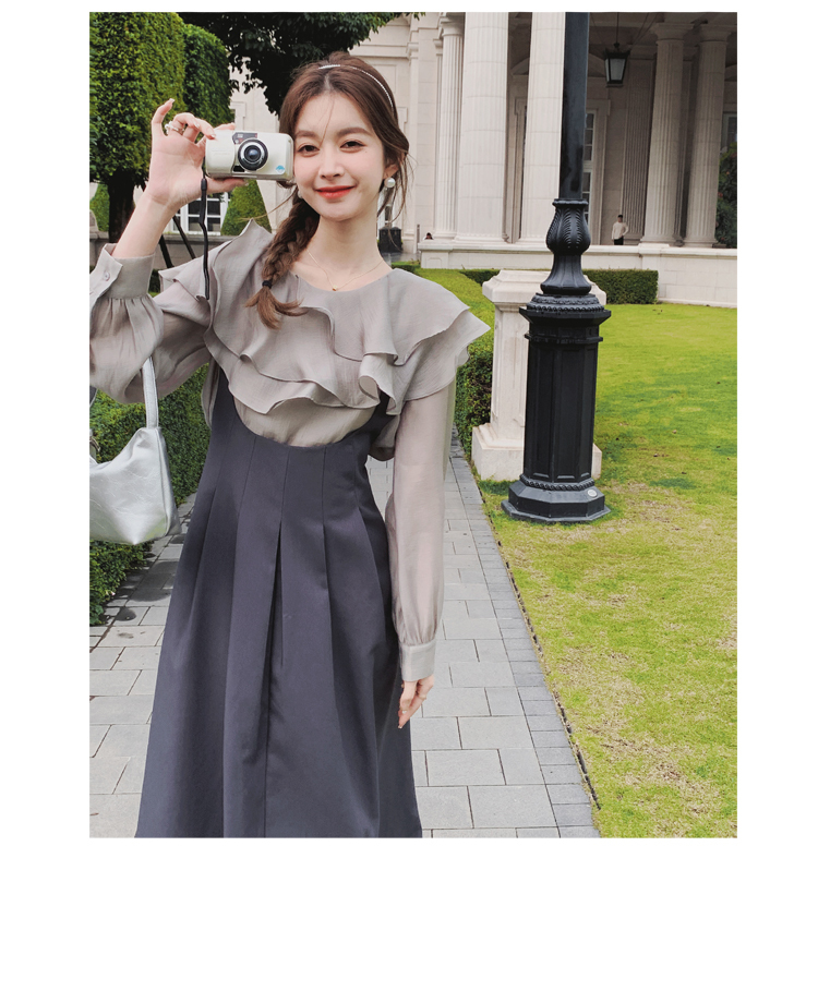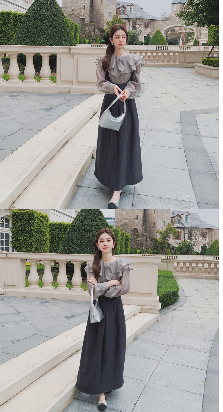 獨家訂製│韓系氣質感荷葉邊雪紡衫+收腰吊帶裙兩件式套裝組(09H4793)