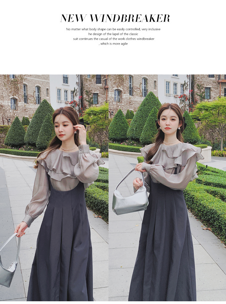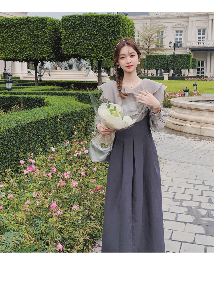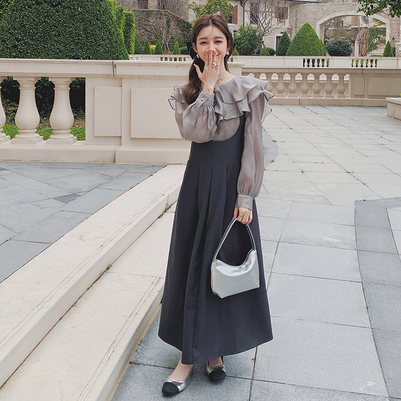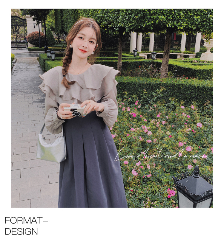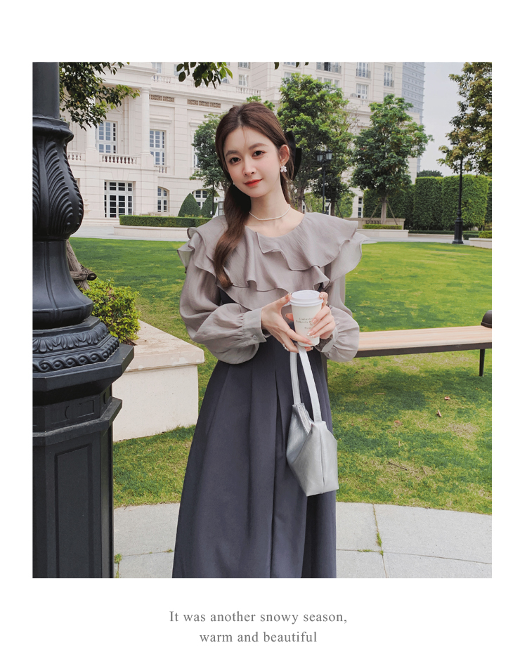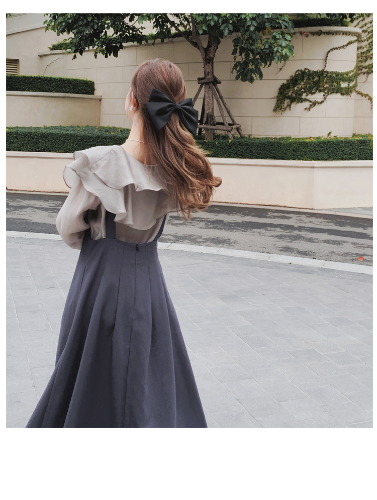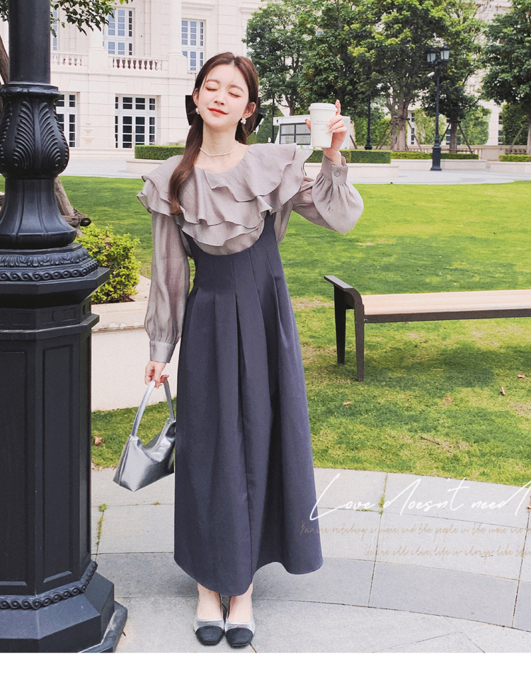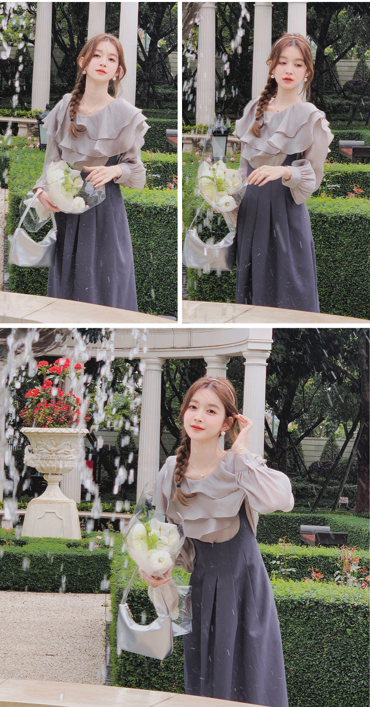 獨家訂製│韓系氣質感荷葉邊雪紡衫+收腰吊帶裙兩件式套裝組(09H4793)