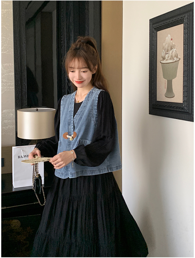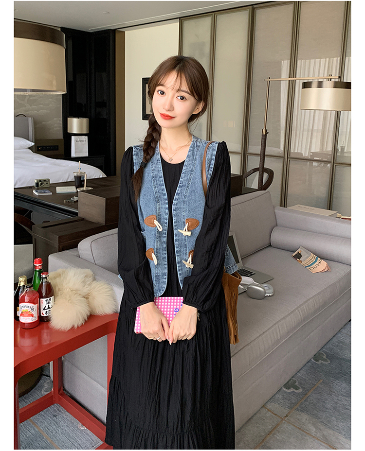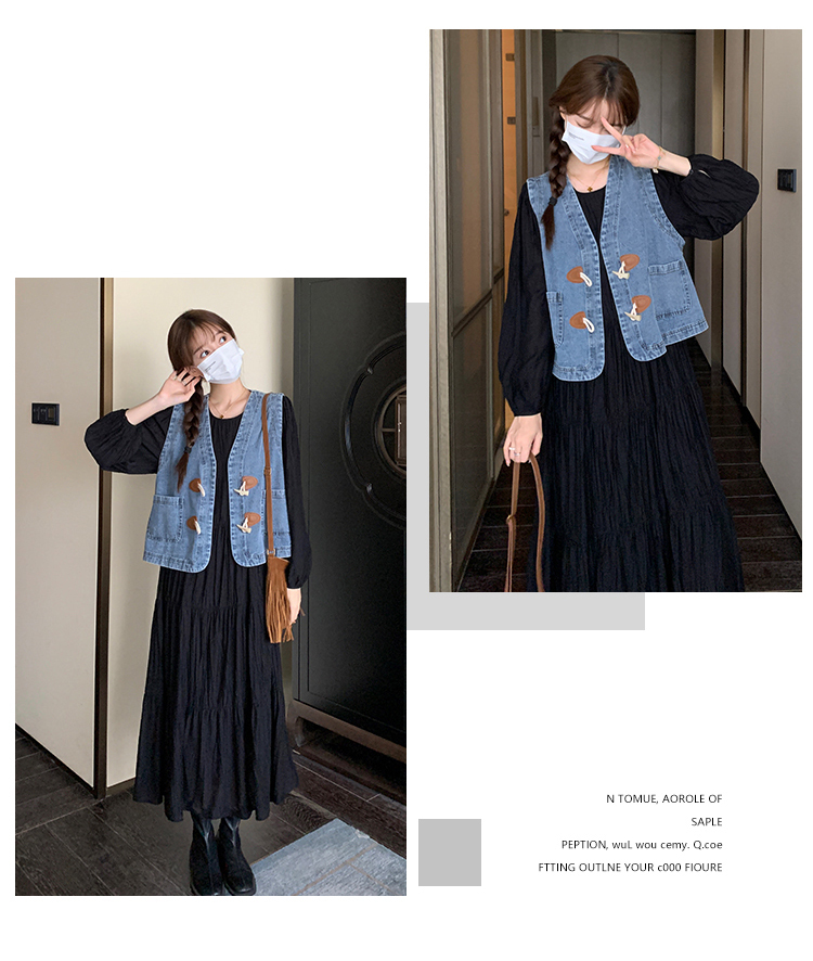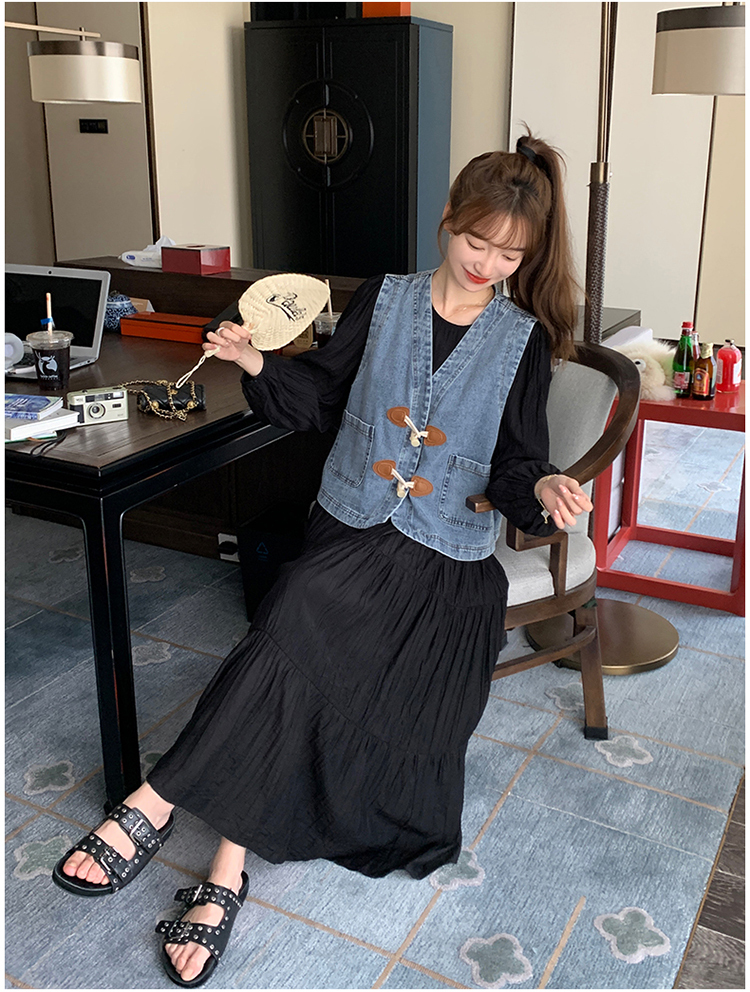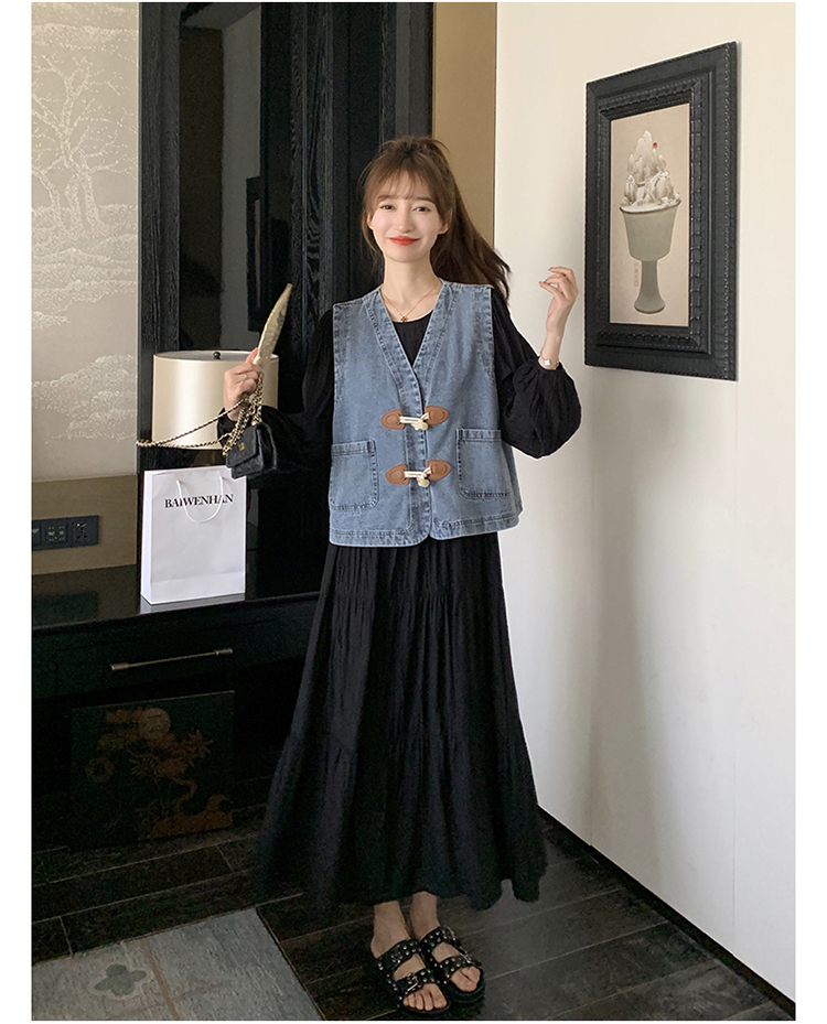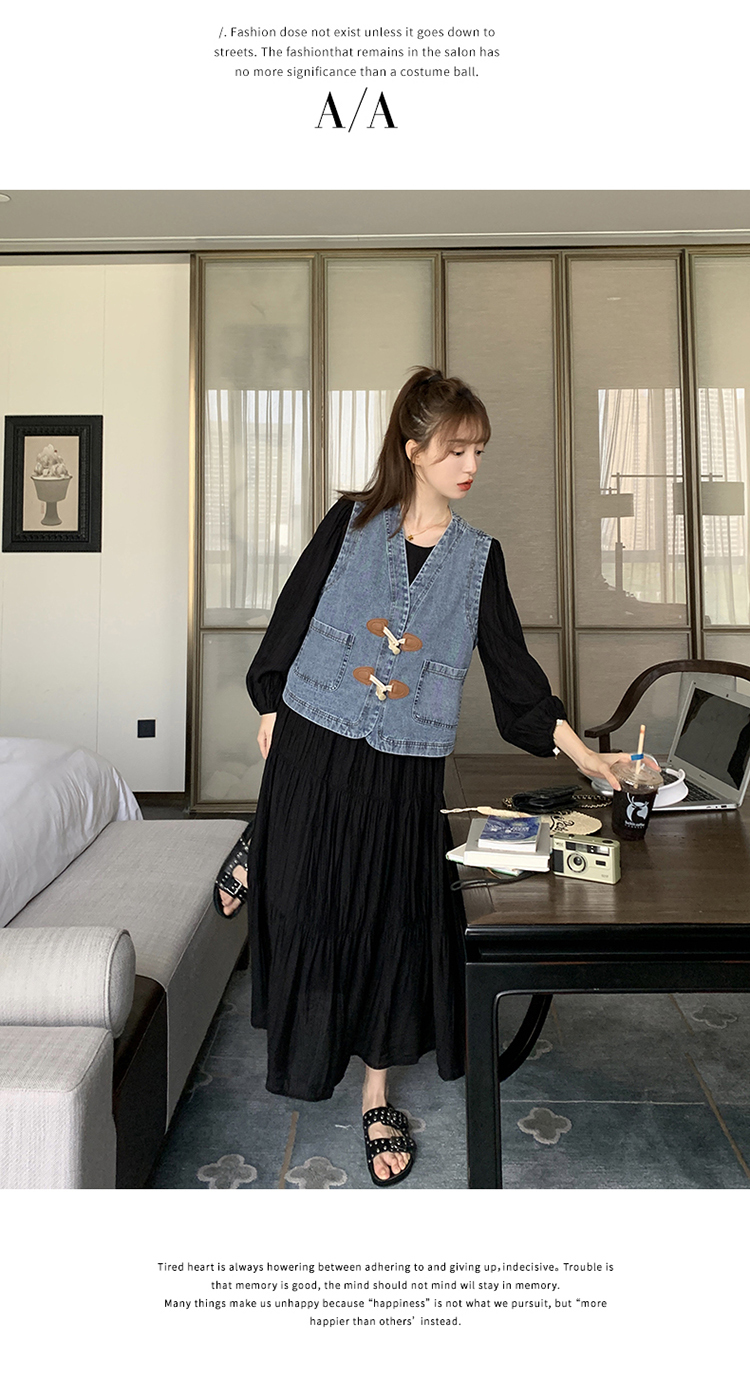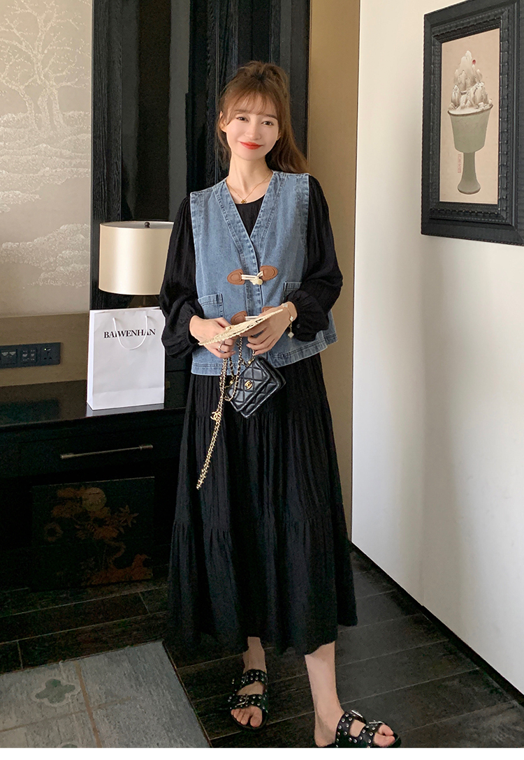獨家訂製│韓系氣質感盤扣牛仔背心+抓褶雪紡連衣裙兩件式套裝組(09H4804)
