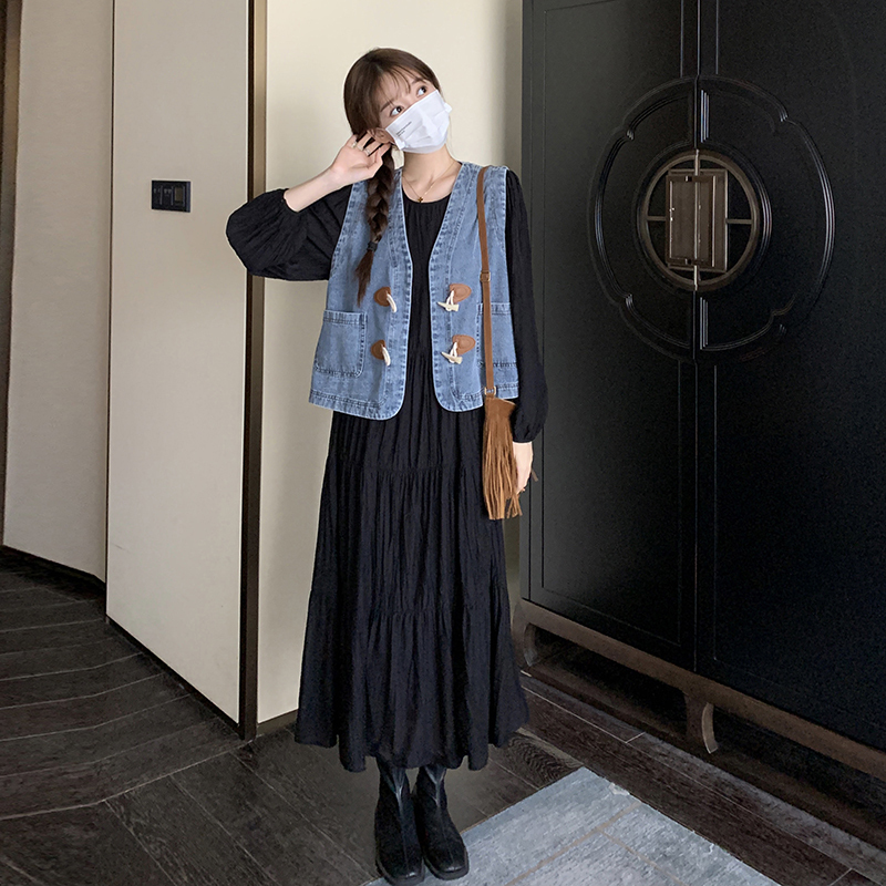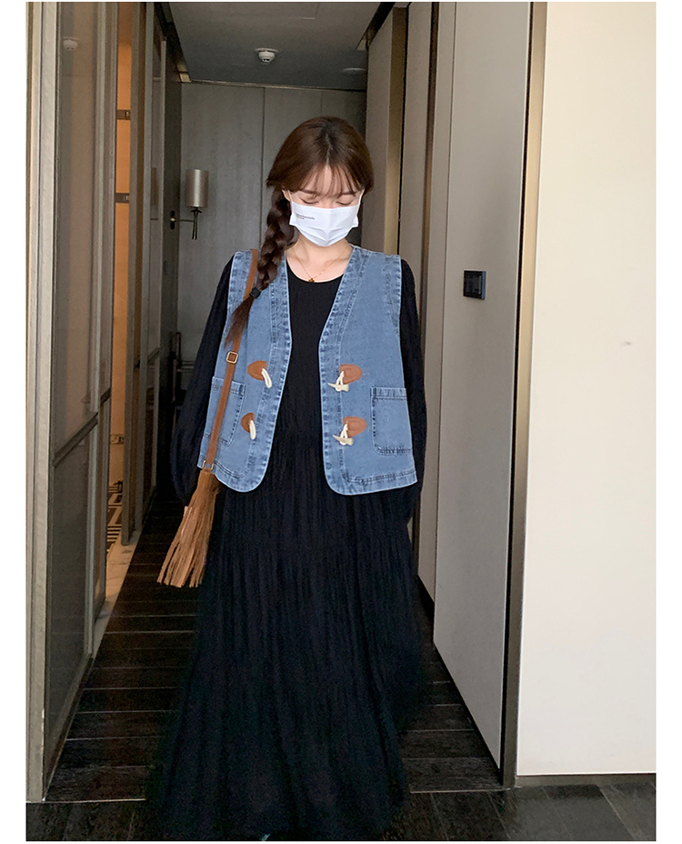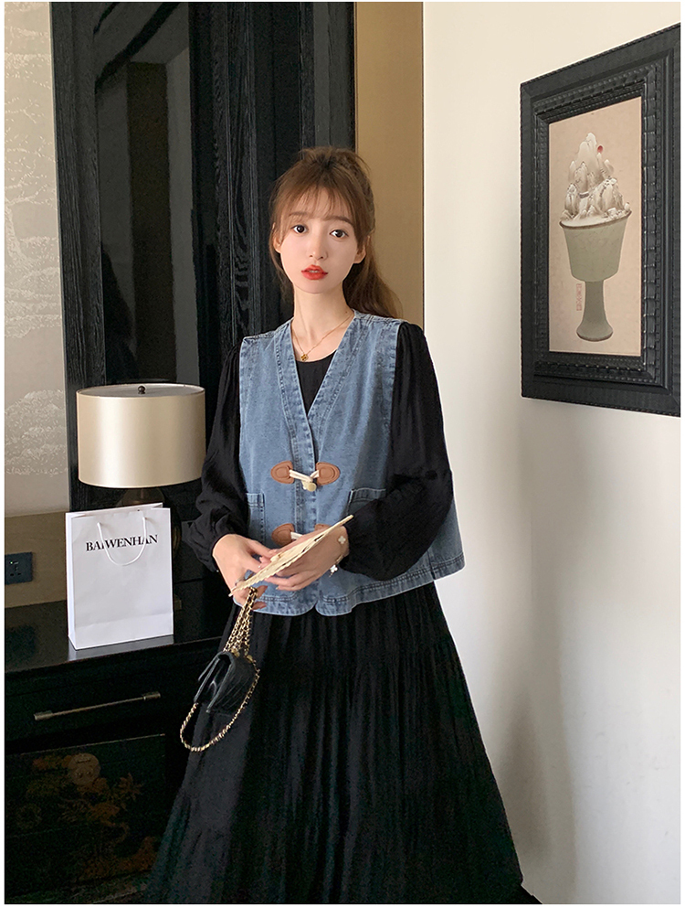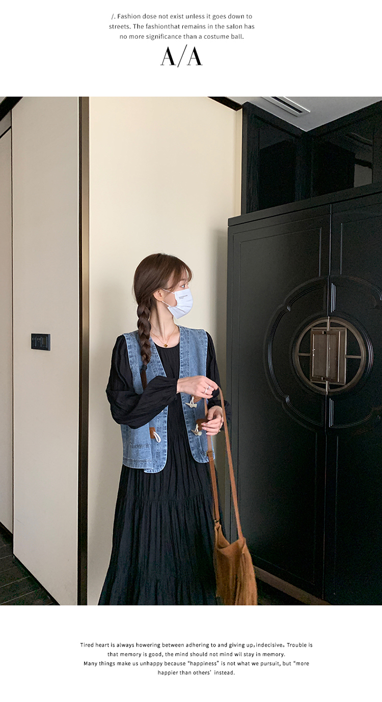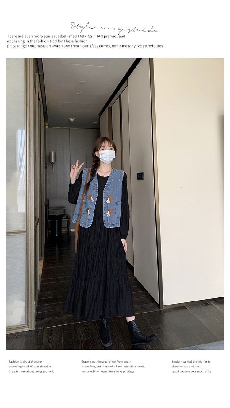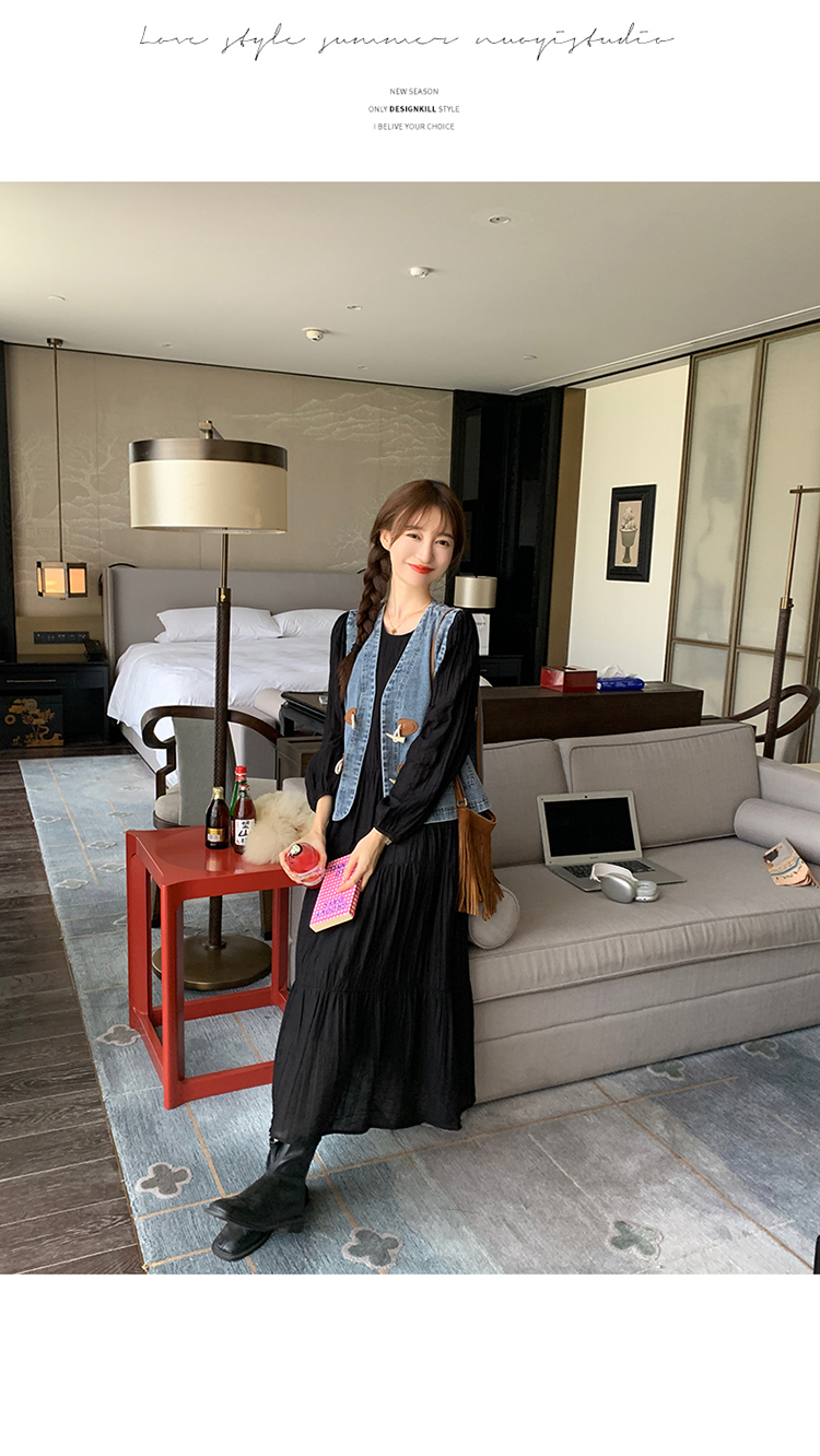獨家訂製│韓系氣質感盤扣牛仔背心+抓褶雪紡連衣裙兩件式套裝組(09H4804)