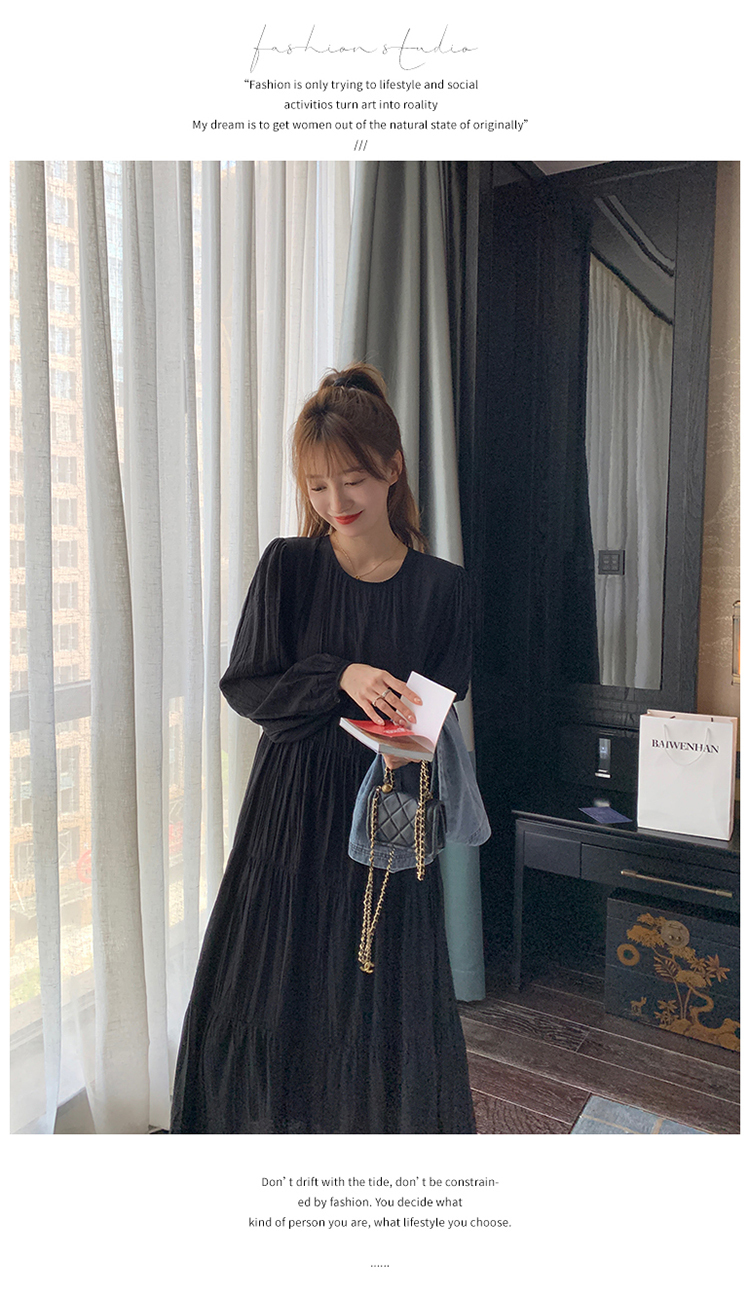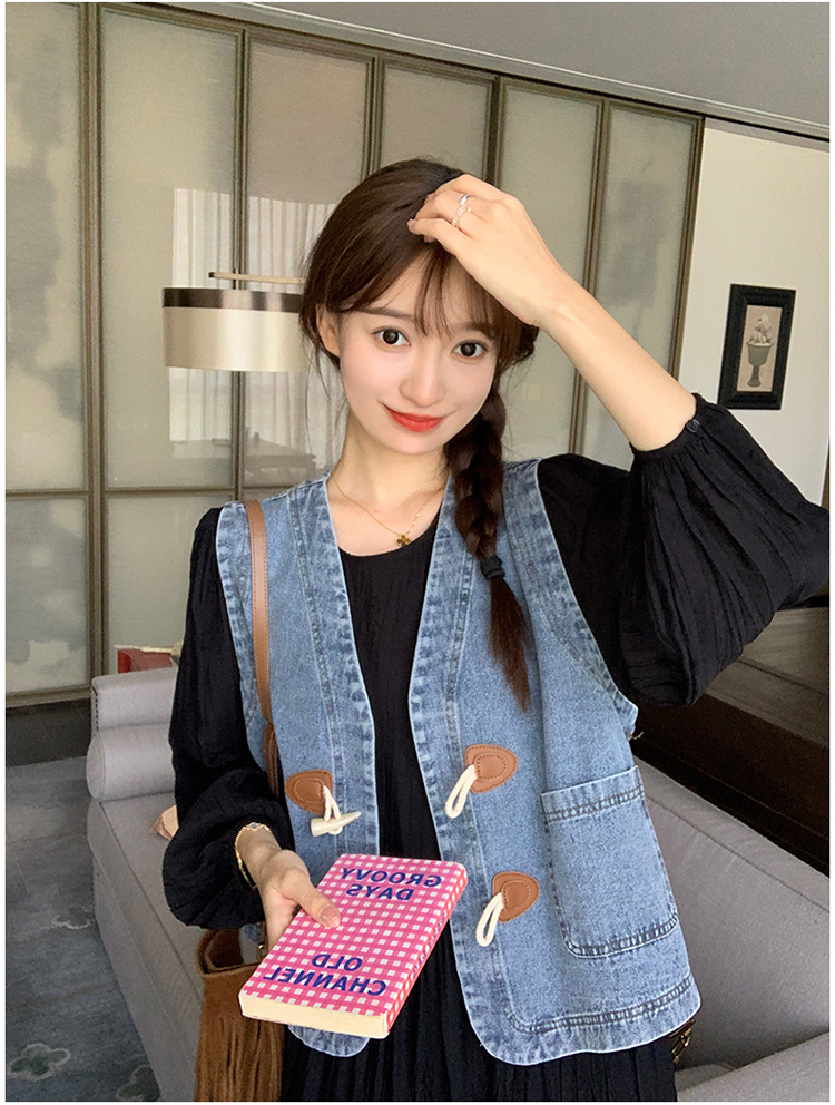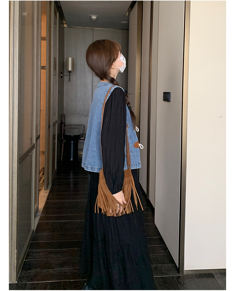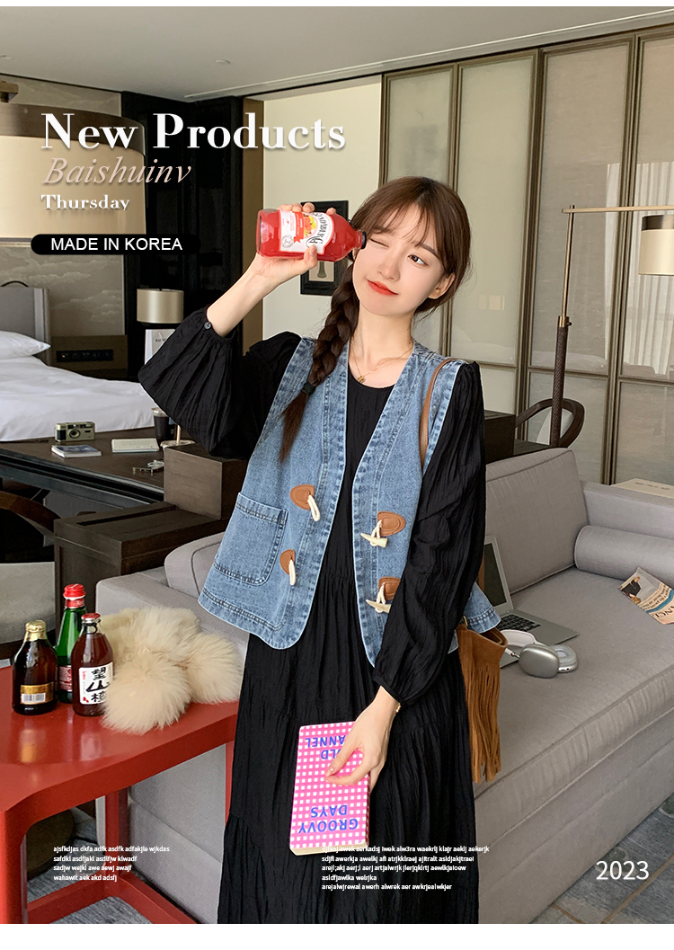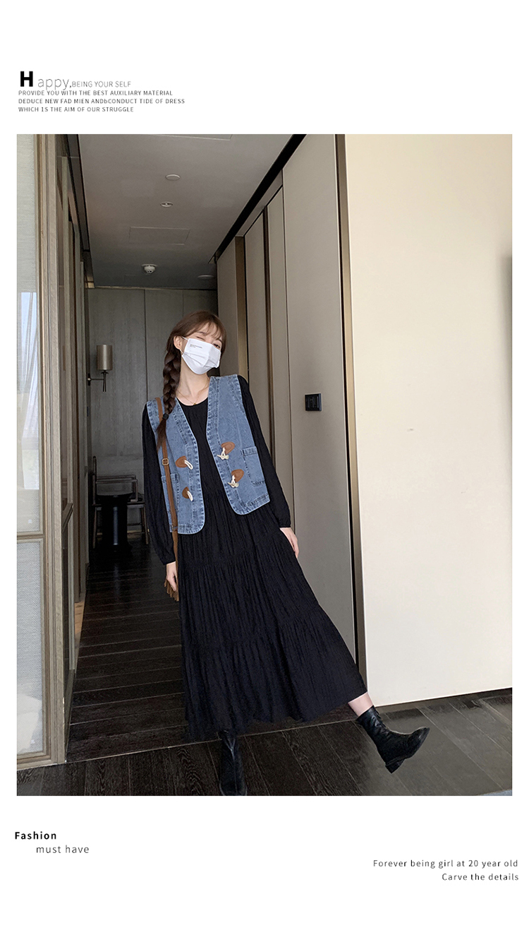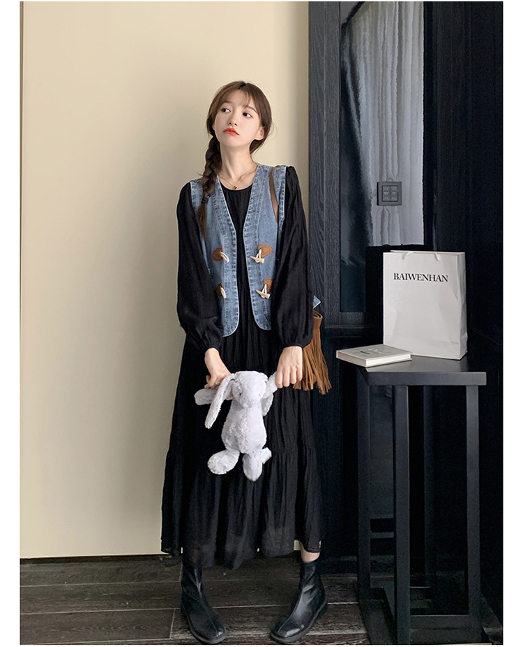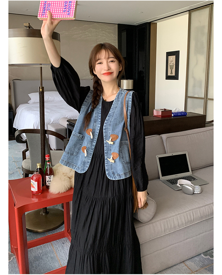 獨家訂製│韓系氣質感盤扣牛仔背心+抓褶雪紡連衣裙兩件式套裝組(09H4804)