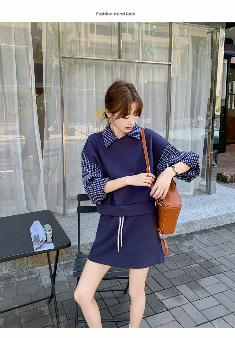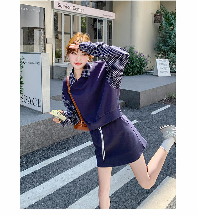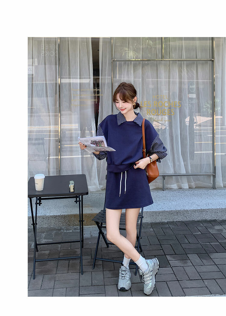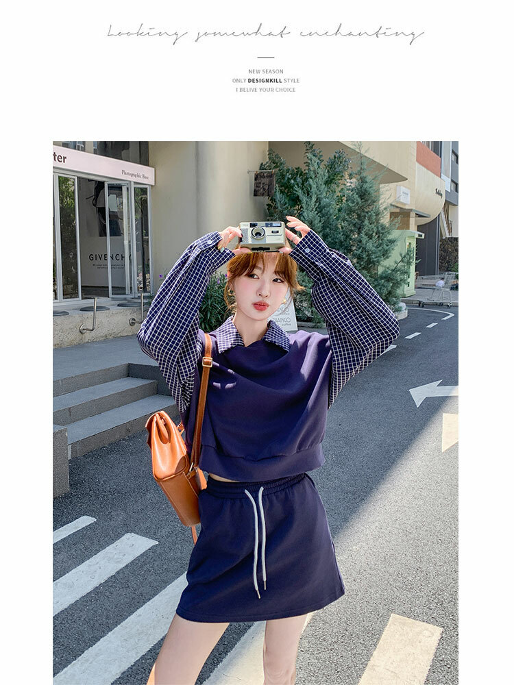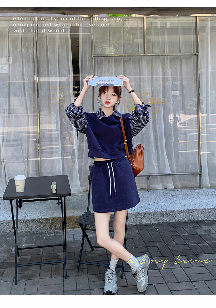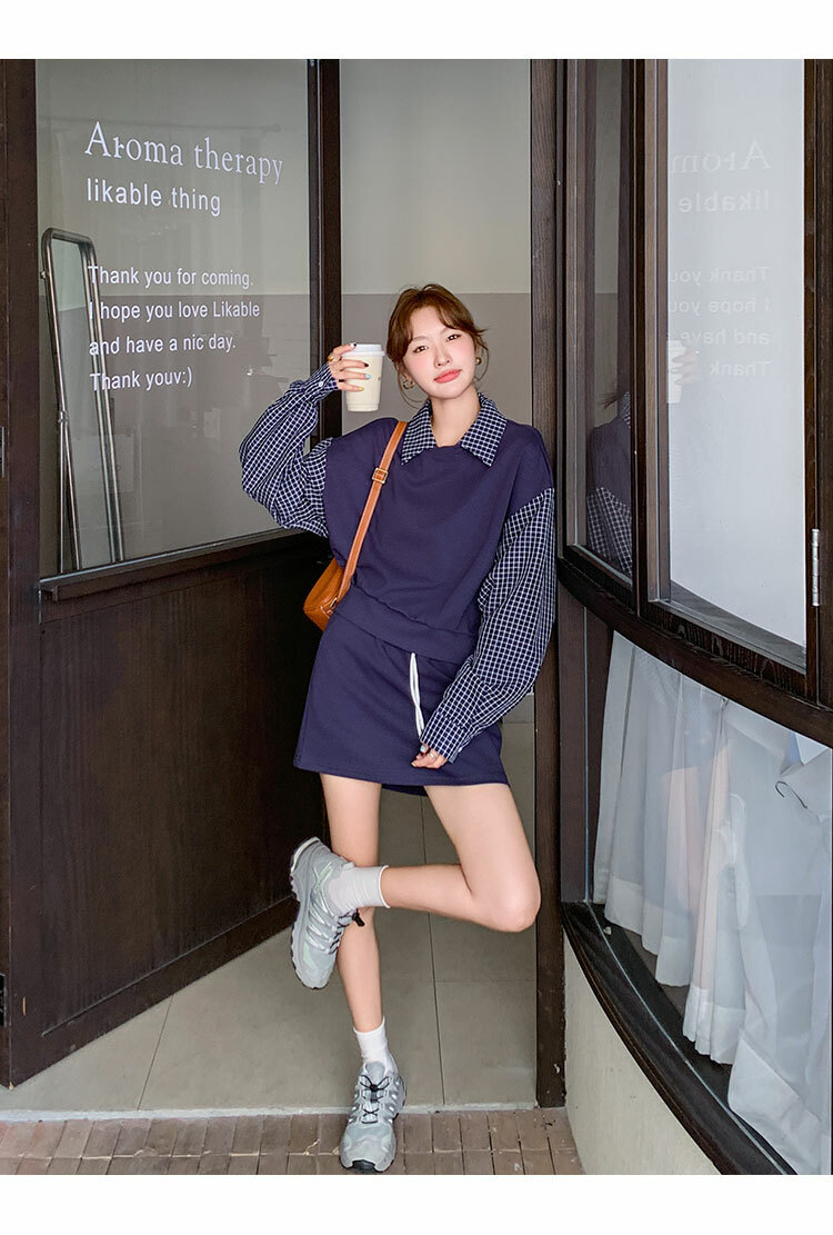 獨家訂製│2件式 韓系甜酷風拼接格紋翻領T恤+A字裙(10H6919)
