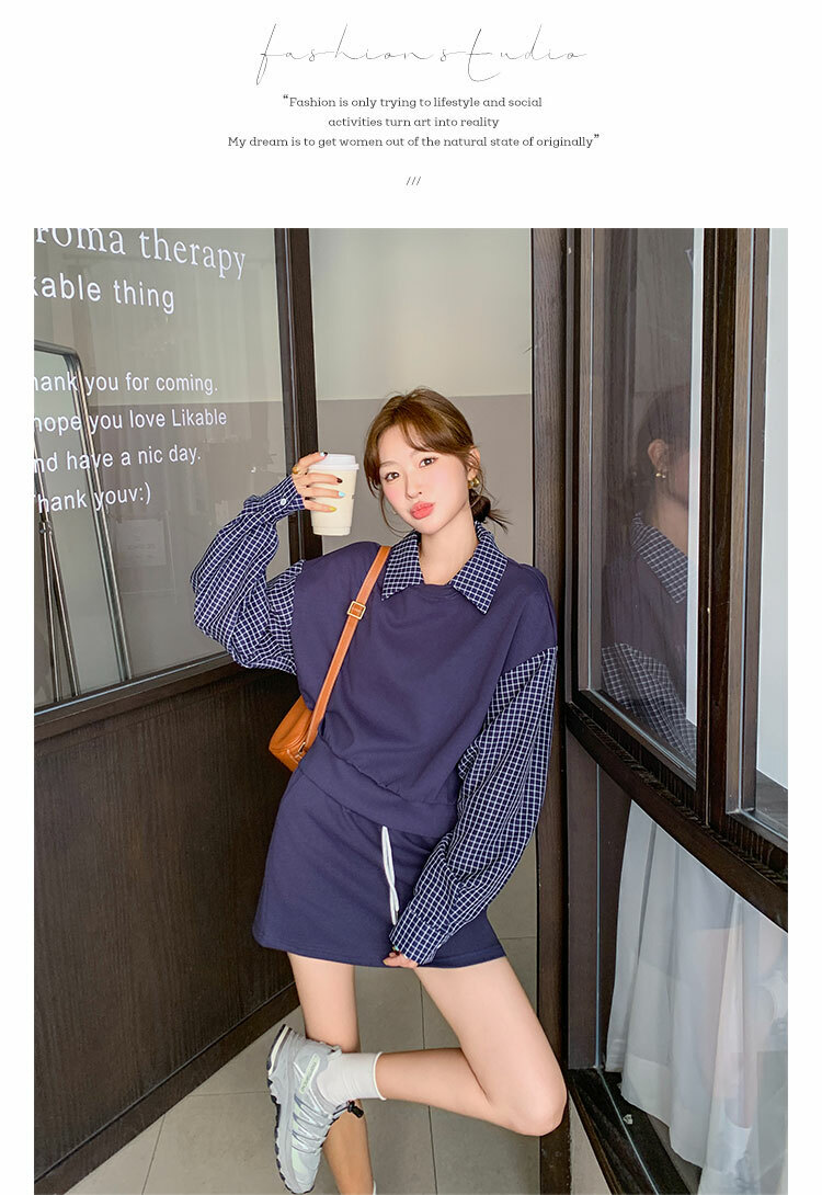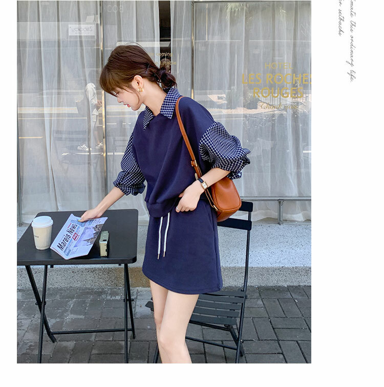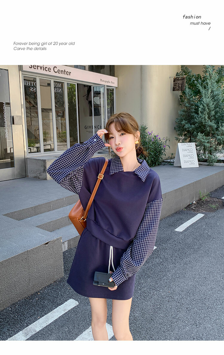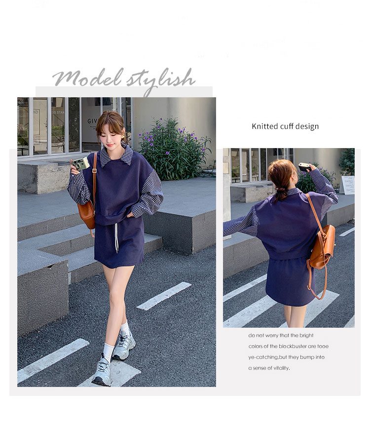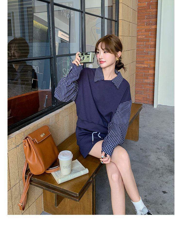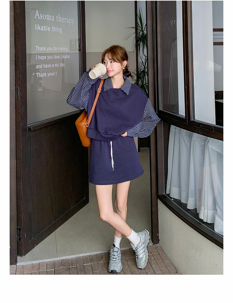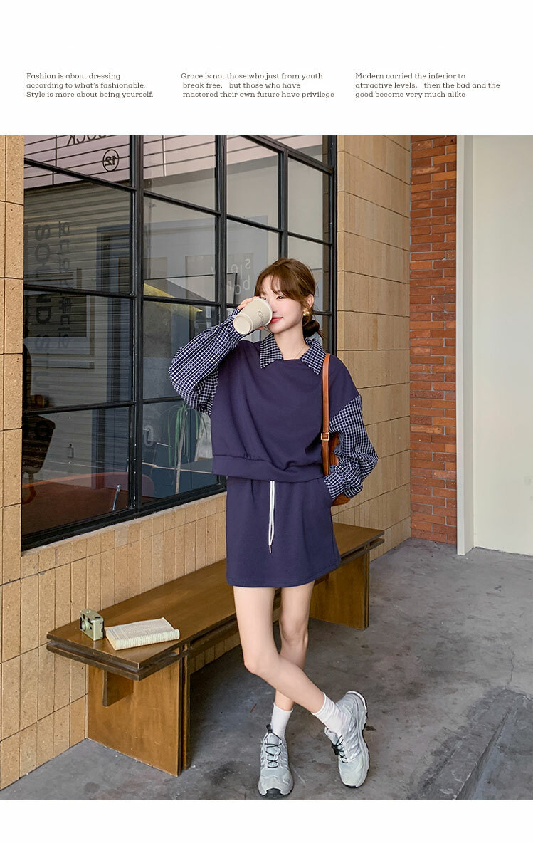 獨家訂製│2件式 韓系甜酷風拼接格紋翻領T恤+A字裙(10H6919)