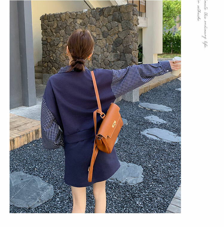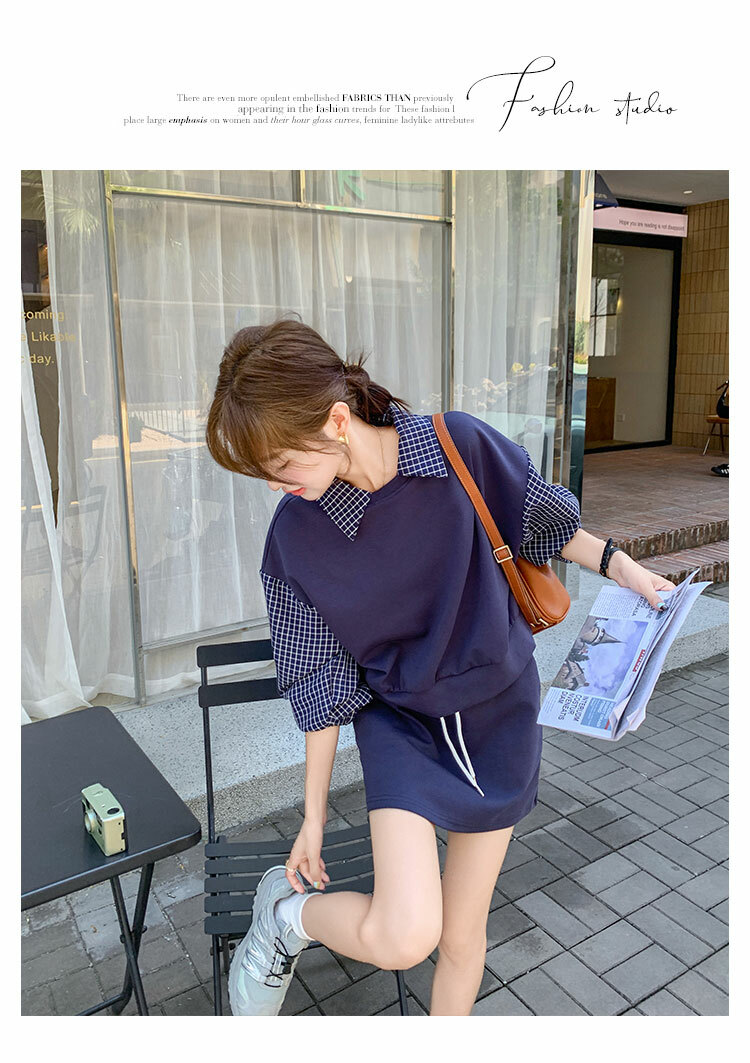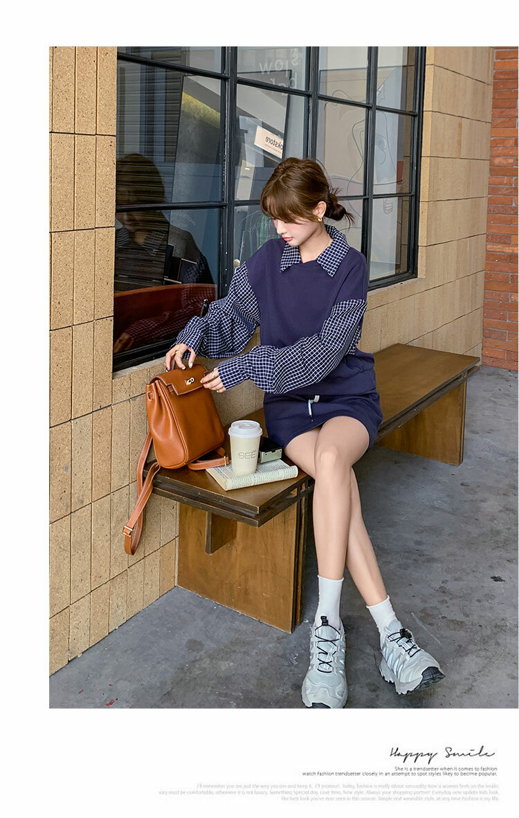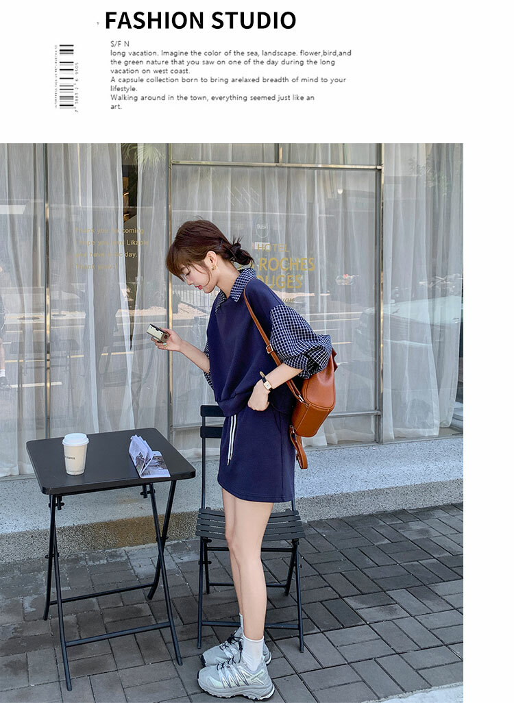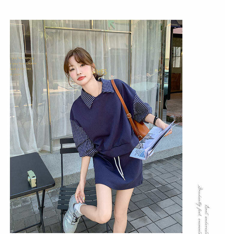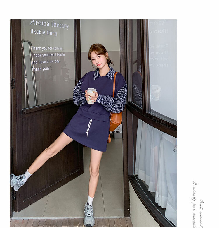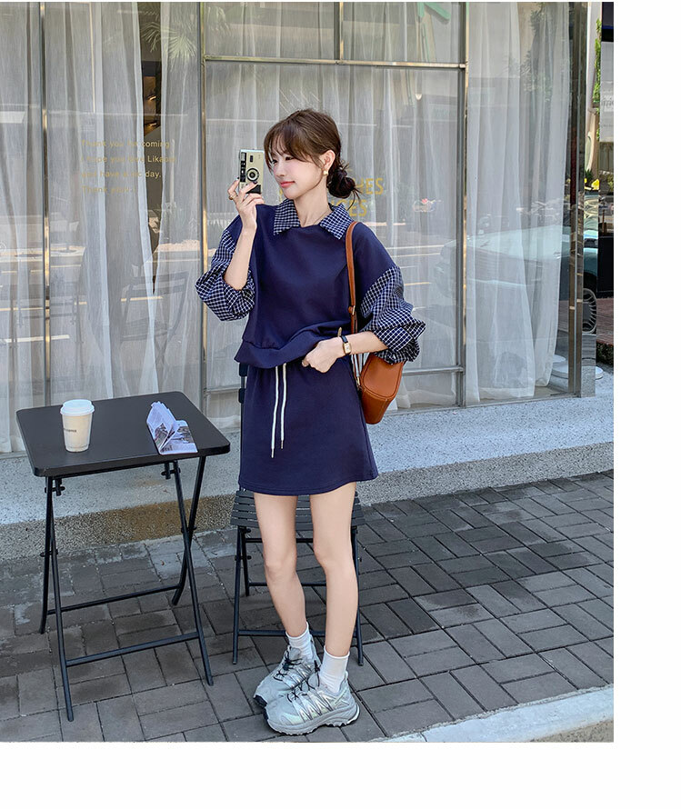 獨家訂製│2件式 韓系甜酷風拼接格紋翻領T恤+A字裙(10H6919)