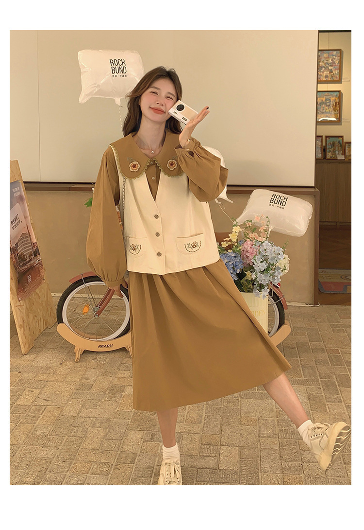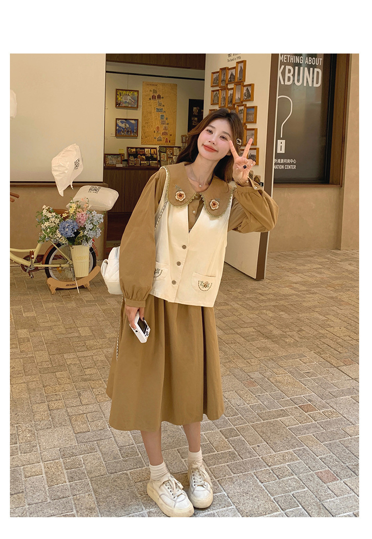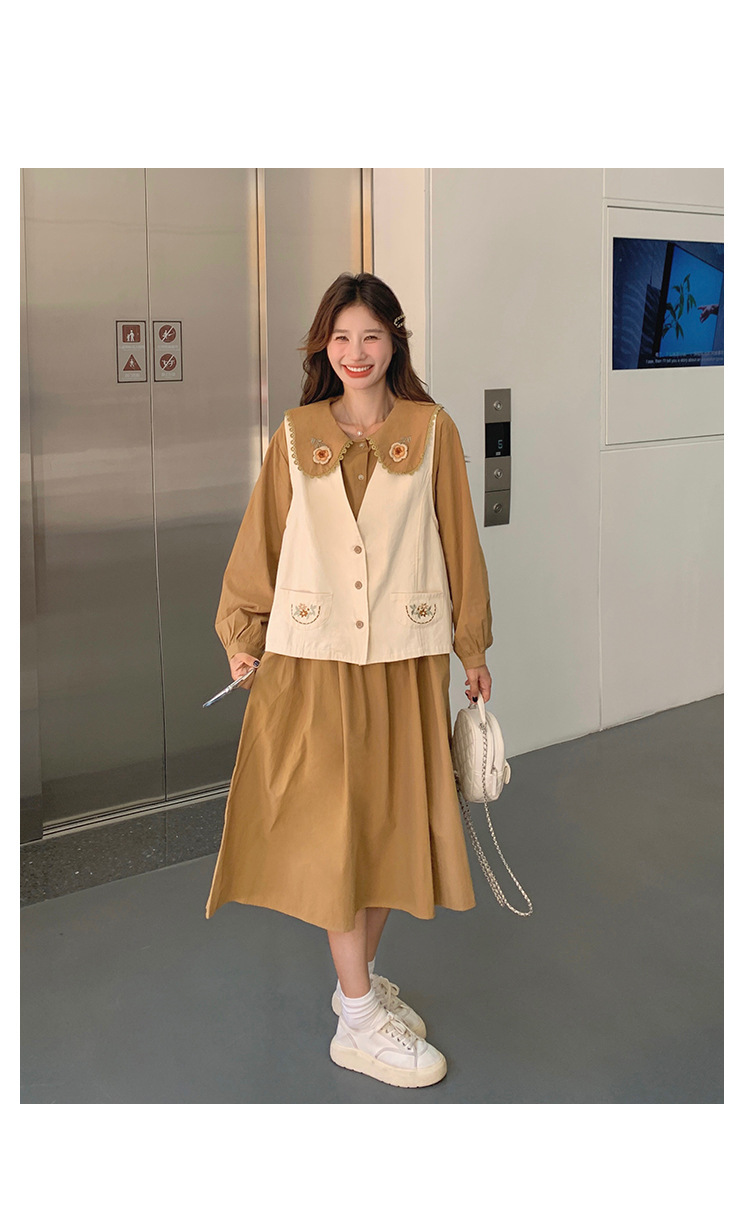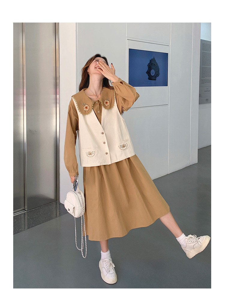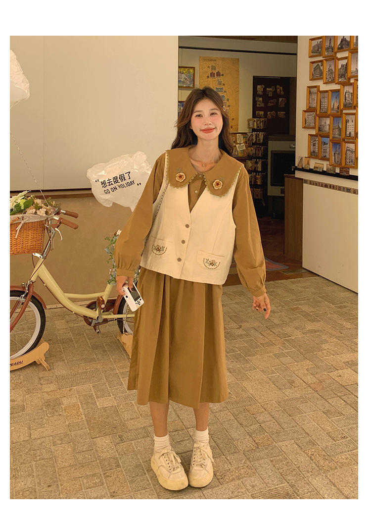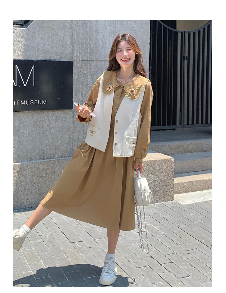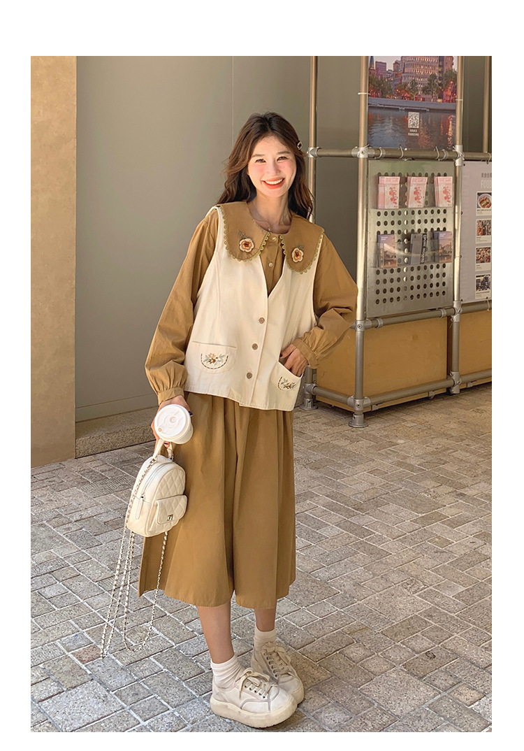 獨家訂製│2件式 韓系減齡感刺繡背心+花邊翻領收腰連衣裙(10H6923)