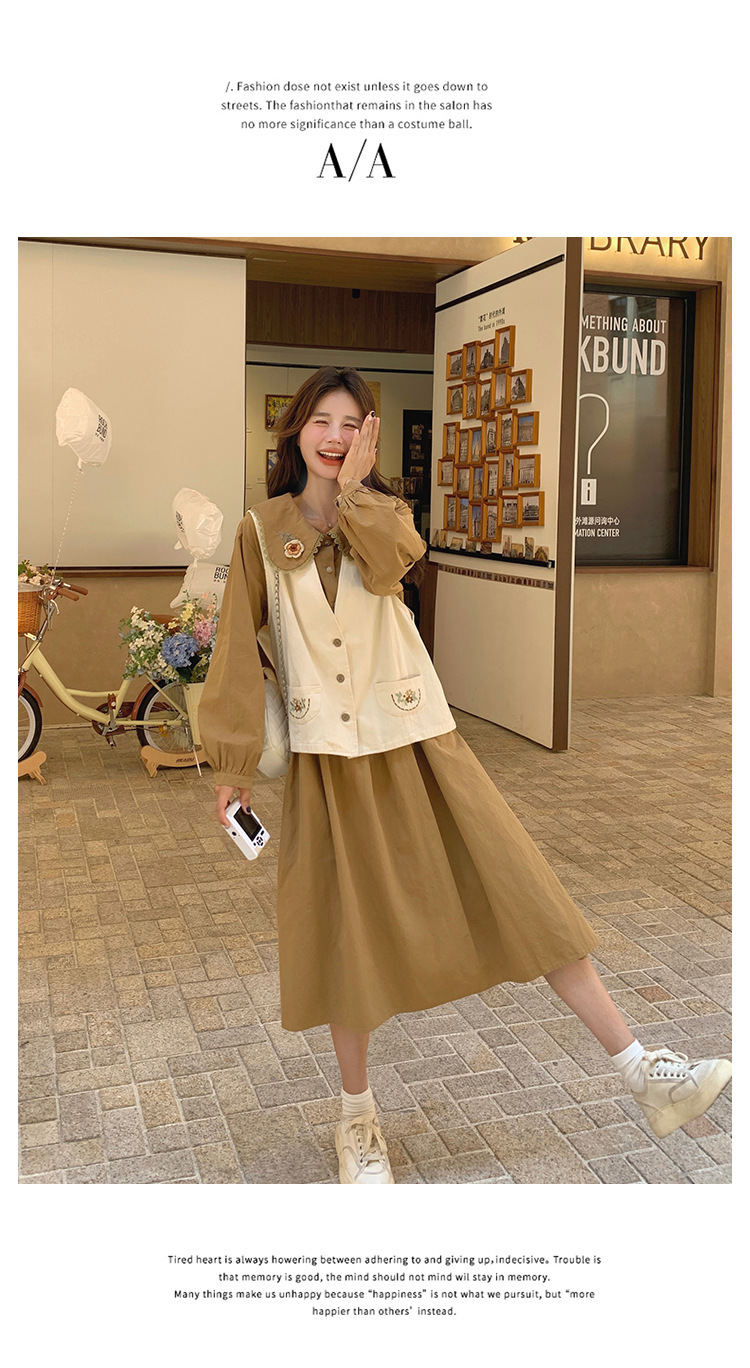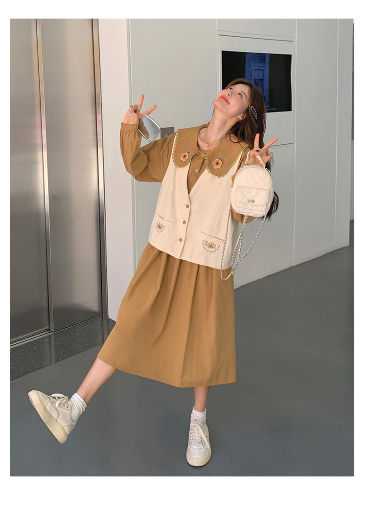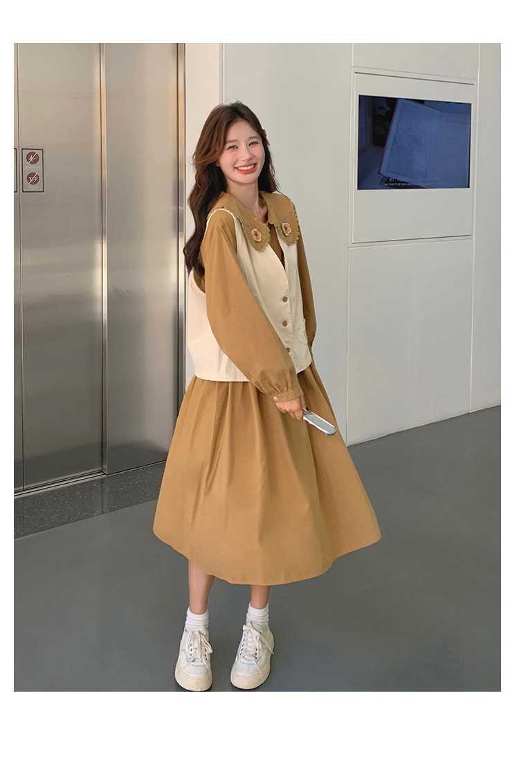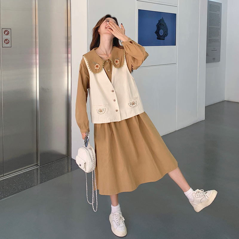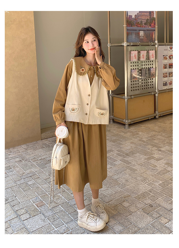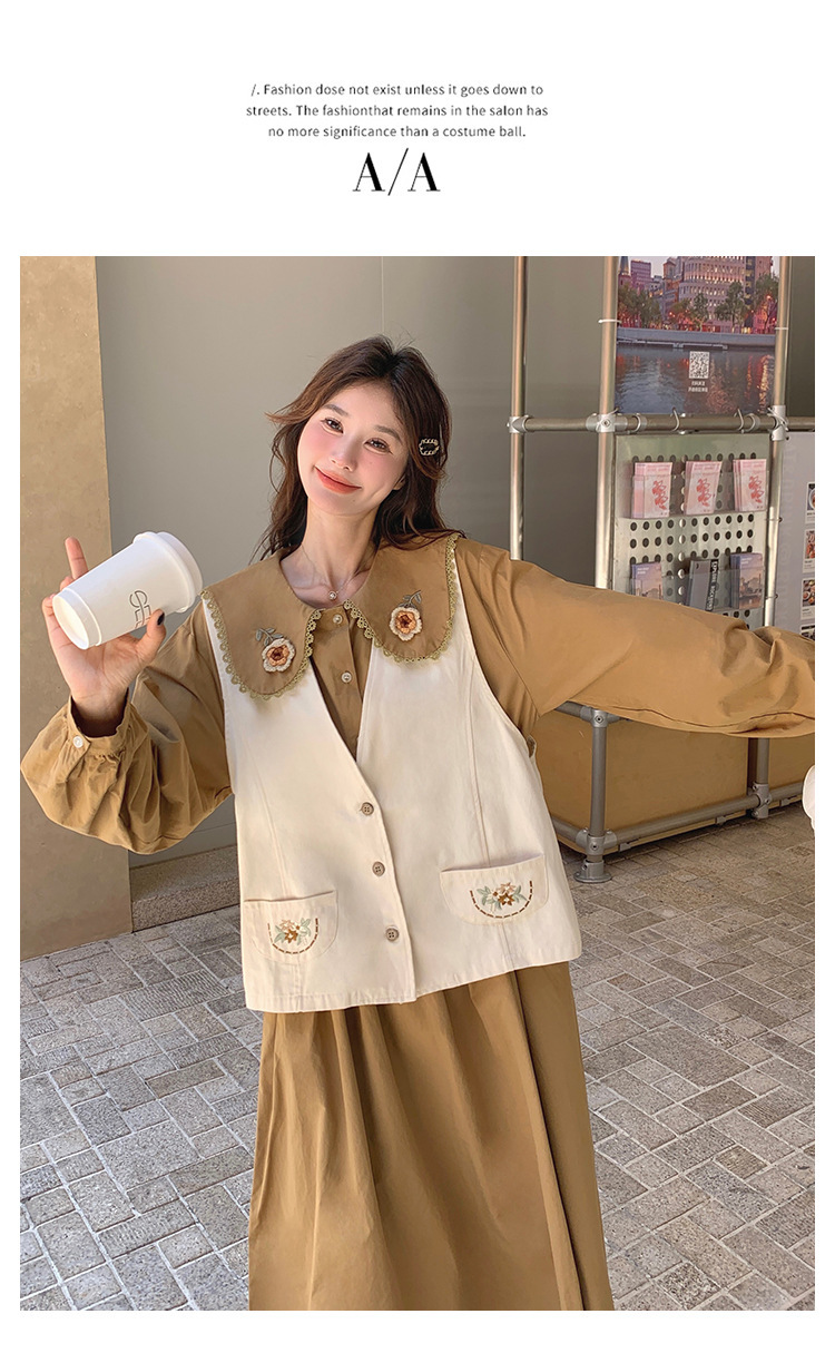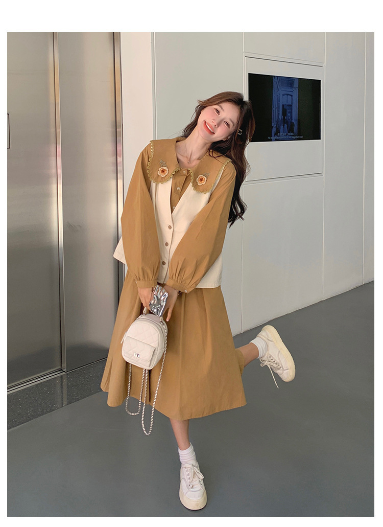 獨家訂製│2件式 韓系減齡感刺繡背心+花邊翻領收腰連衣裙(10H6923)