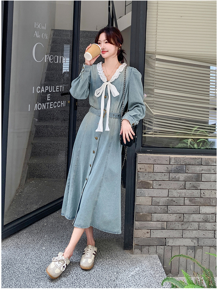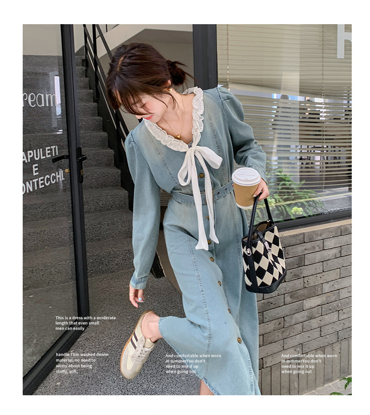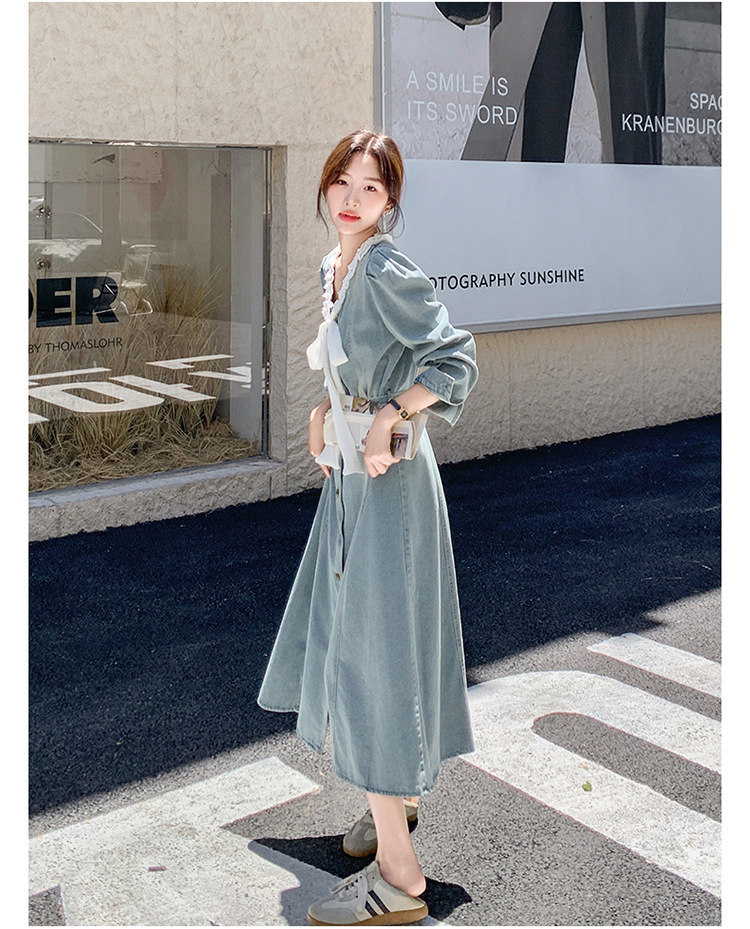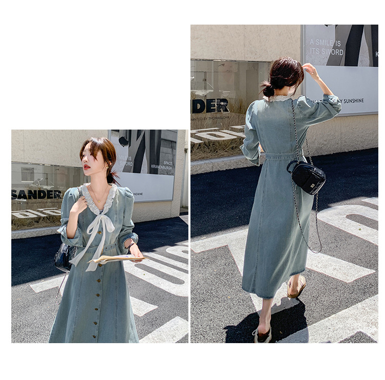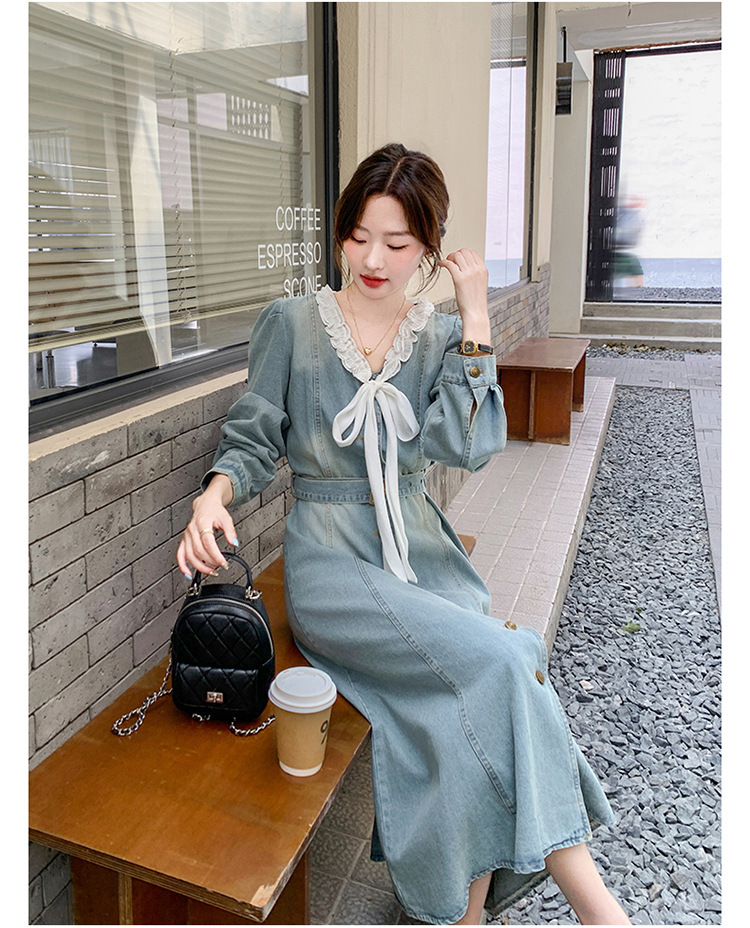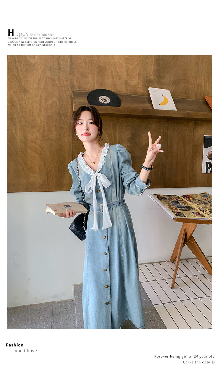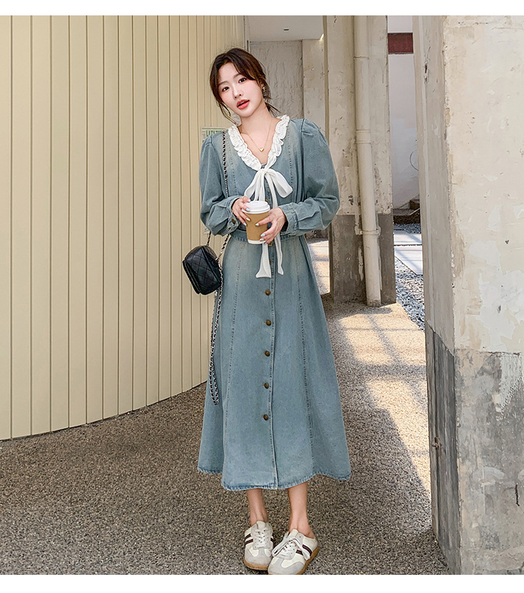 獨家訂製│韓系氣質感V領繫帶拼接收腰牛仔連衣裙(10H6980)