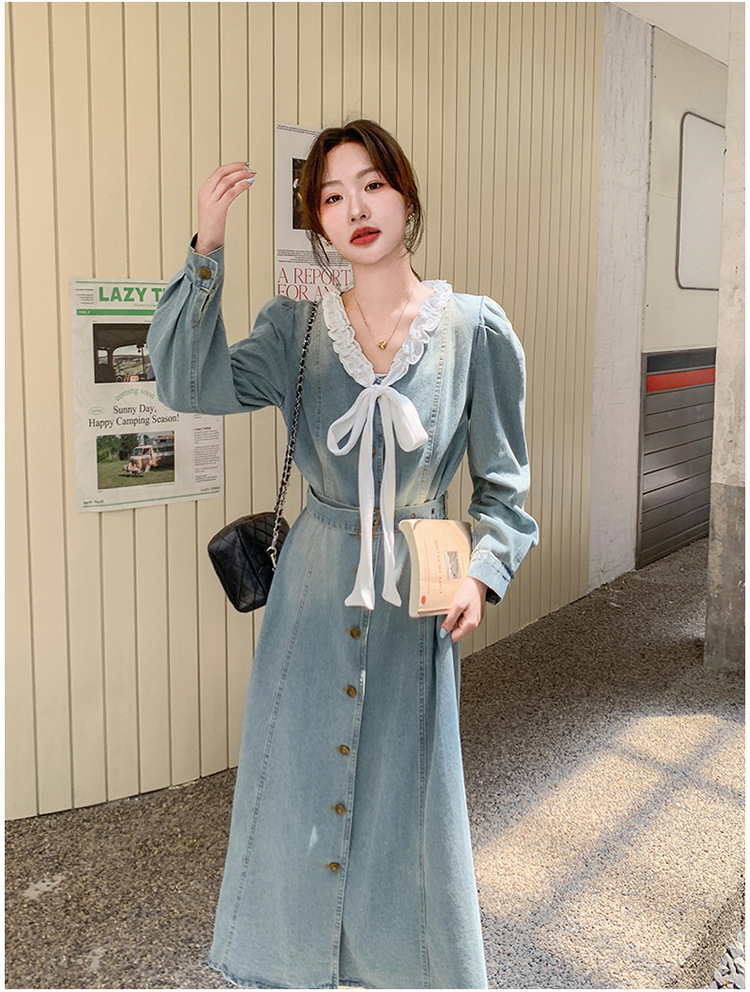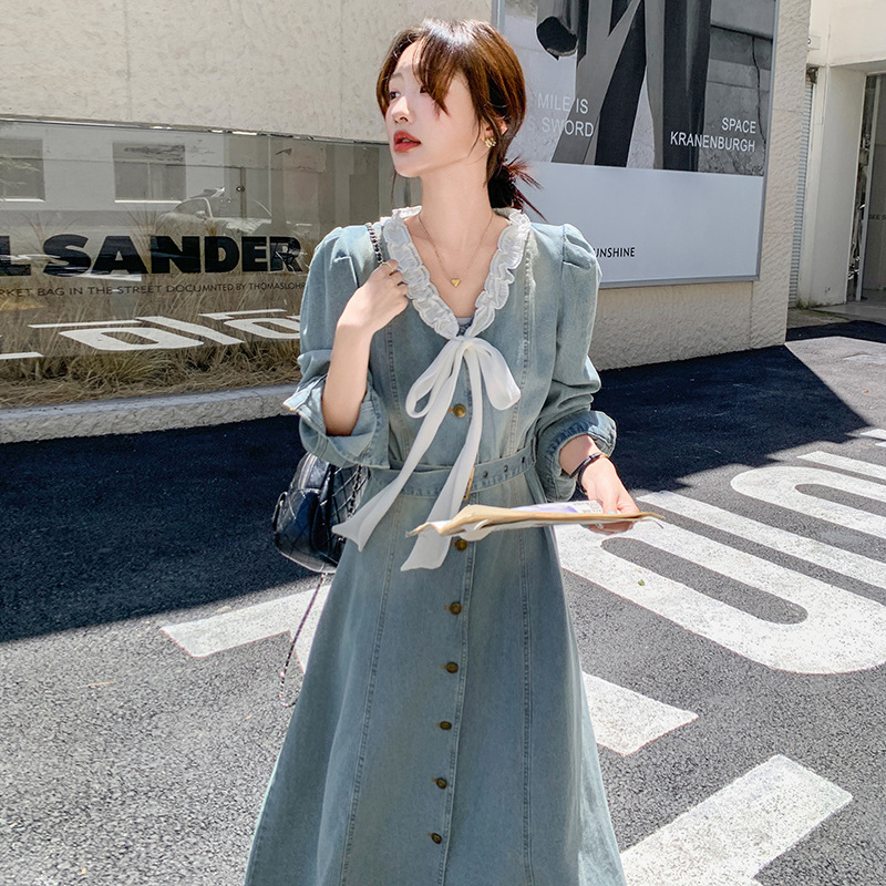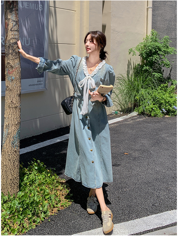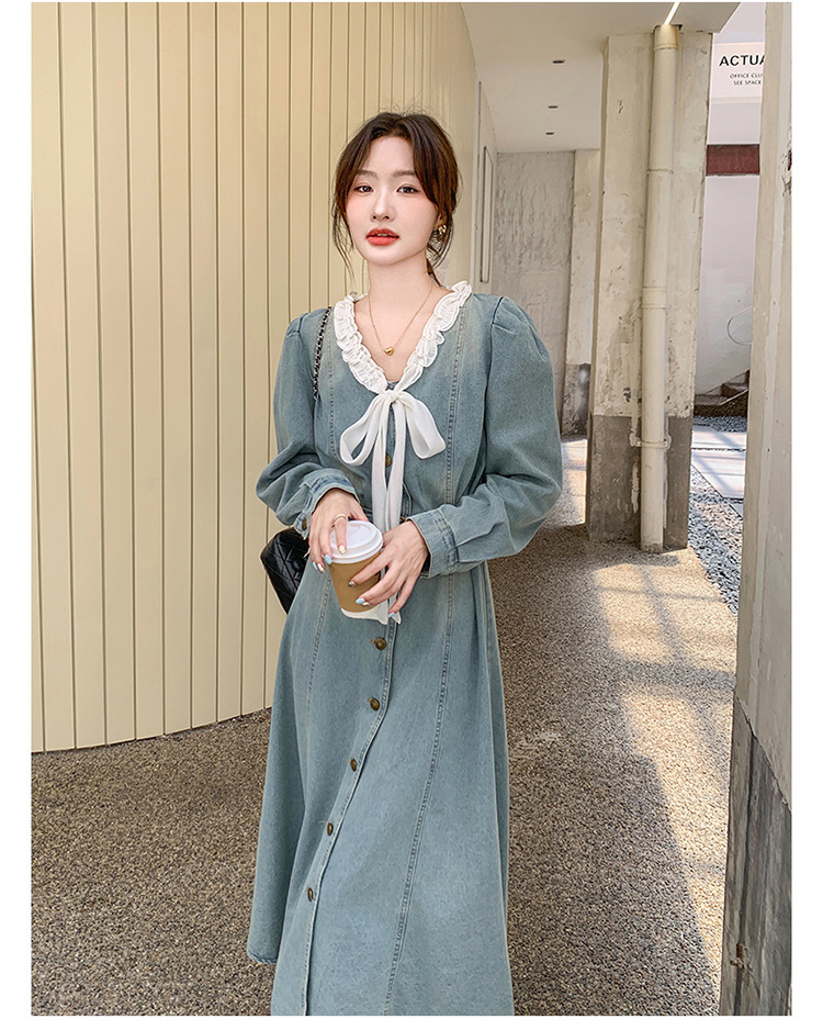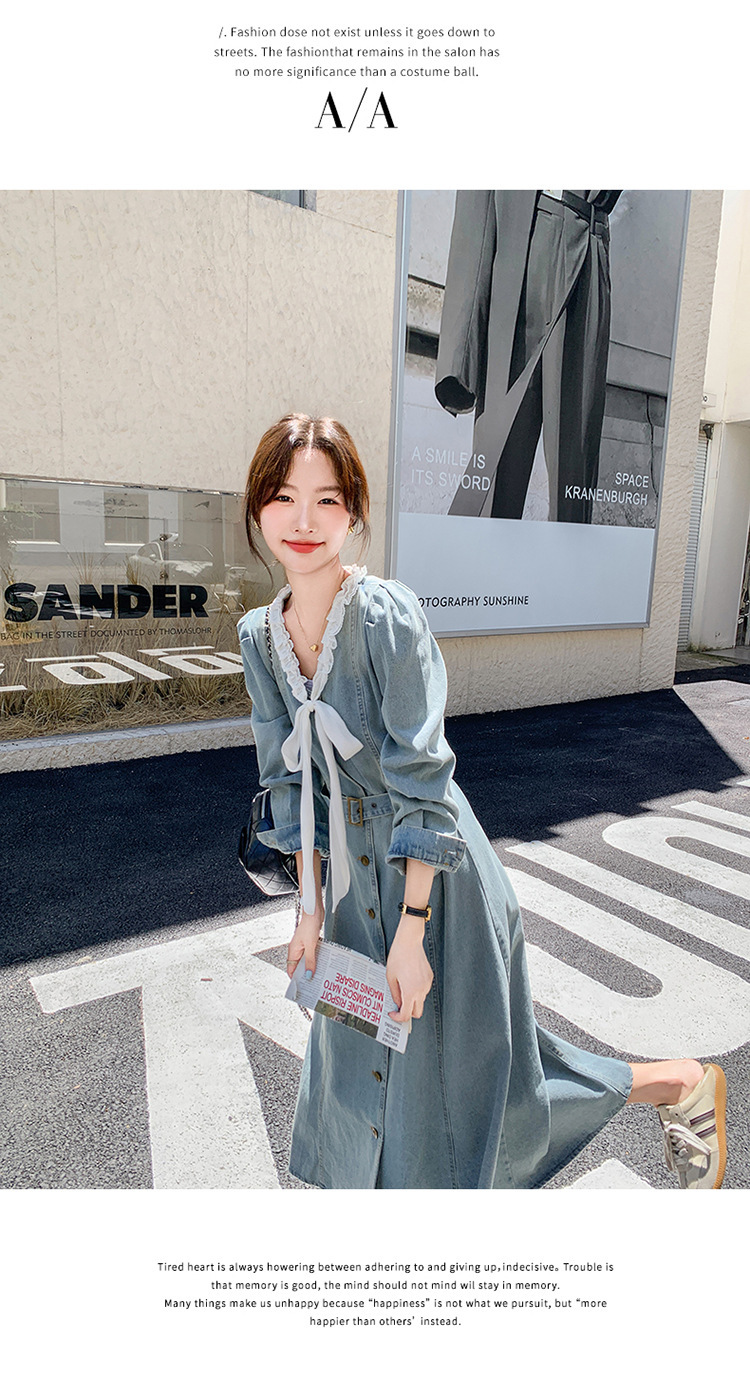 獨家訂製│韓系氣質感V領繫帶拼接收腰牛仔連衣裙(10H6980)