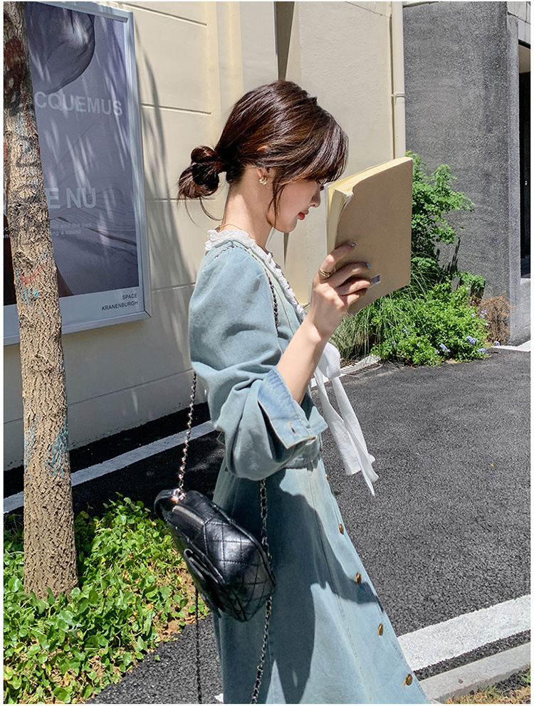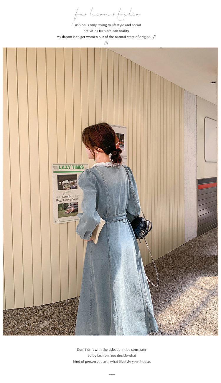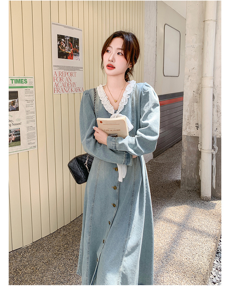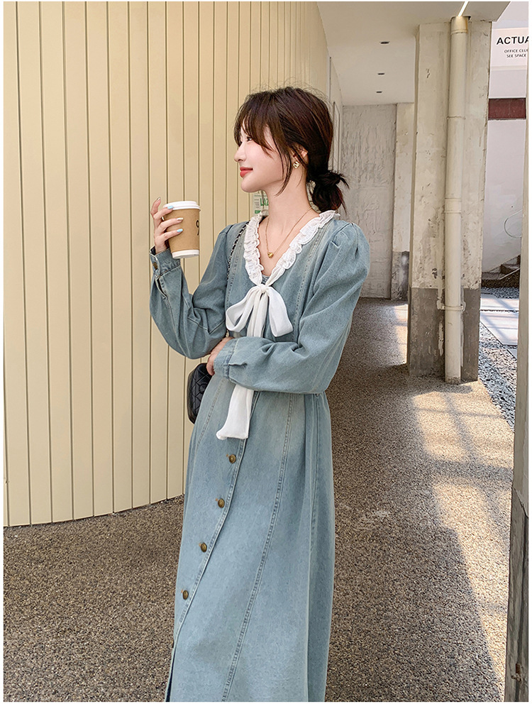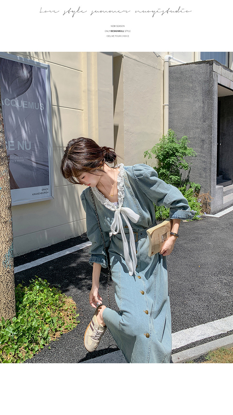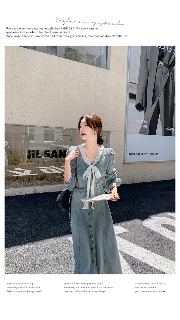 獨家訂製│韓系氣質感V領繫帶拼接收腰牛仔連衣裙(10H6980)
