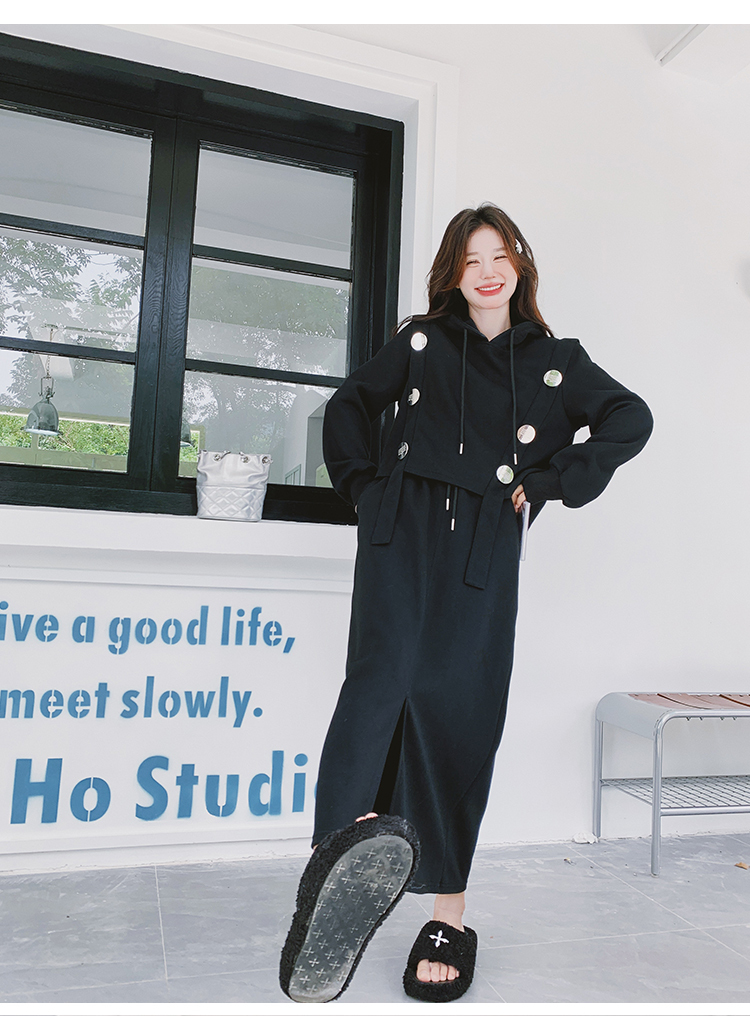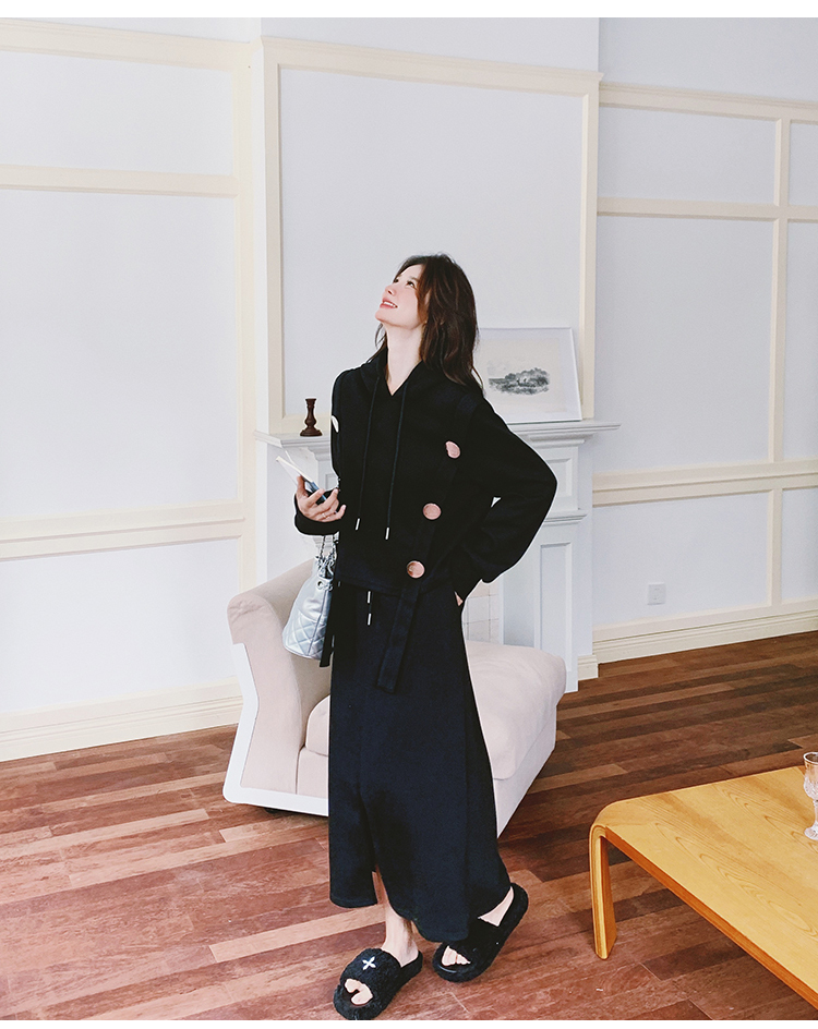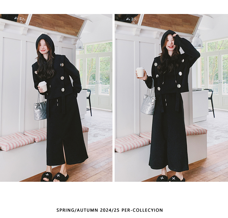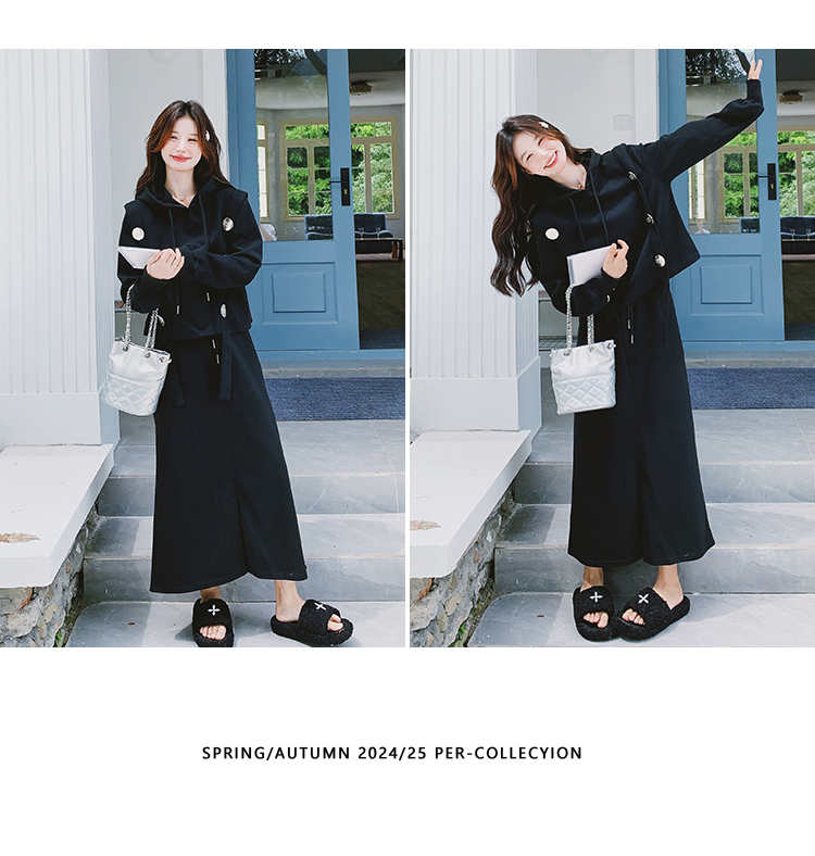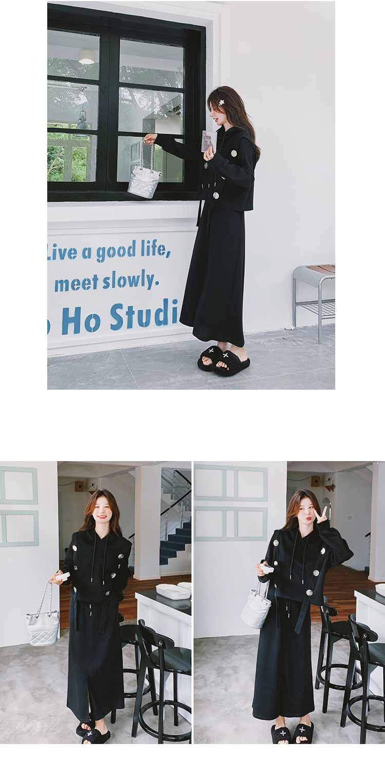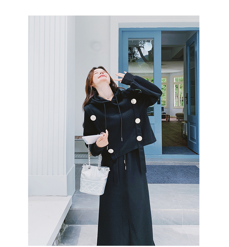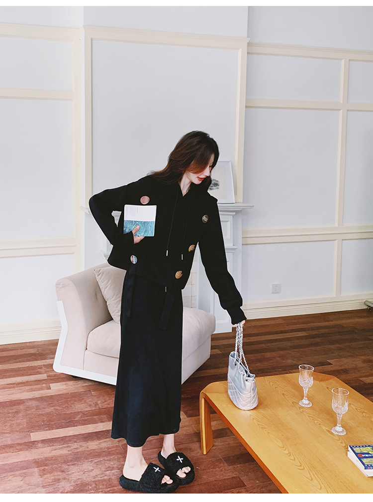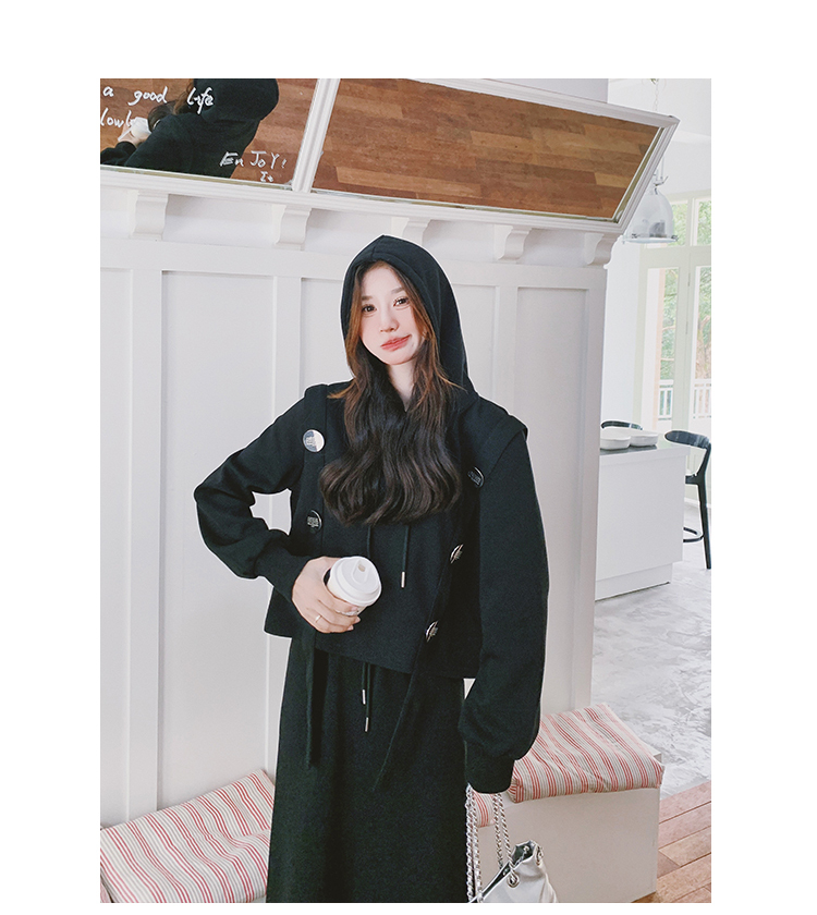 獨家訂製│2件式 韓系甜酷風連帽飄帶上衣+A字裙(10H7007)