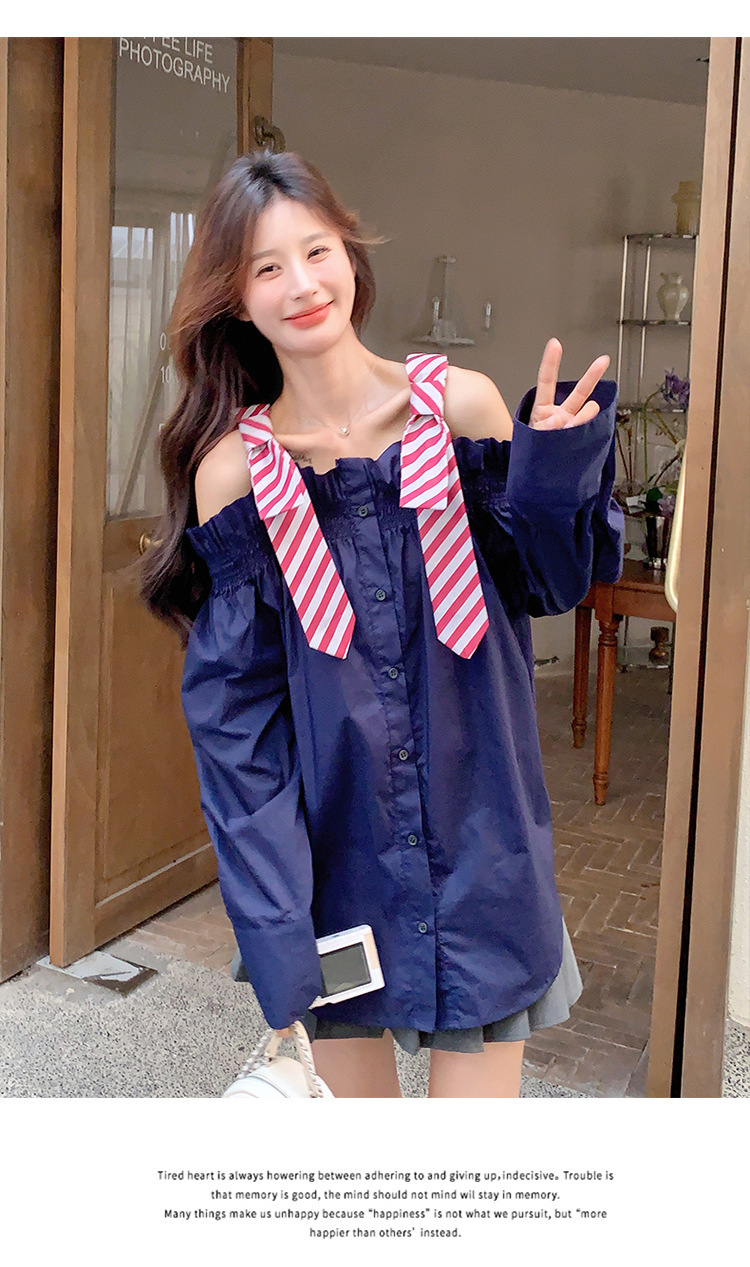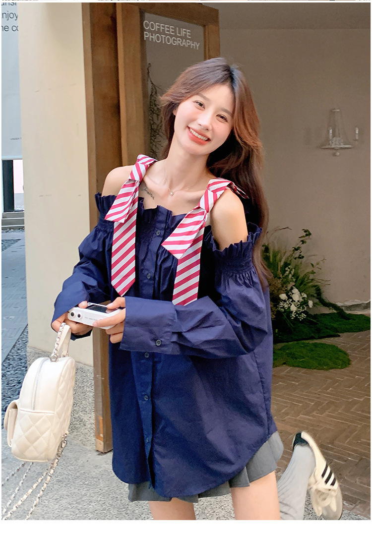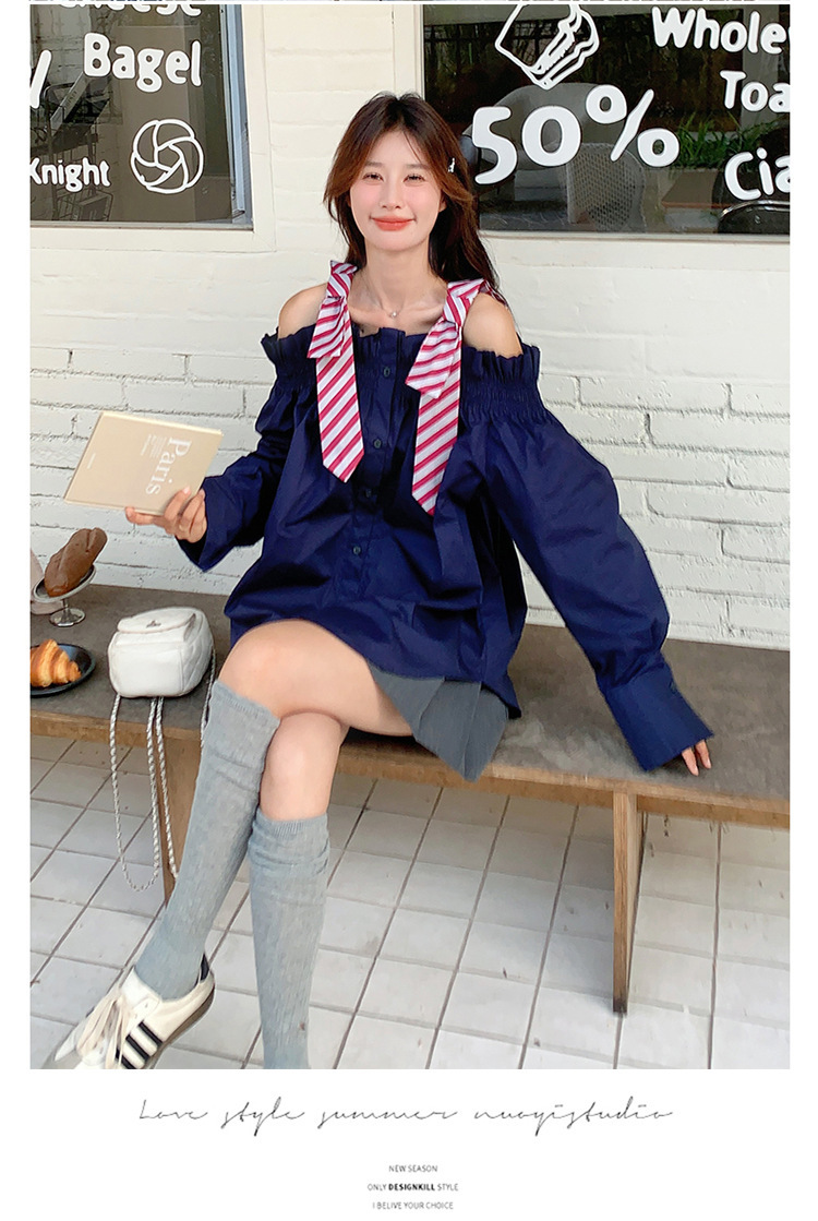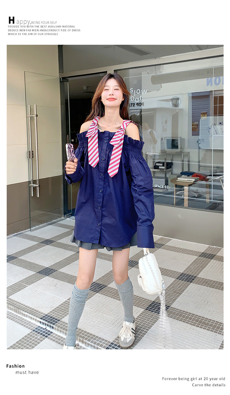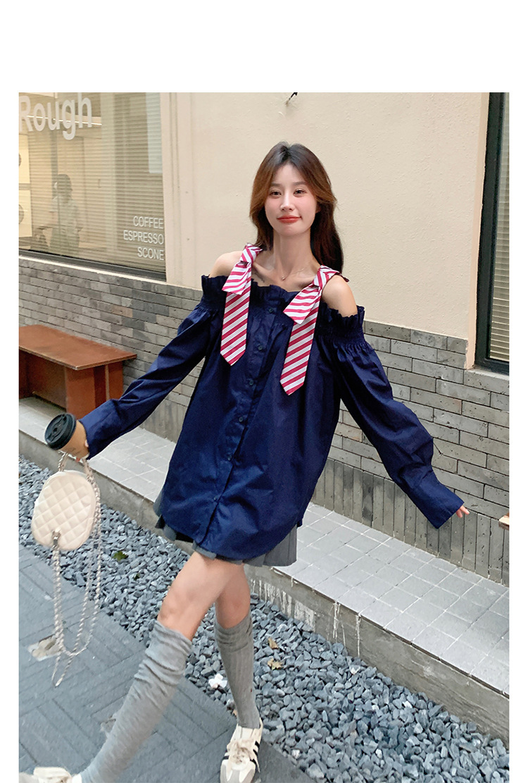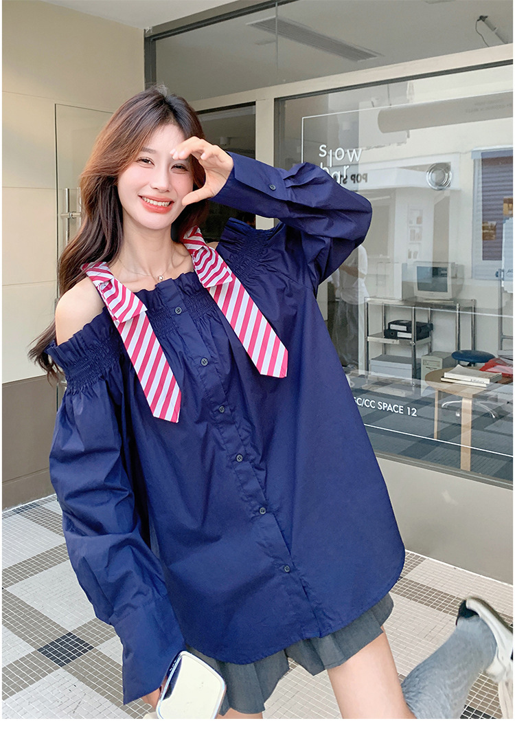 獨家訂製│韓系微性感條紋肩帶露肩襯衫(10H7152)