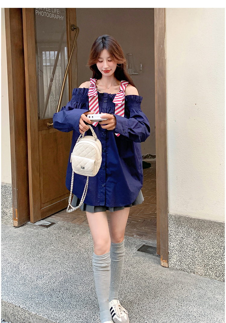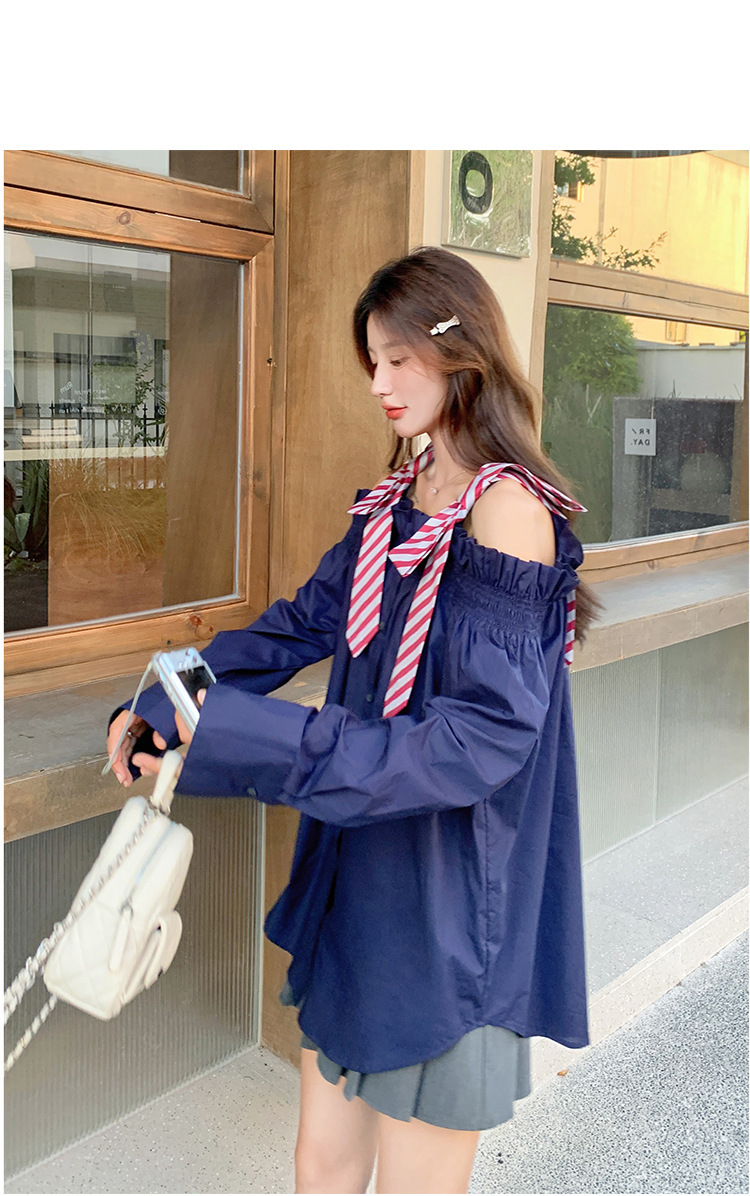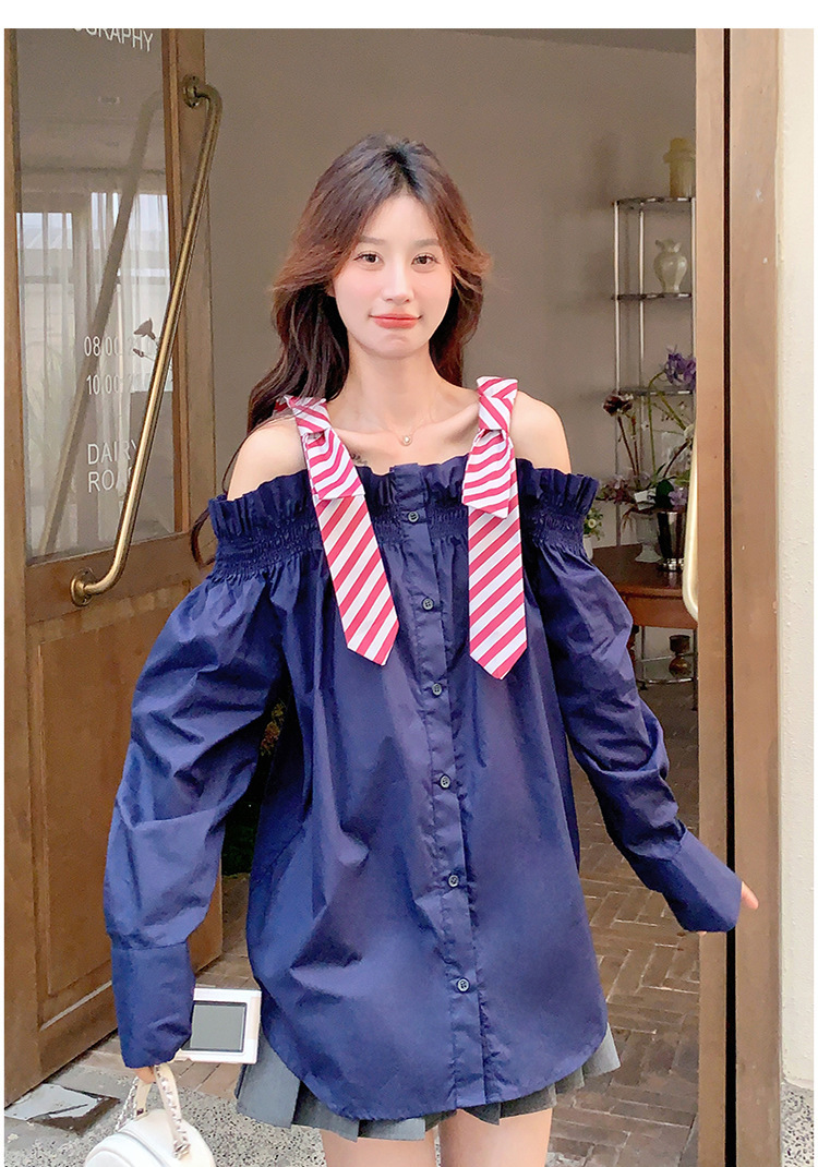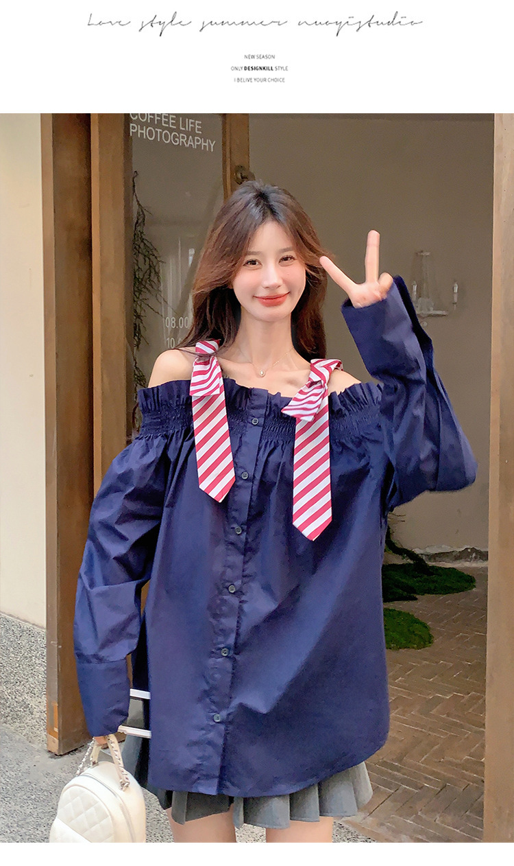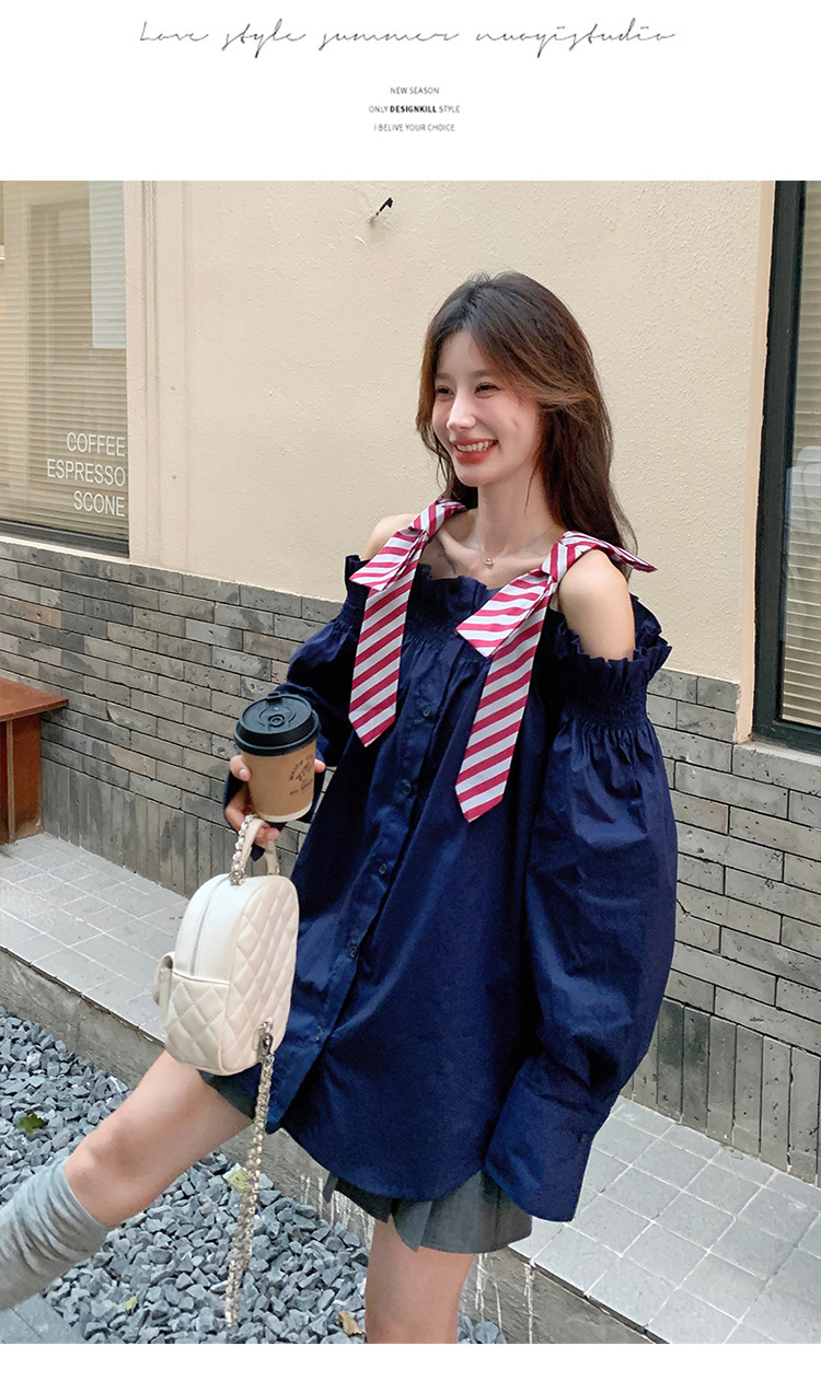 獨家訂製│韓系微性感條紋肩帶露肩襯衫(10H7152)