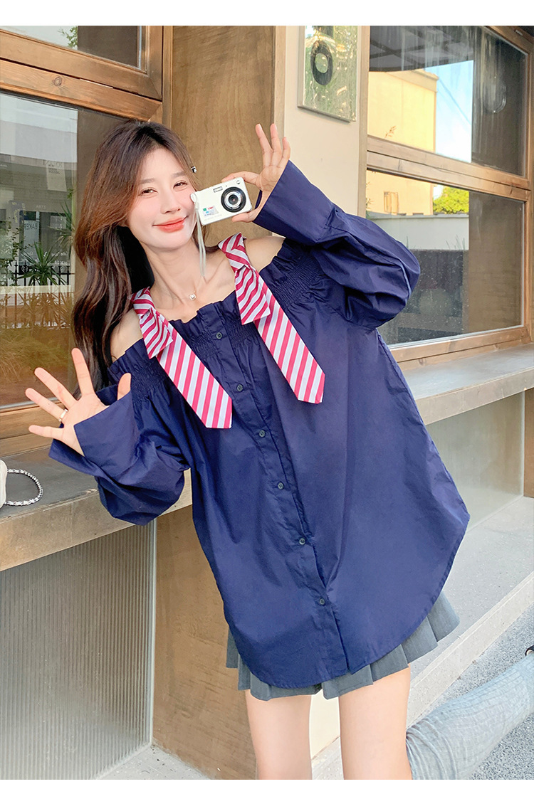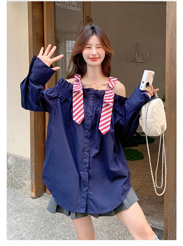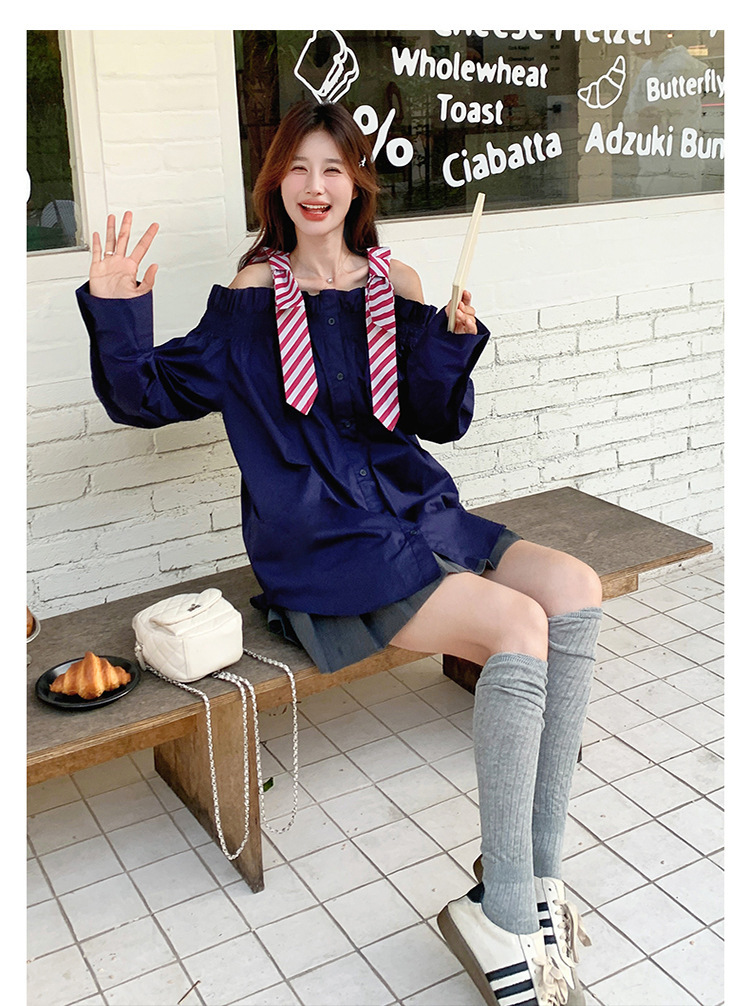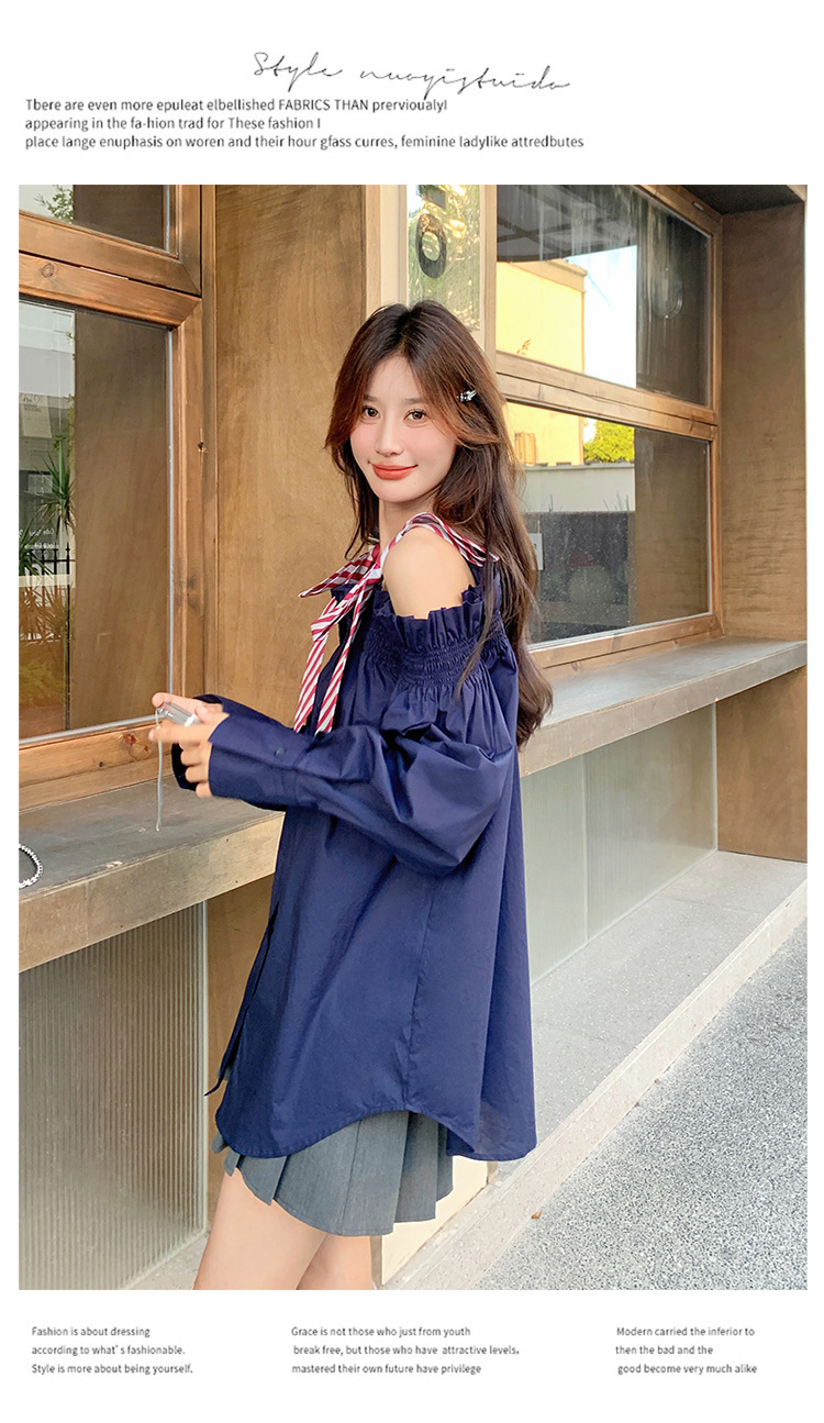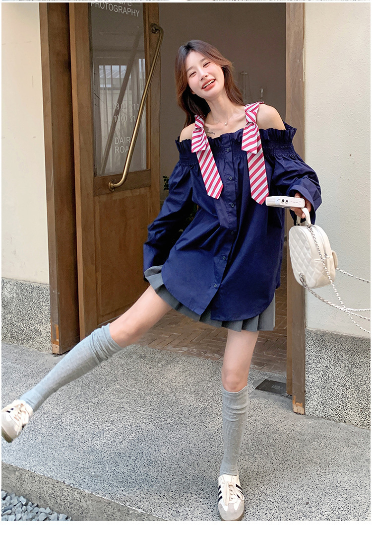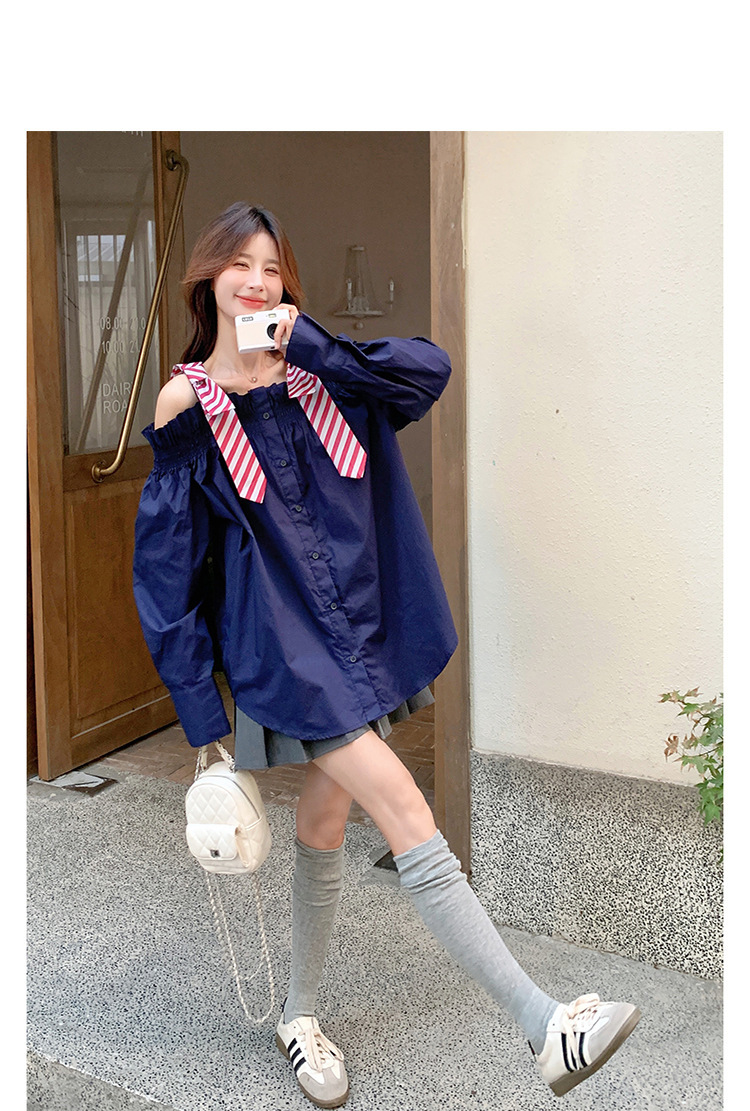 獨家訂製│韓系微性感條紋肩帶露肩襯衫(10H7152)
