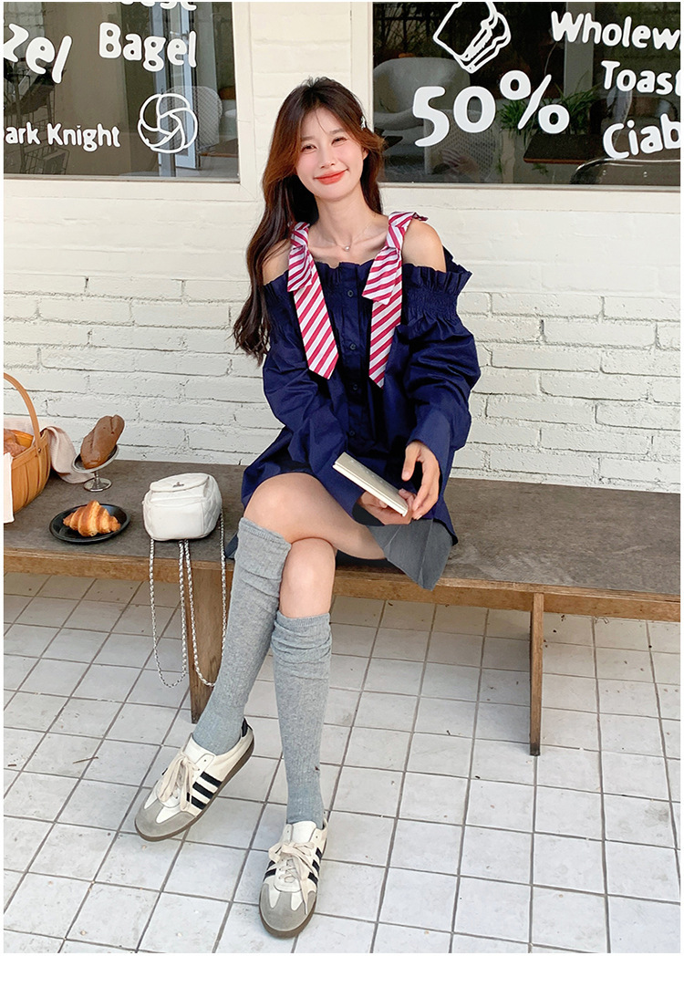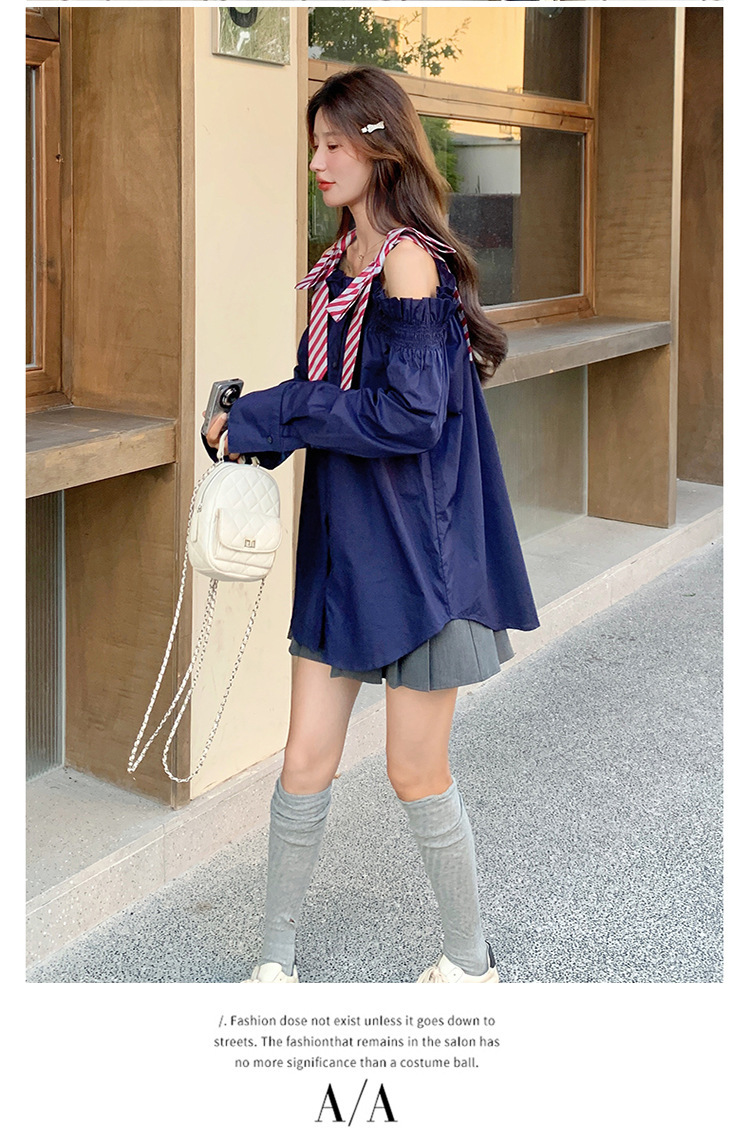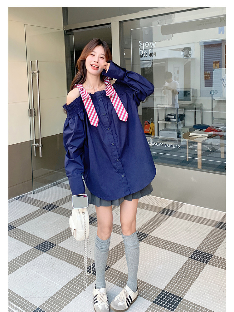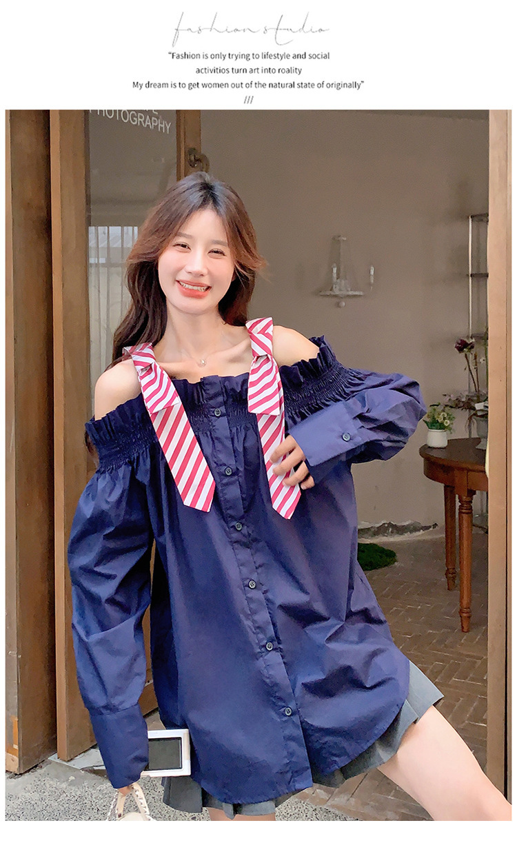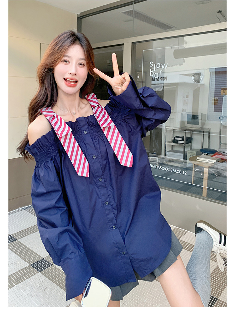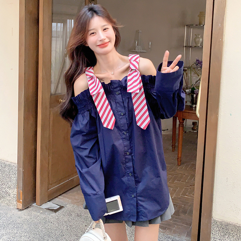 獨家訂製│韓系微性感條紋肩帶露肩襯衫(10H7152)