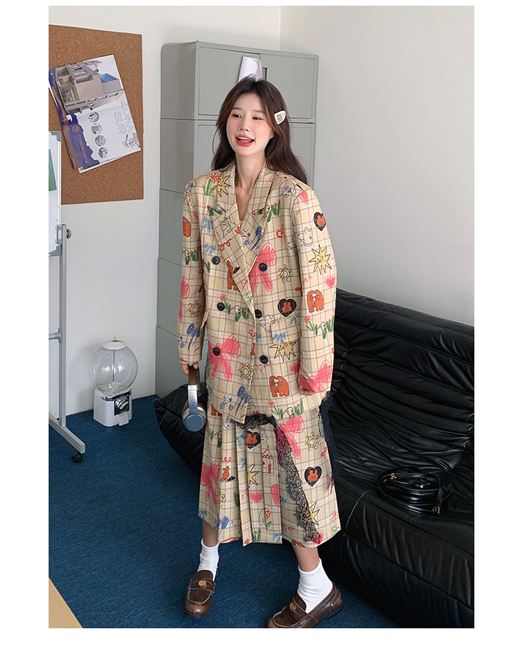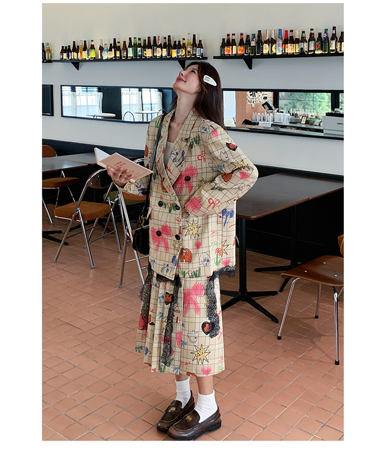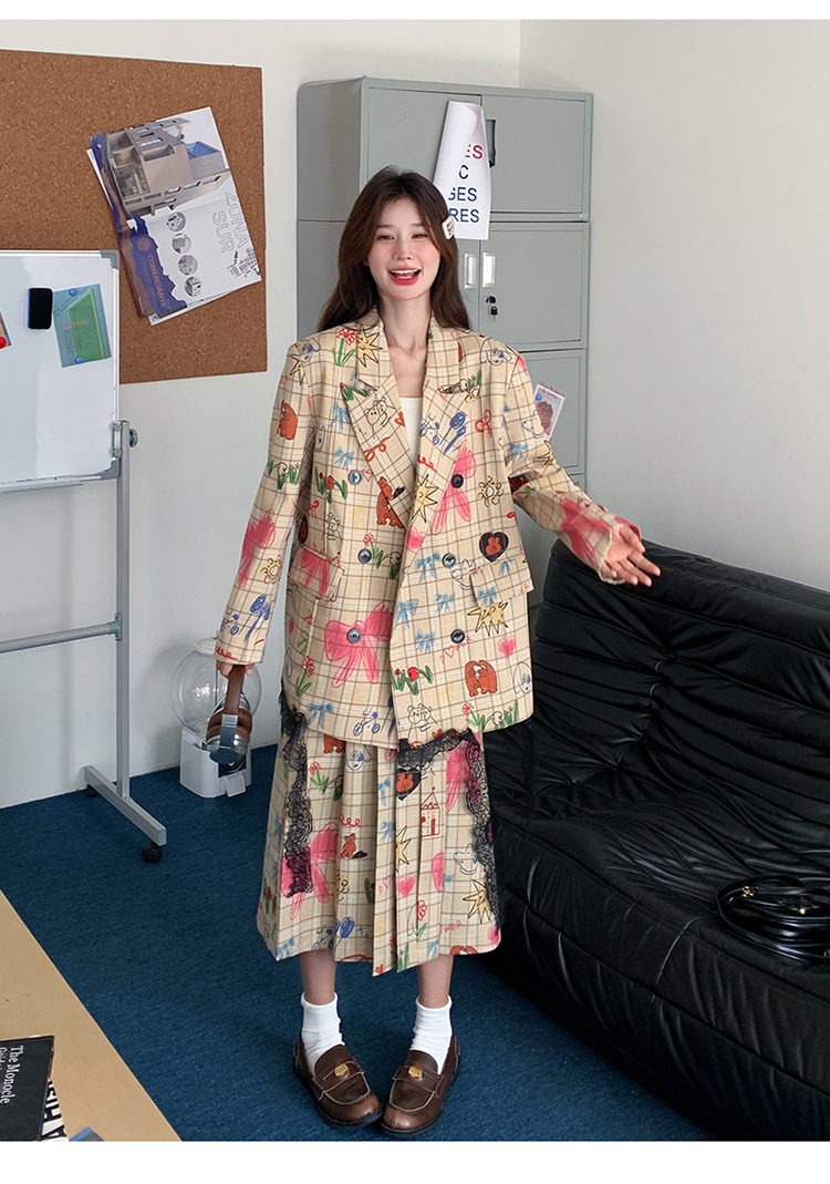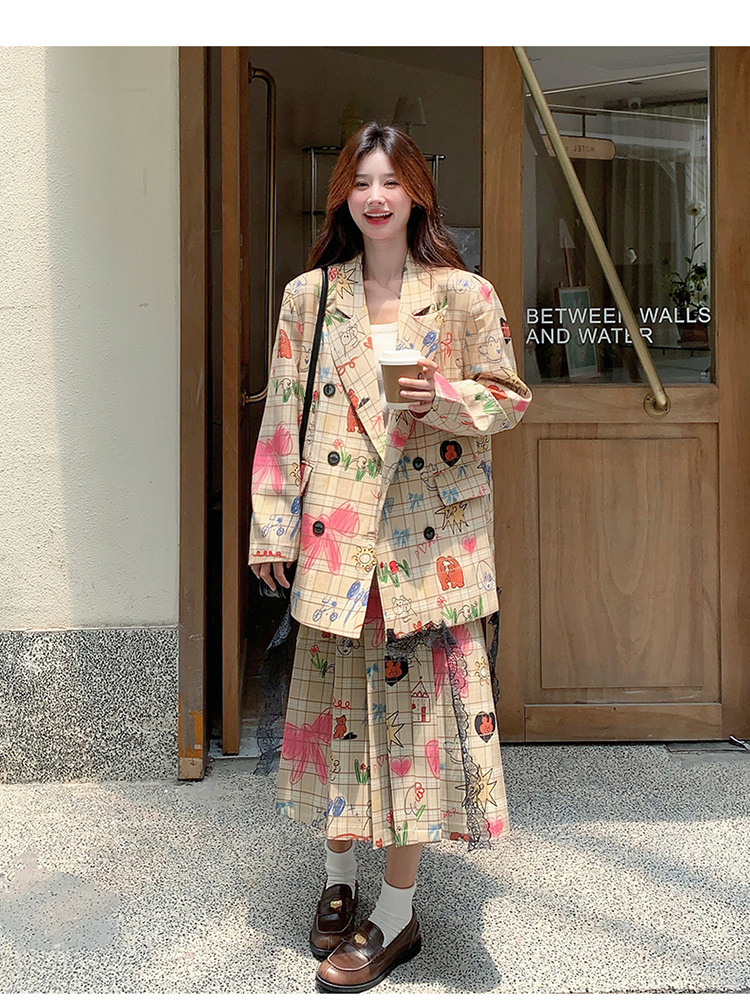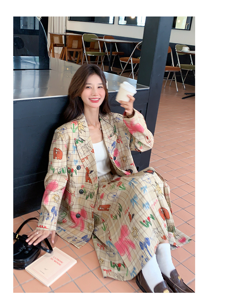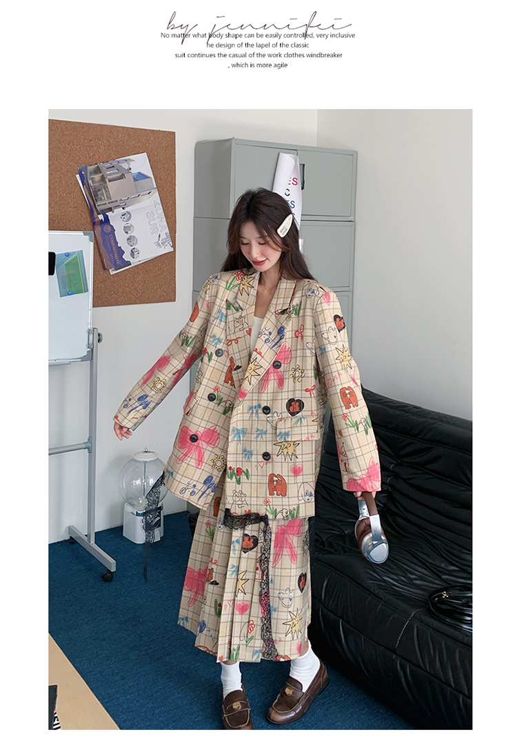 獨家訂製│2件式 韓系復古風塗鴉西裝外套+A字裙(10H7249)