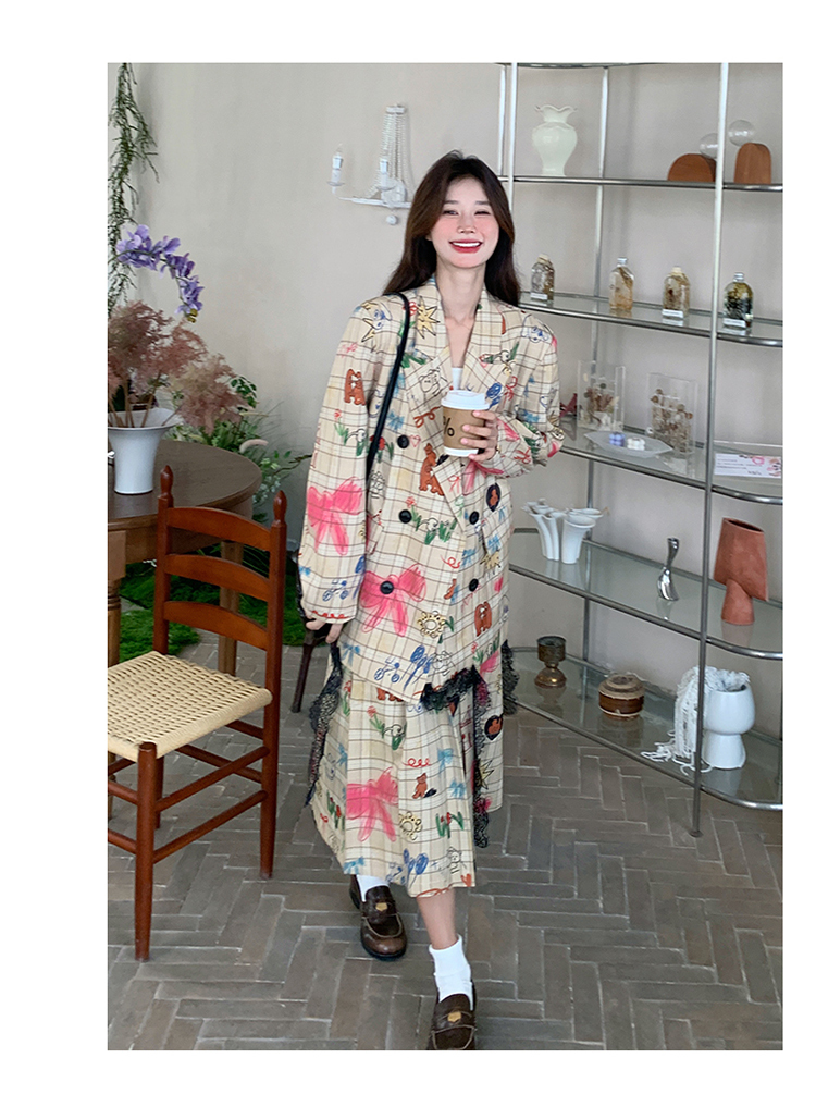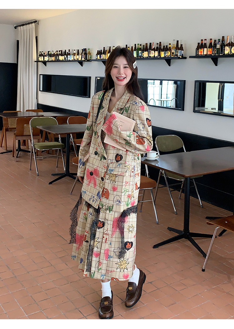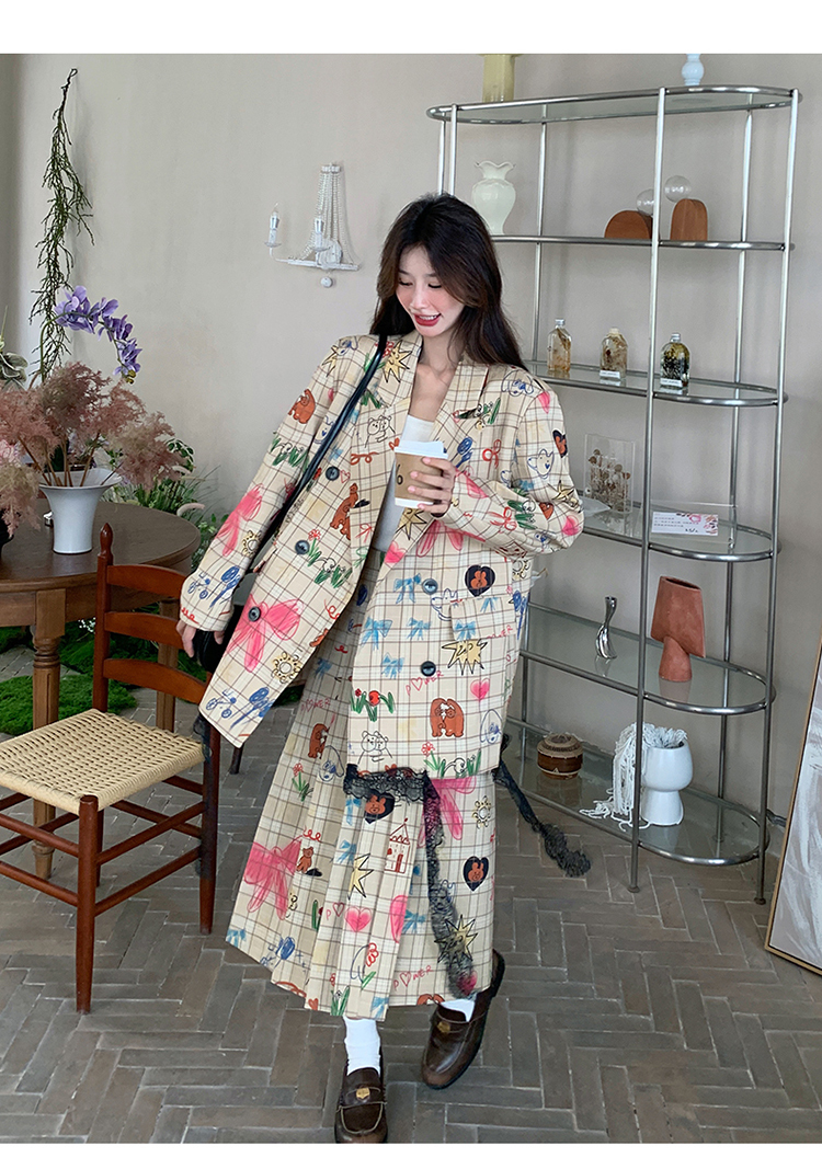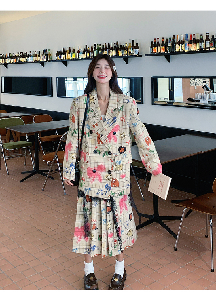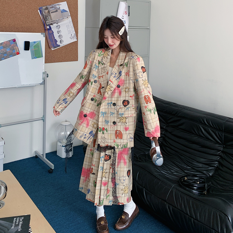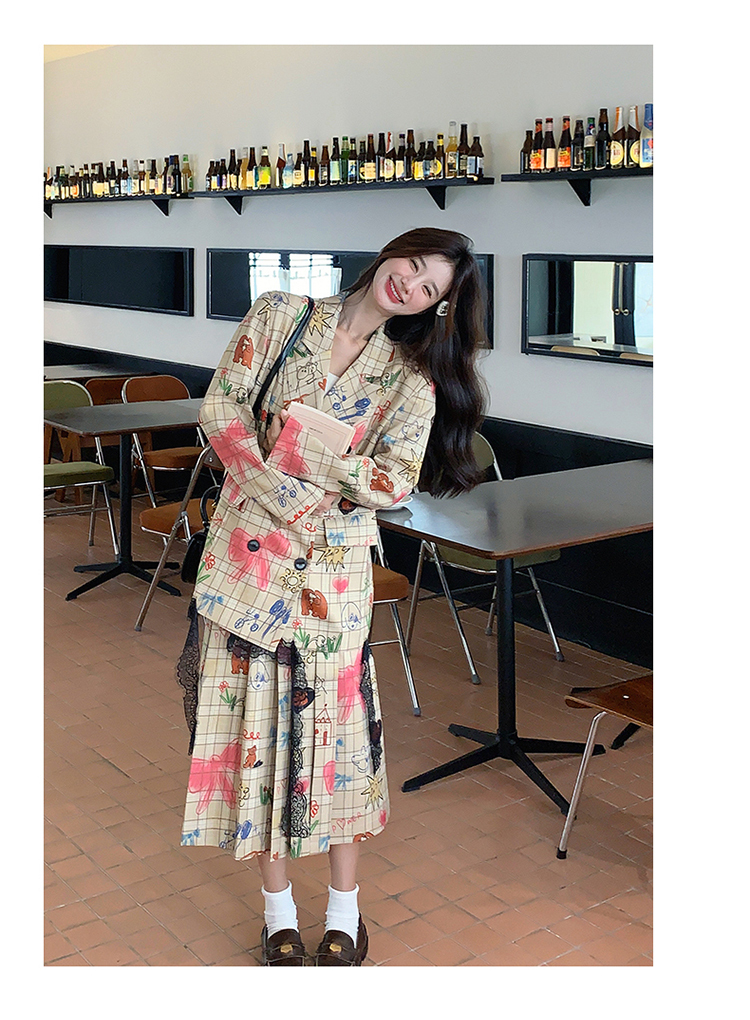 獨家訂製│2件式 韓系復古風塗鴉西裝外套+A字裙(10H7249)