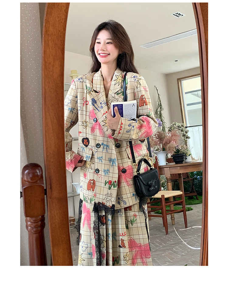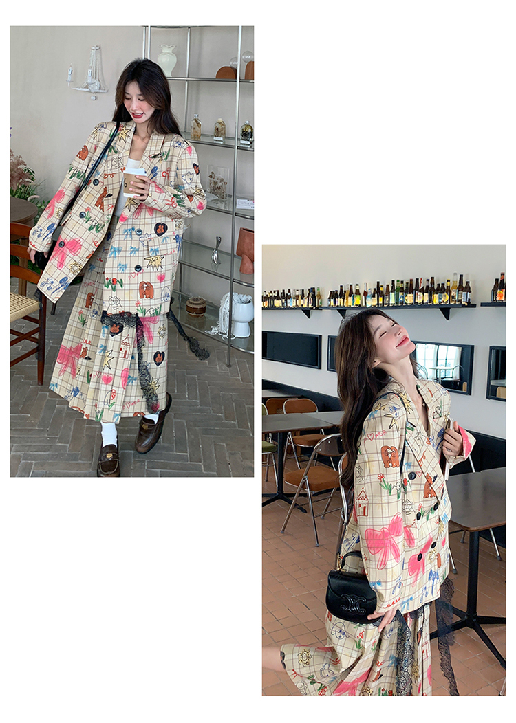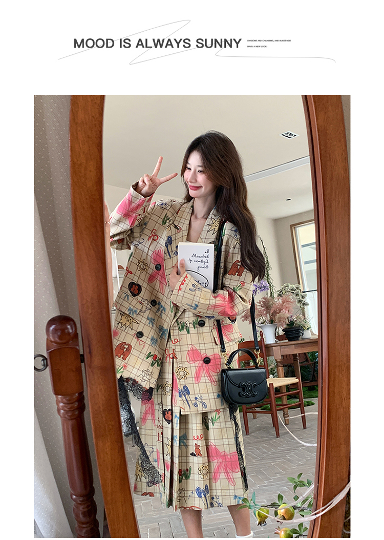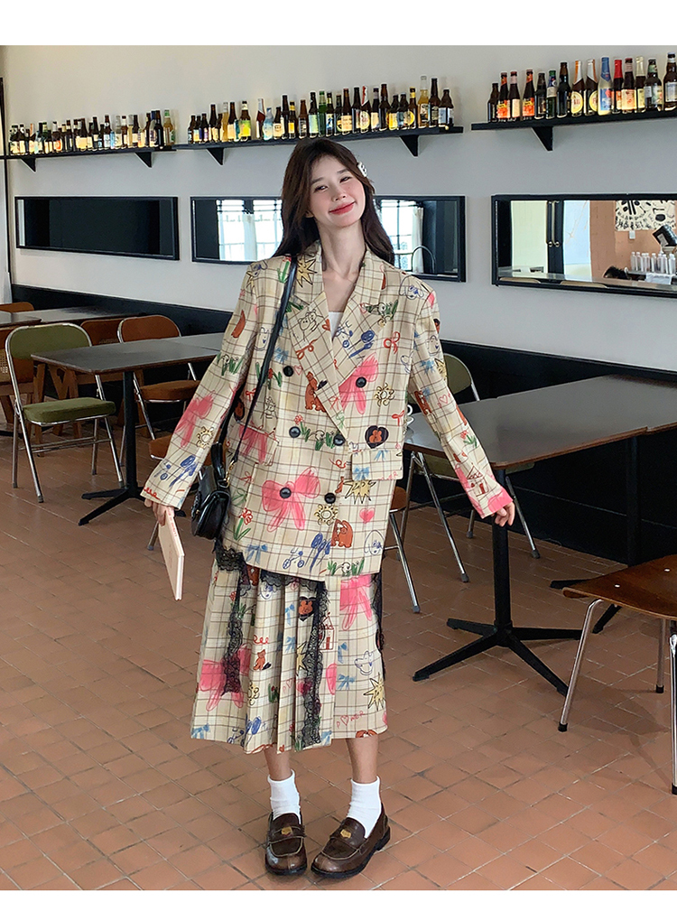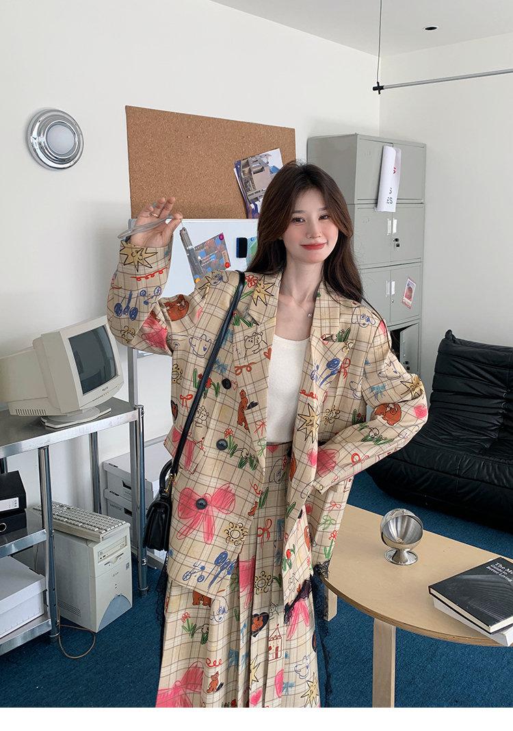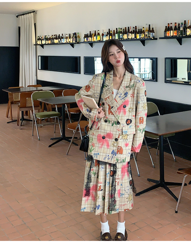獨家訂製│2件式 韓系復古風塗鴉西裝外套+A字裙(10H7249)