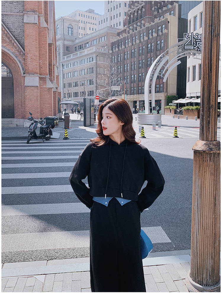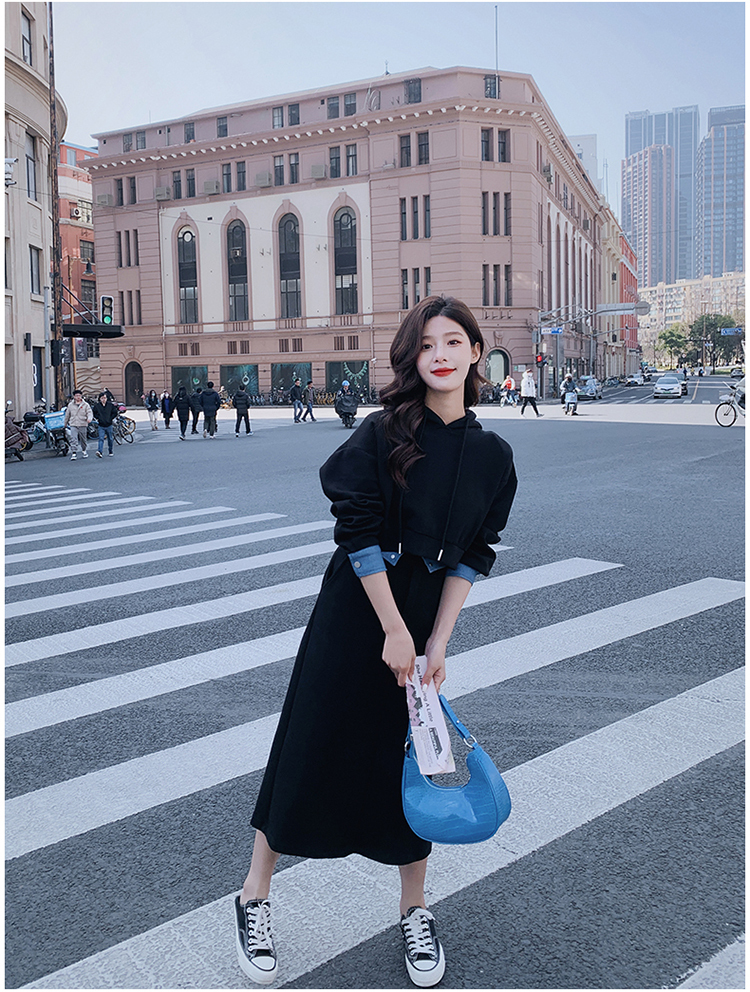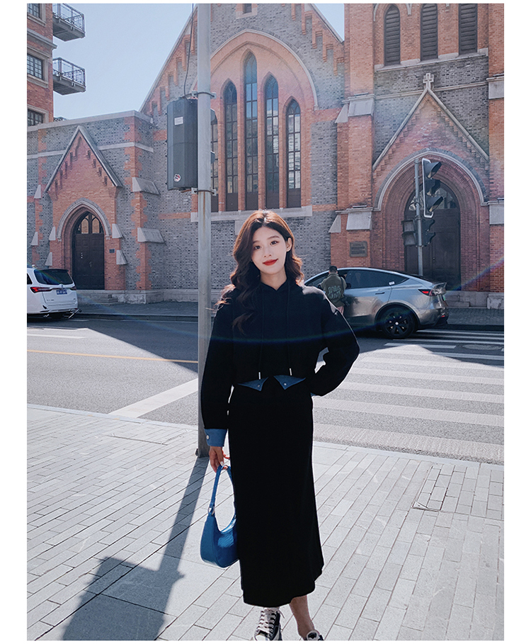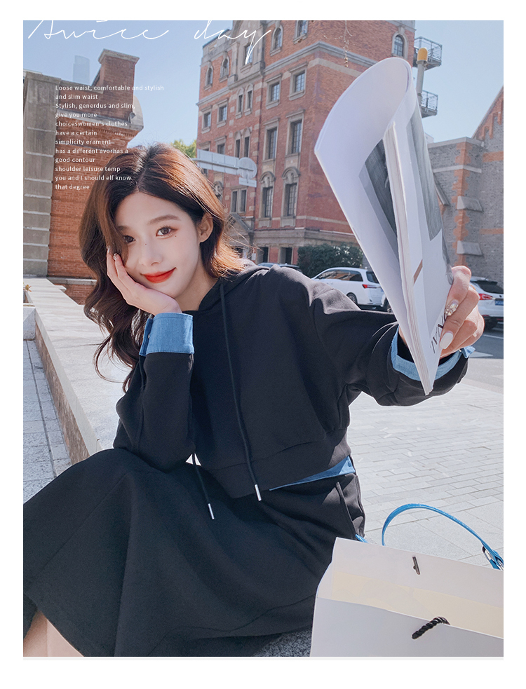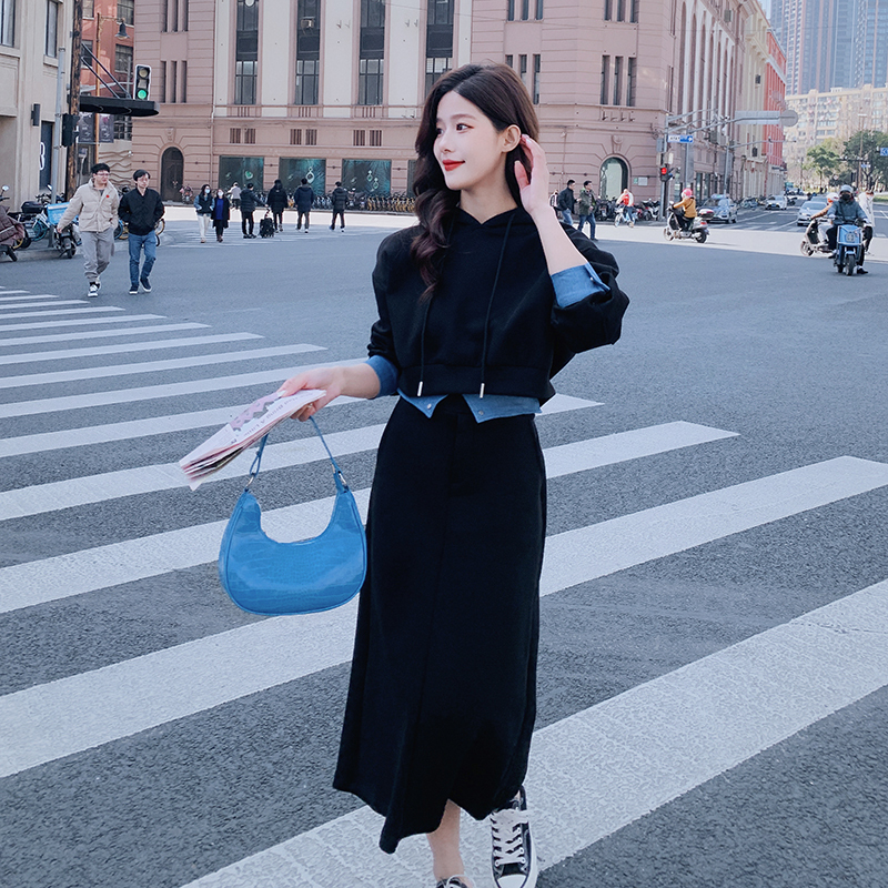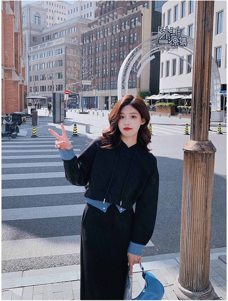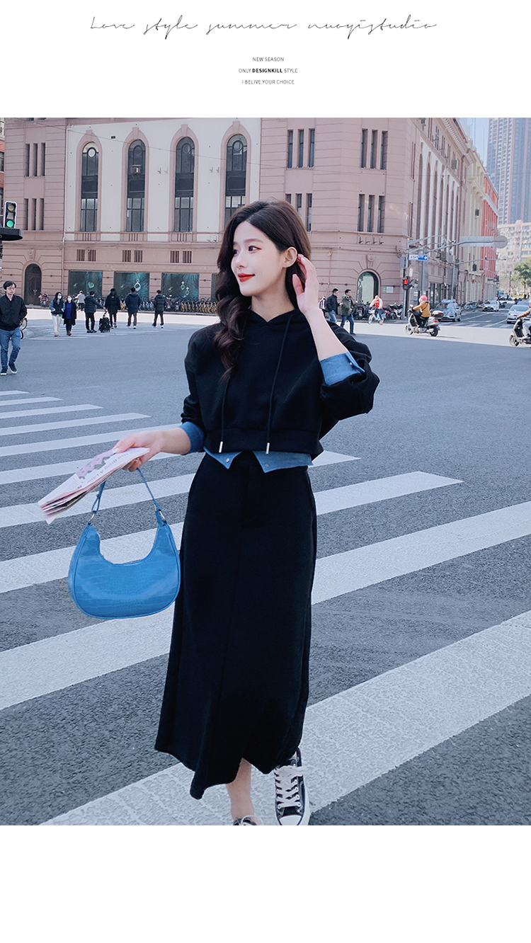 獨家訂製│韓系氣質拼接牛仔假兩件式連帽上衣+A字裙兩件式套裝組(11H5162)