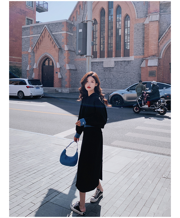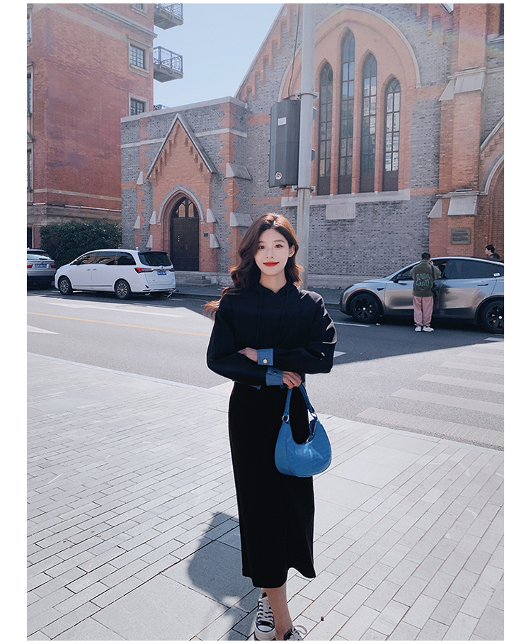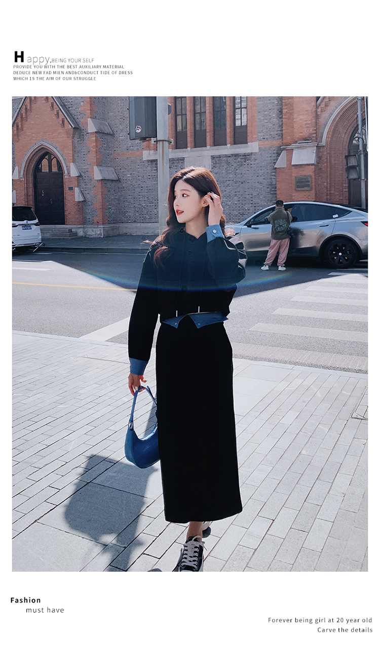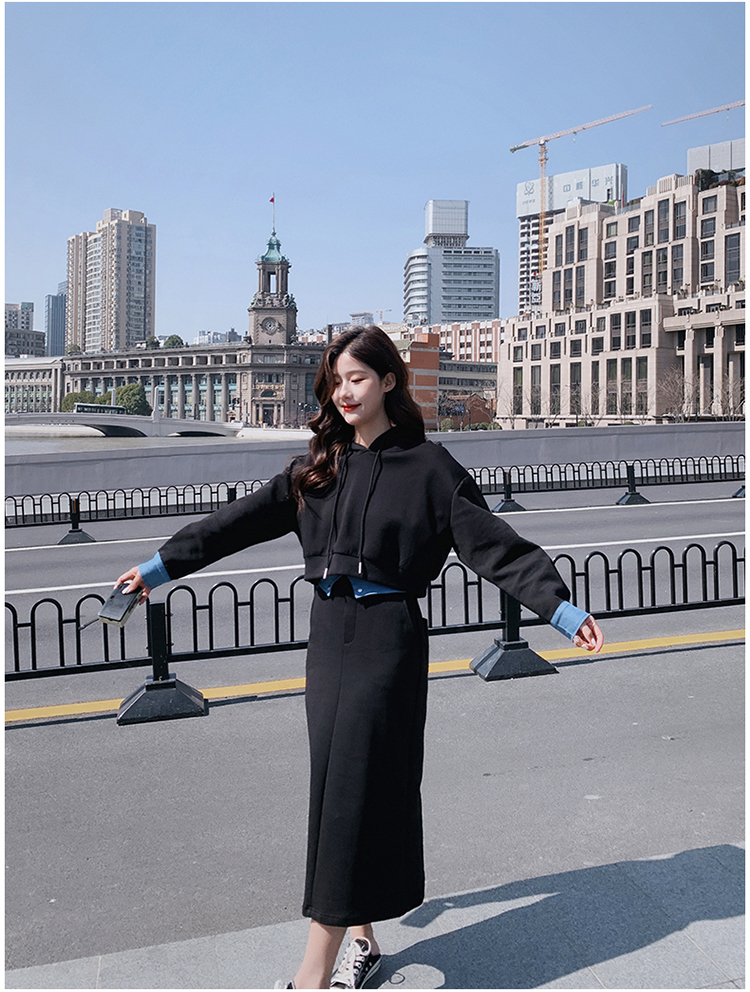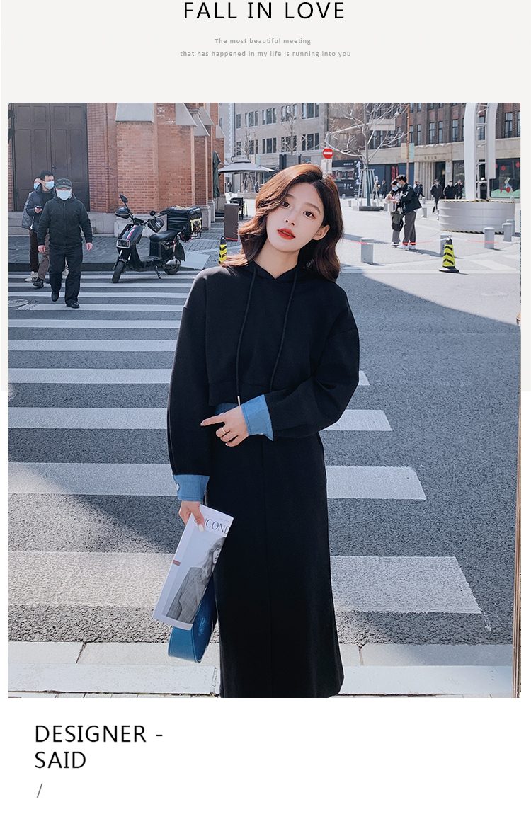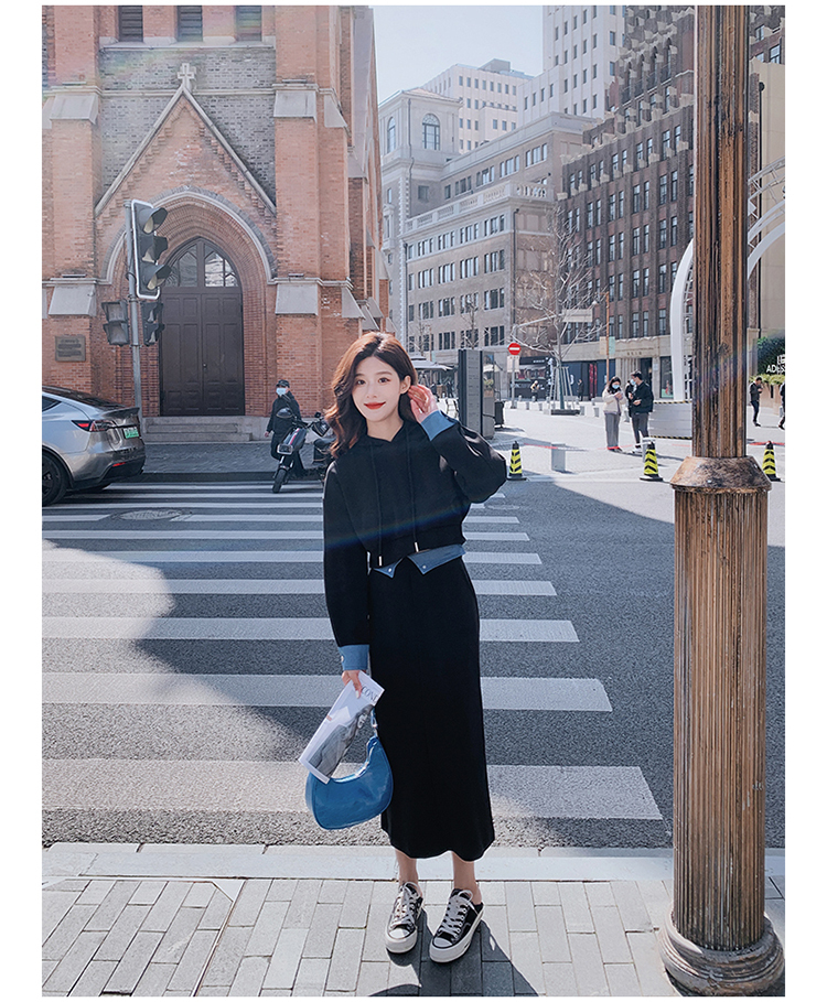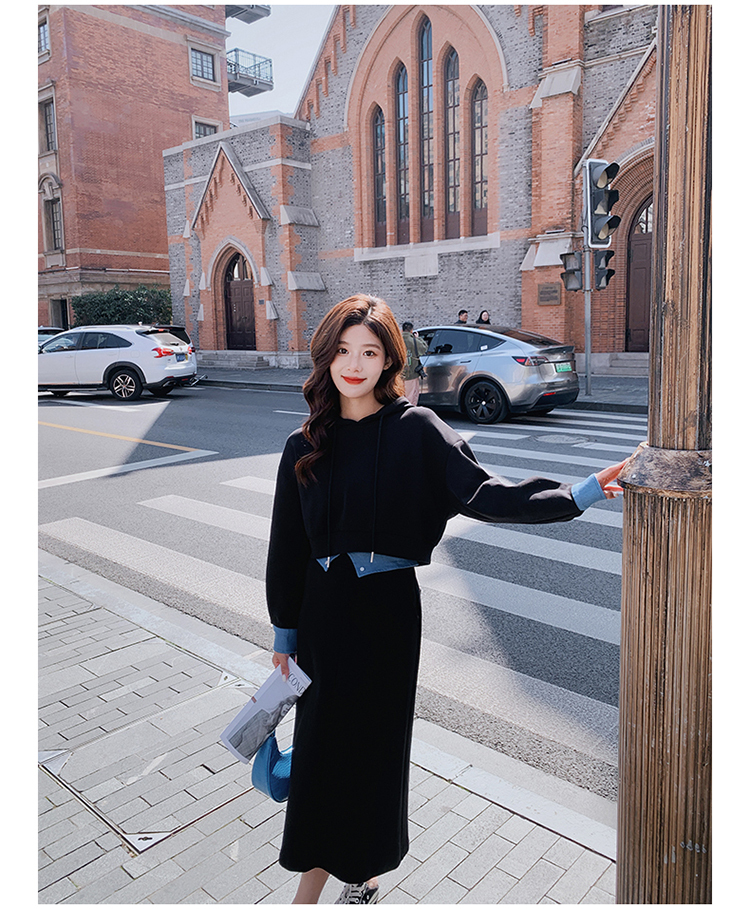 獨家訂製│韓系氣質拼接牛仔假兩件式連帽上衣+A字裙兩件式套裝組(11H5162)
