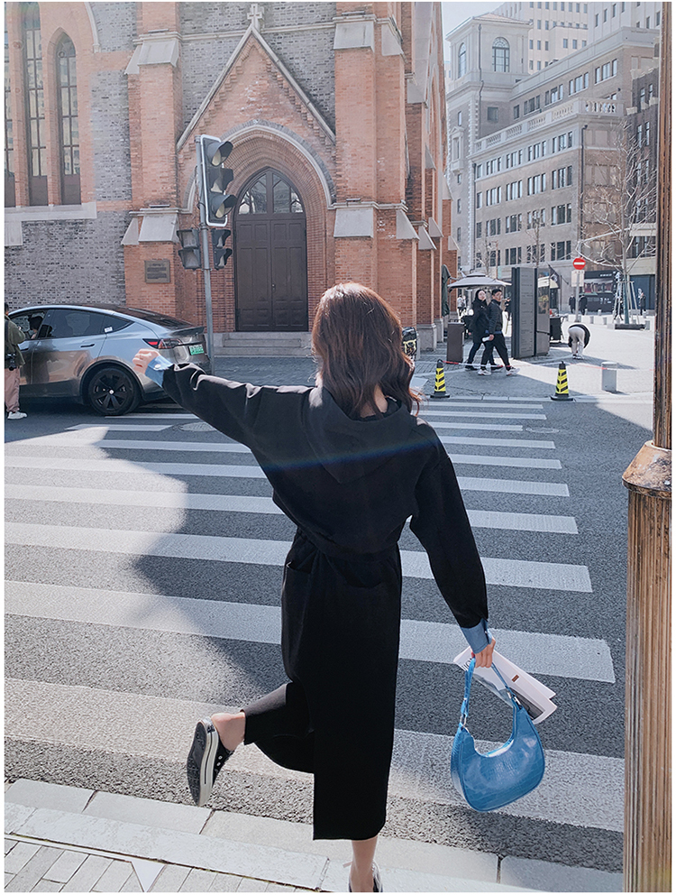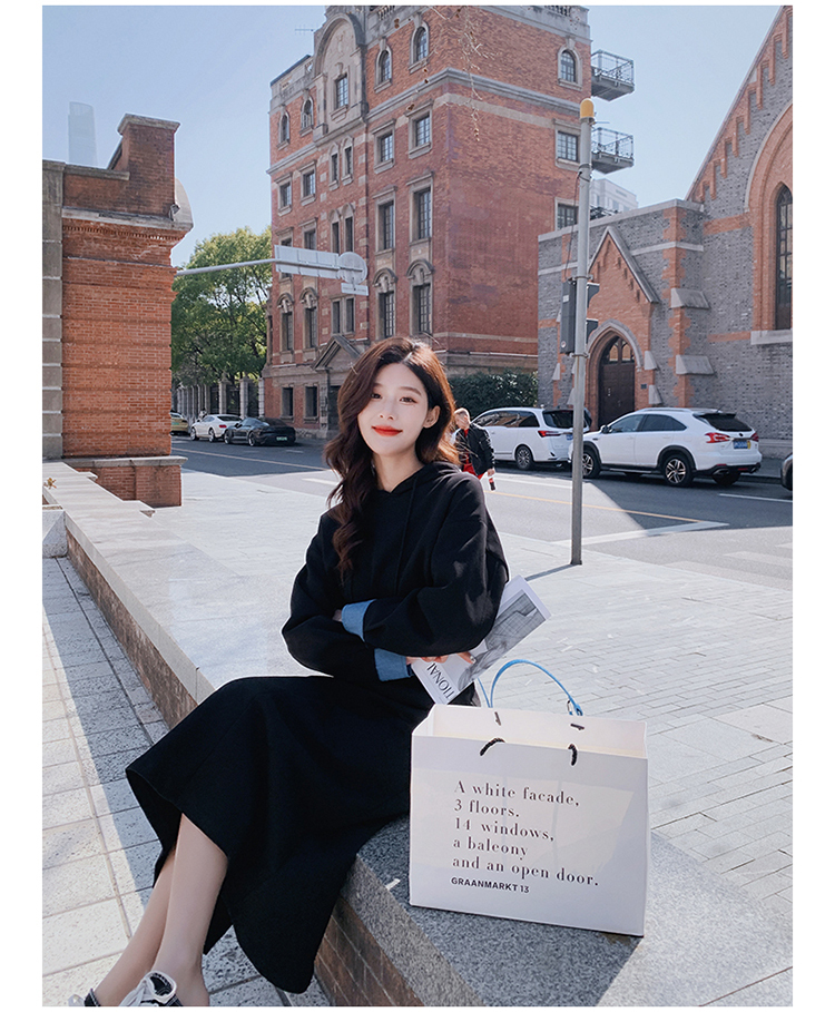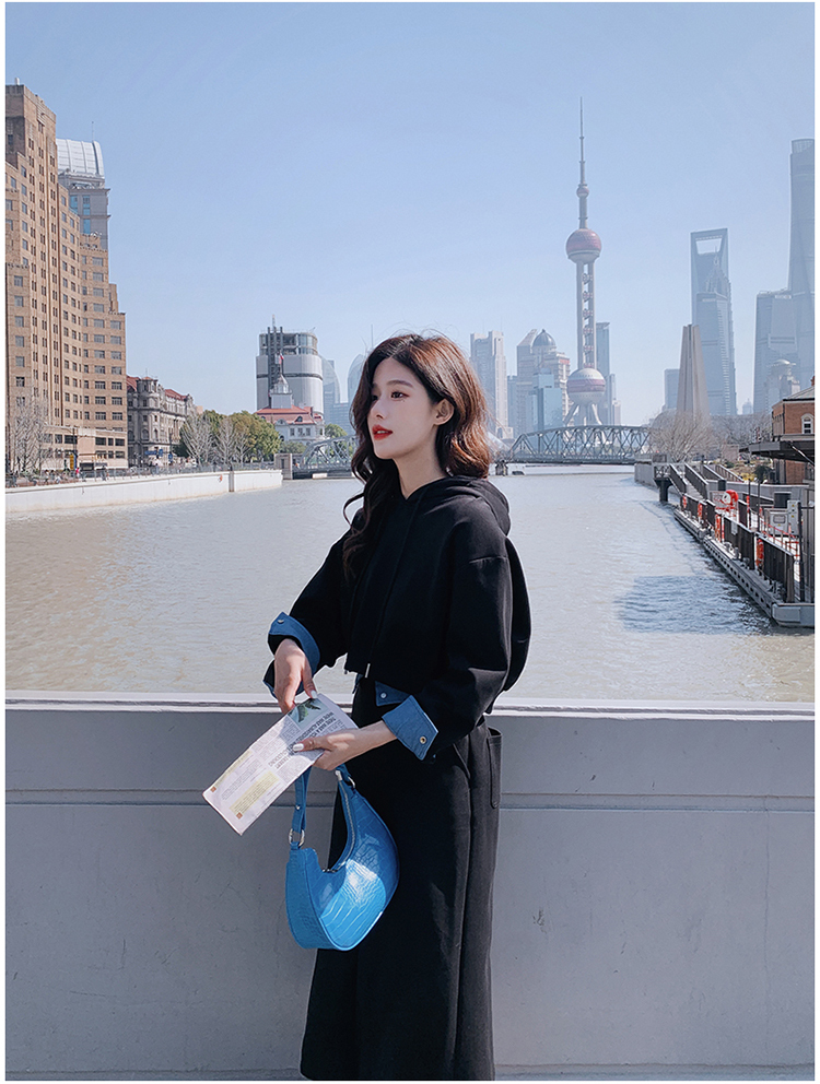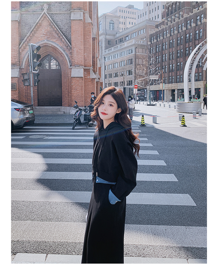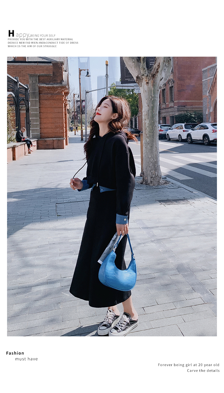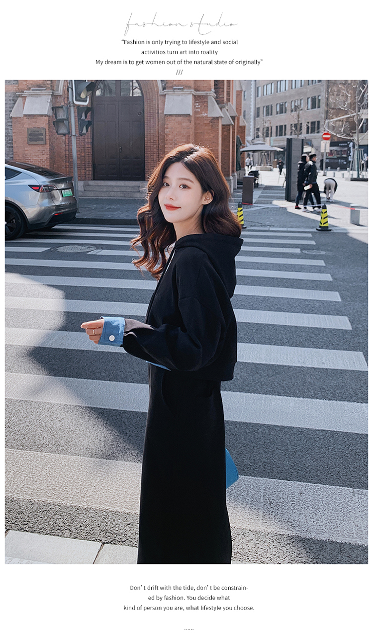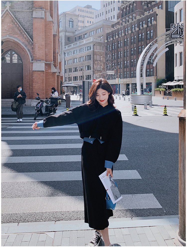 獨家訂製│韓系氣質拼接牛仔假兩件式連帽上衣+A字裙兩件式套裝組(11H5162)