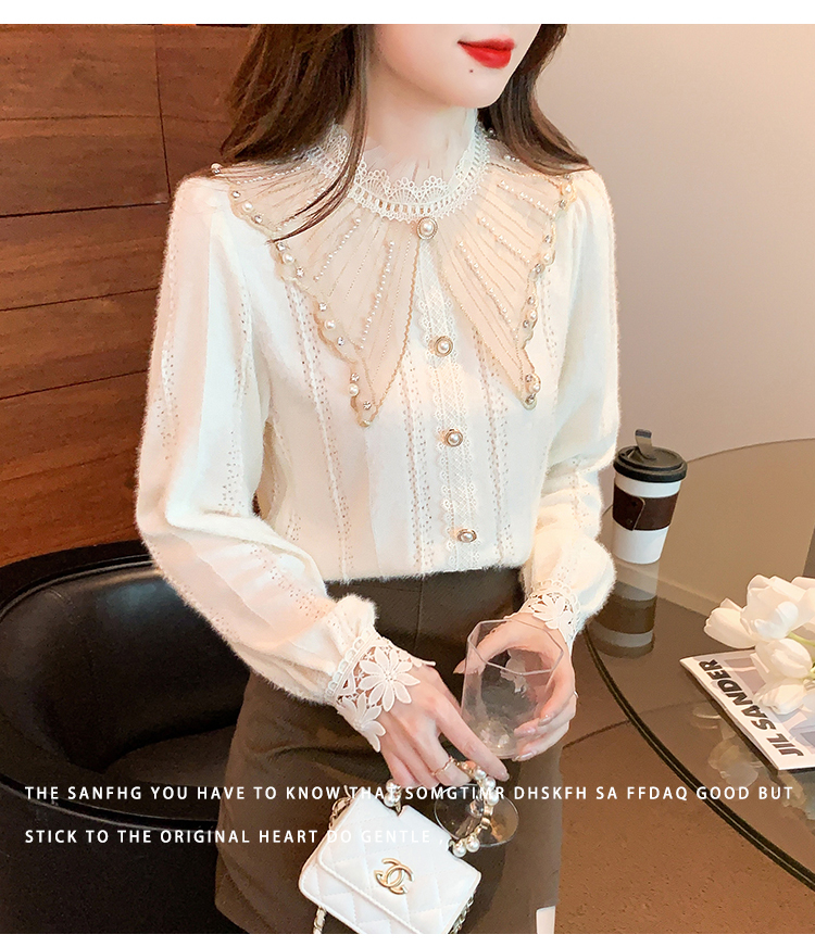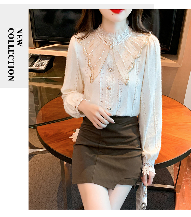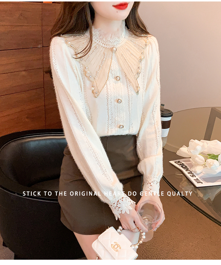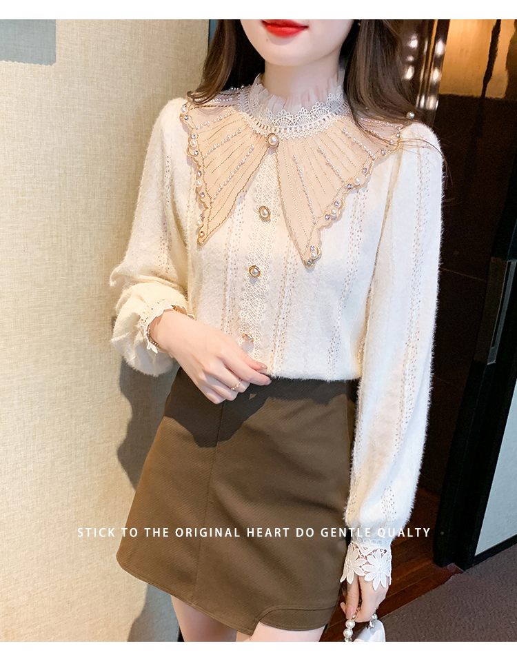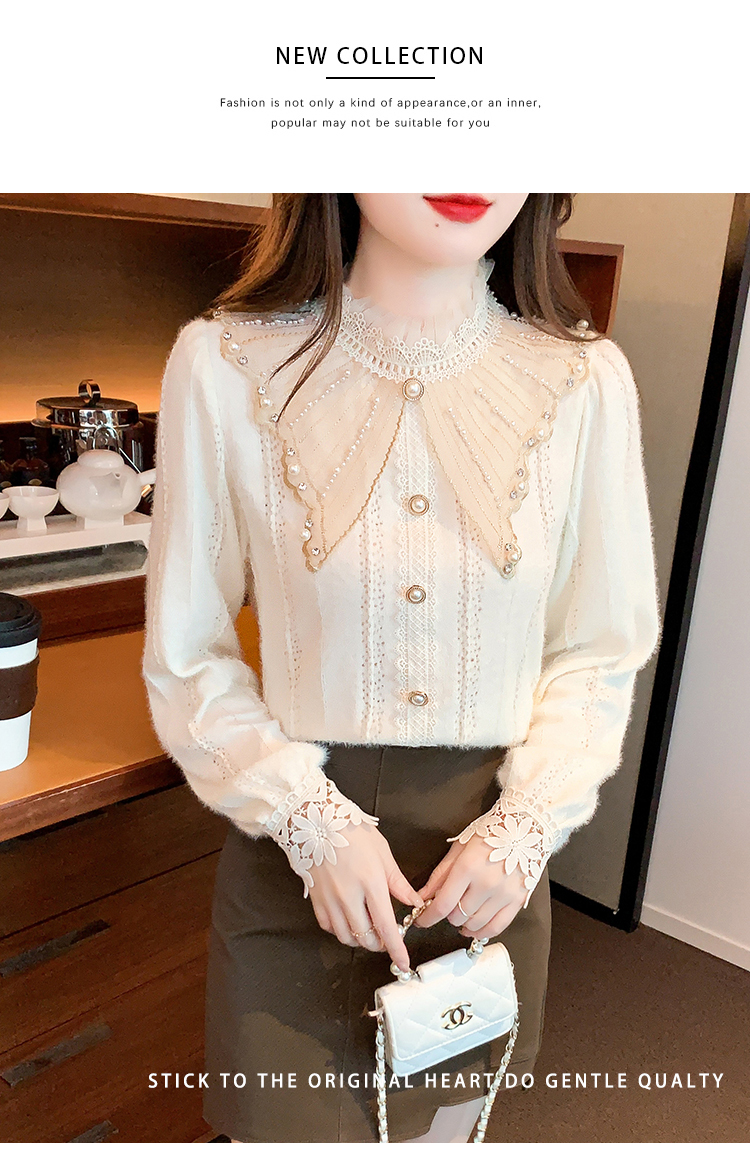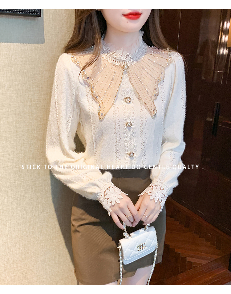 限量特惠|氣質甜美翻領釘珠鑲鑽造型磨毛蕾絲衫(11H5220)