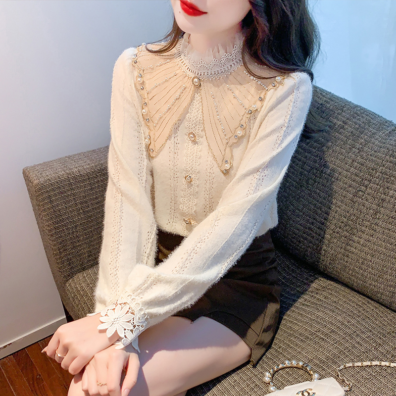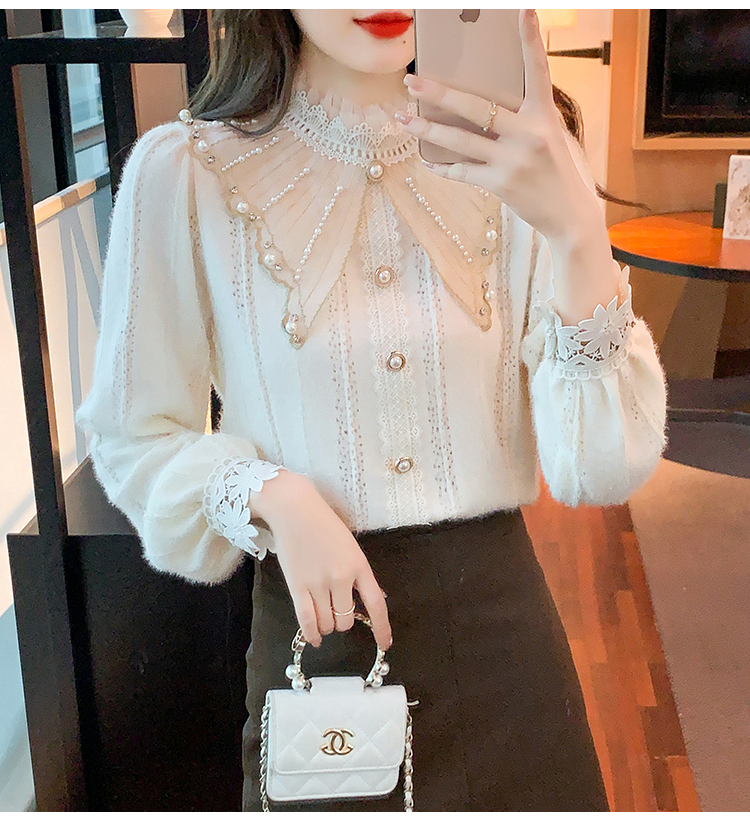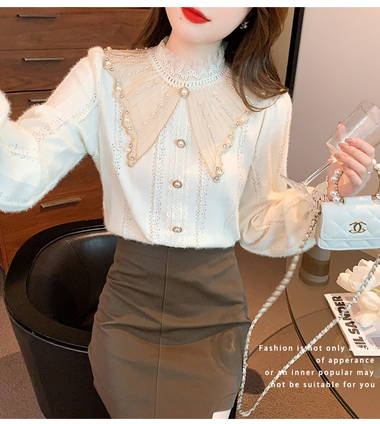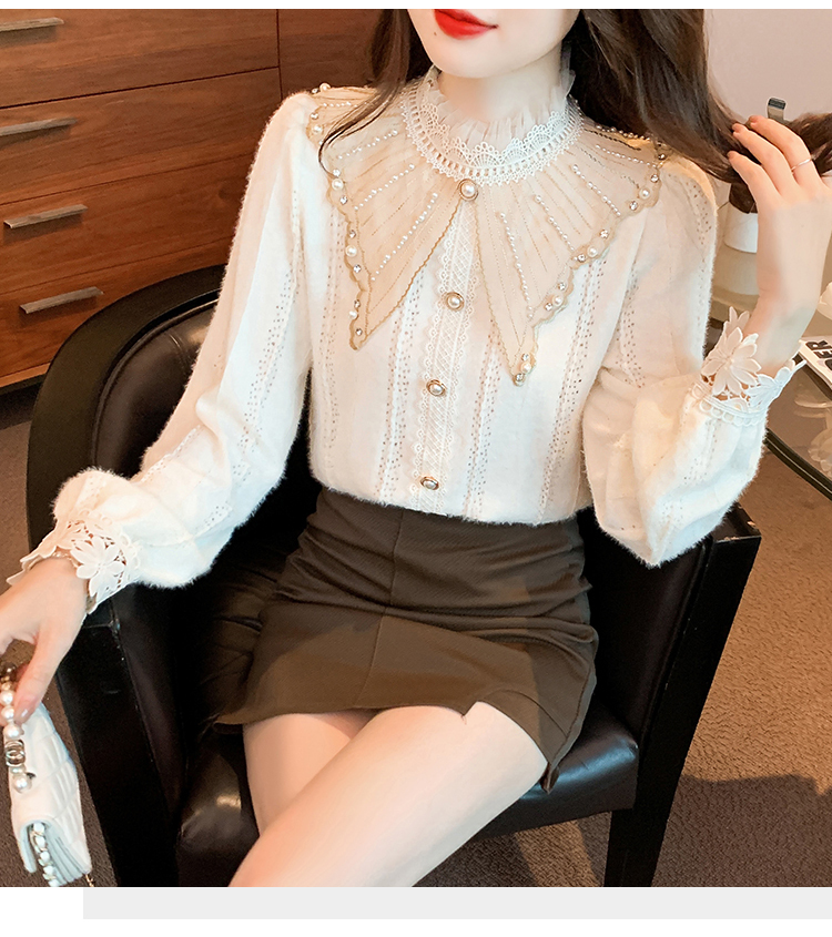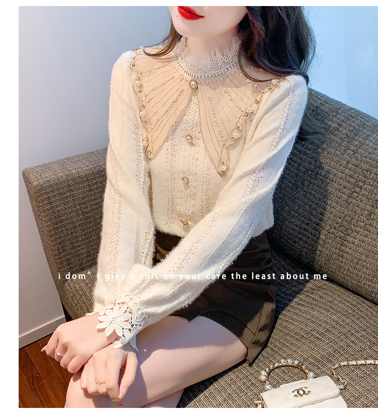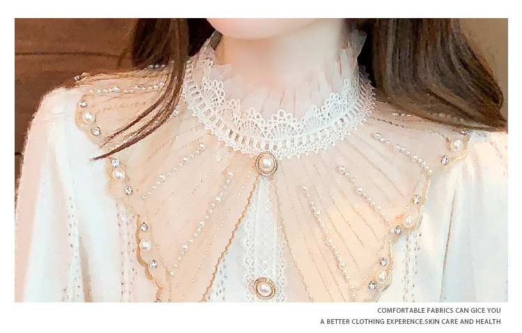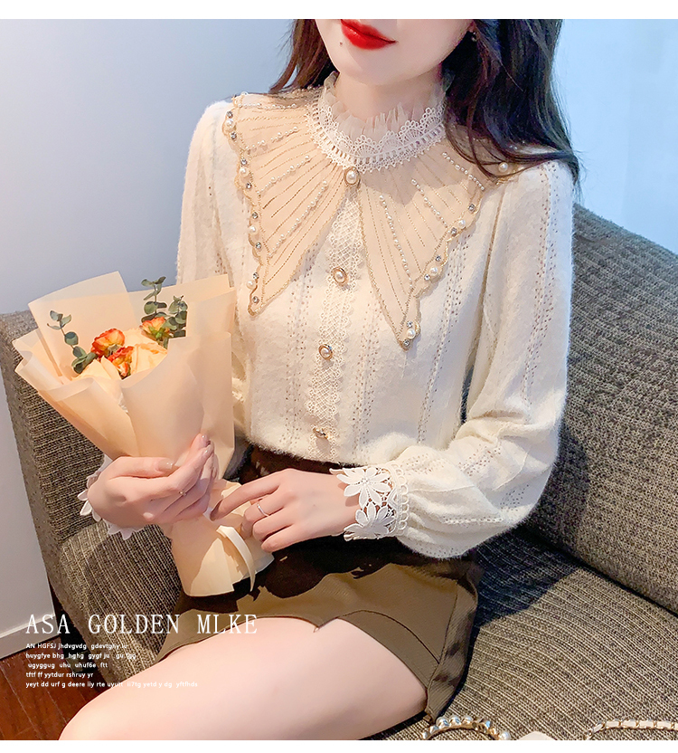 限量特惠|氣質甜美翻領釘珠鑲鑽造型磨毛蕾絲衫(11H5220)