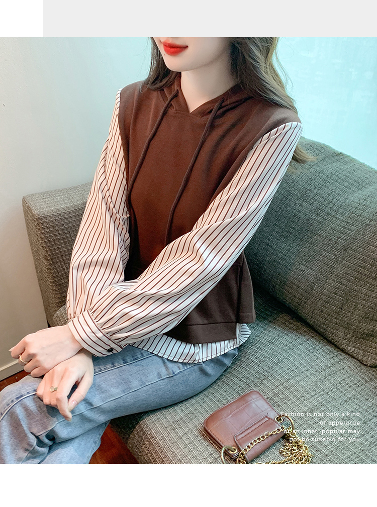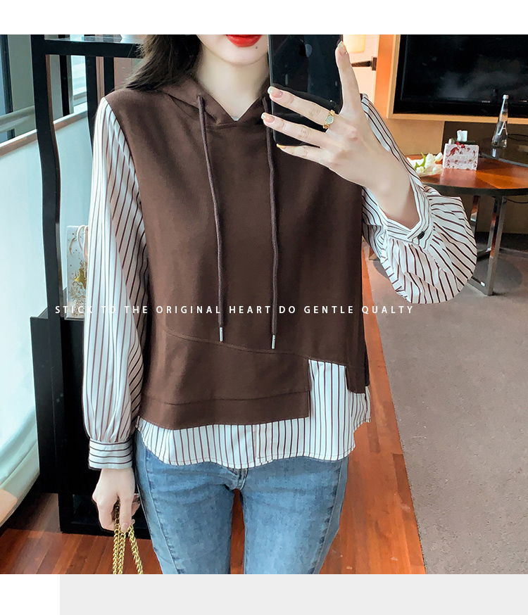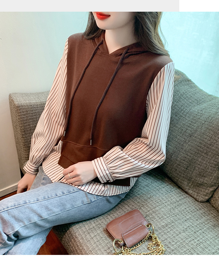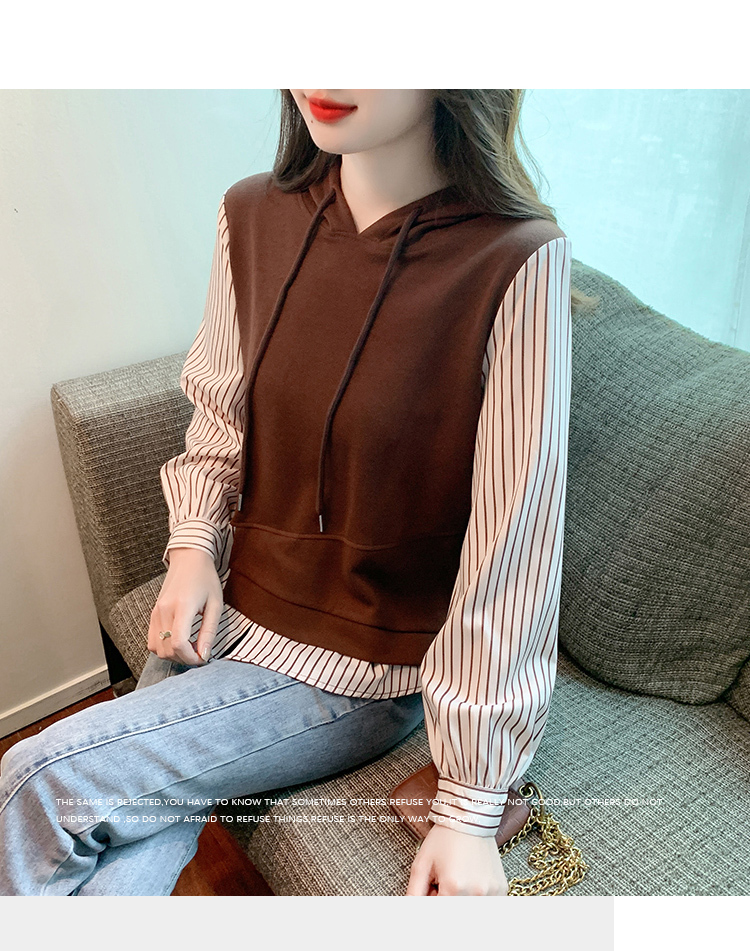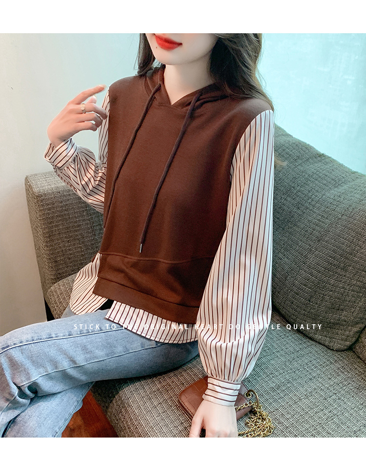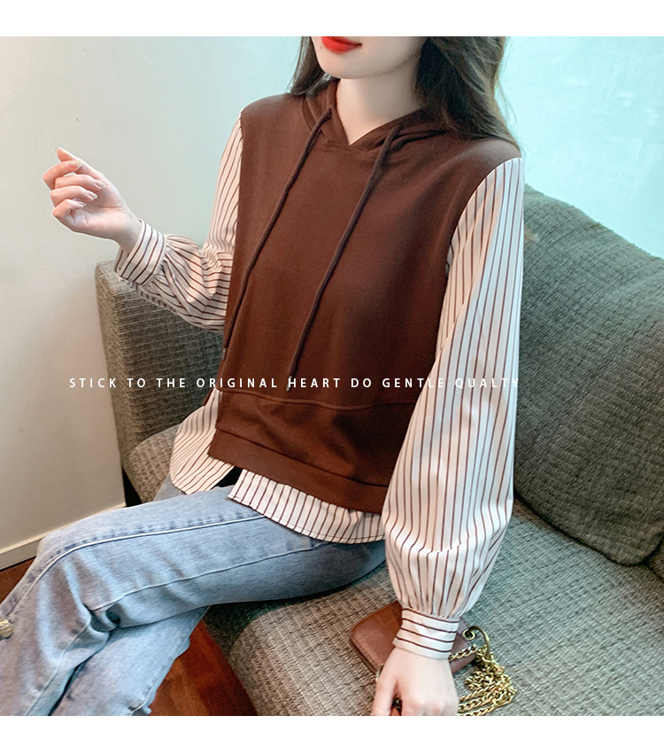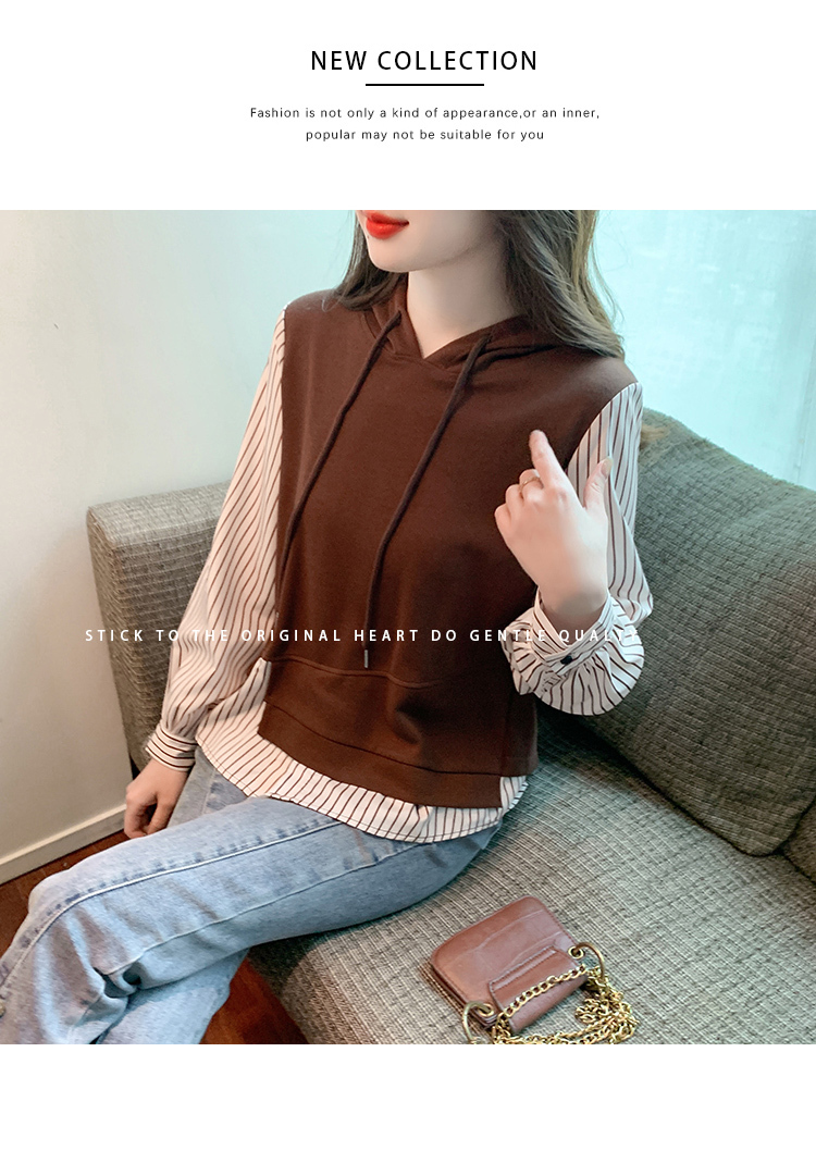 限量特惠|個性舒適拼接豎條紋假兩件式連帽上衣(11H5244)