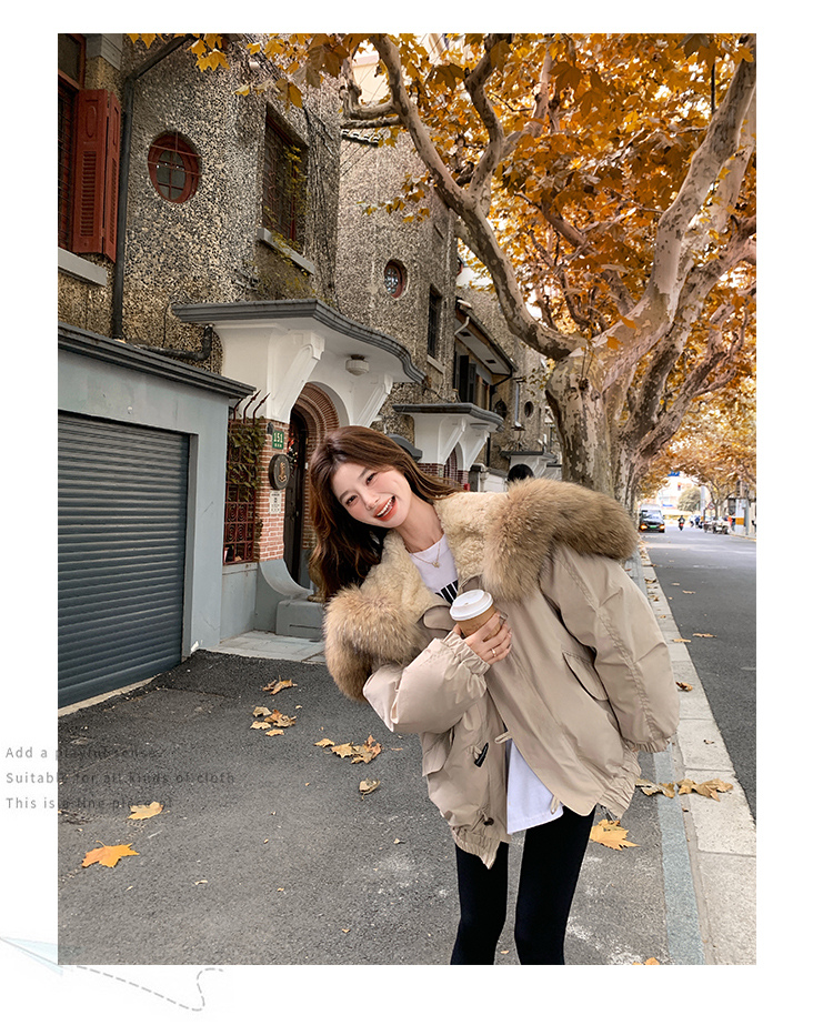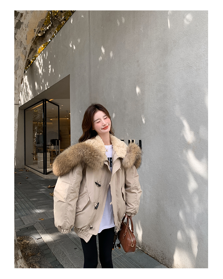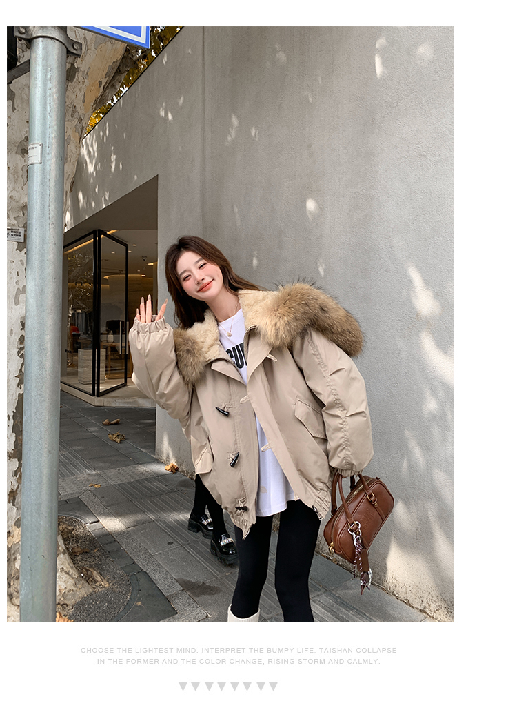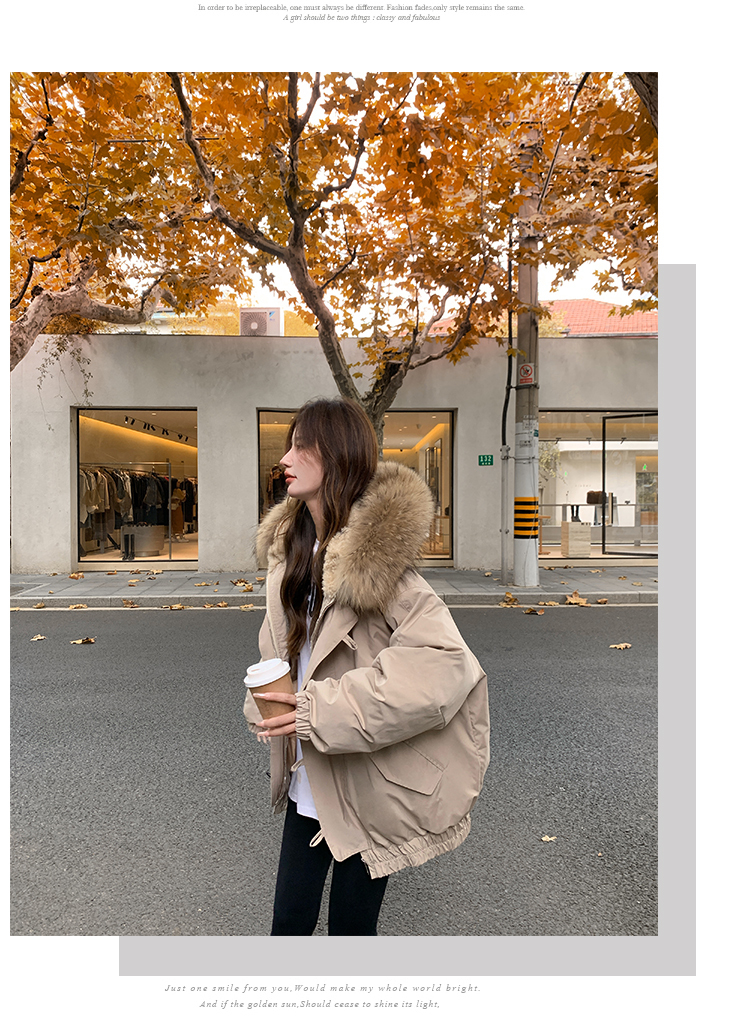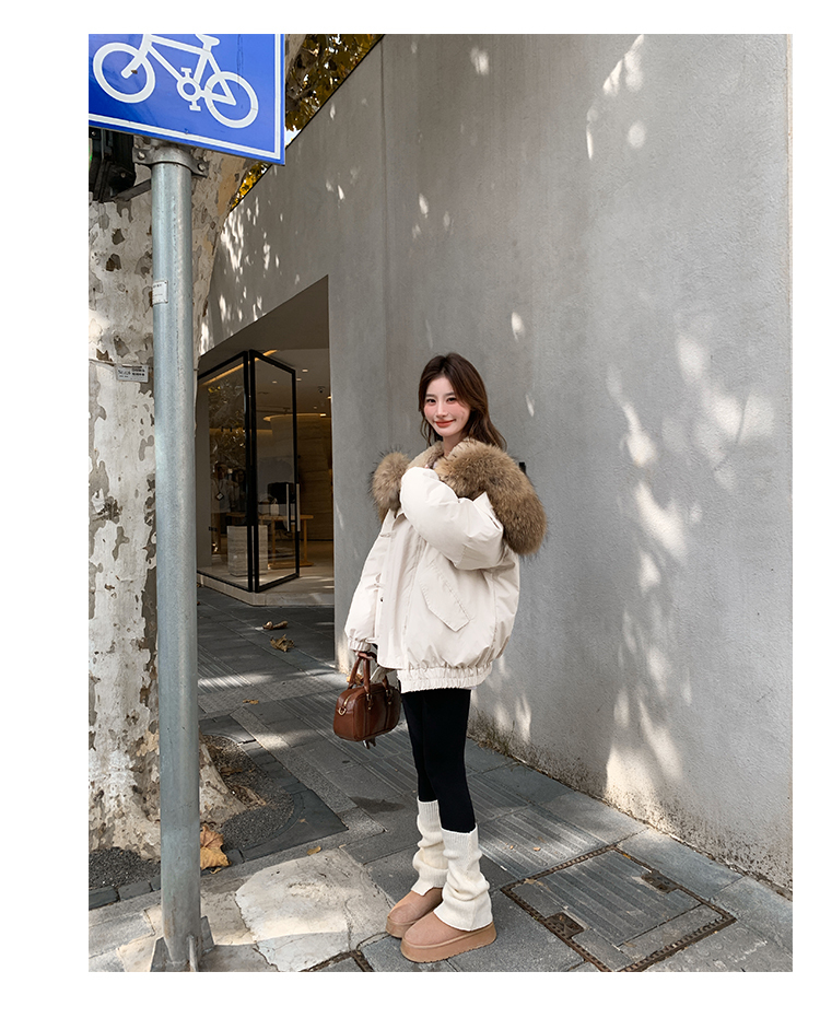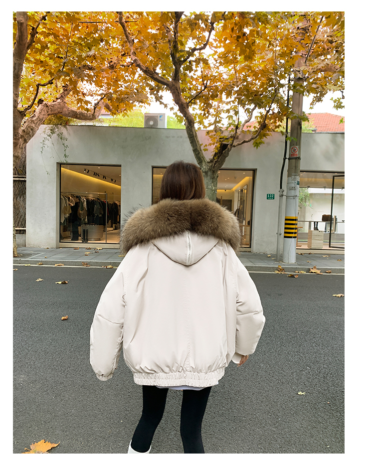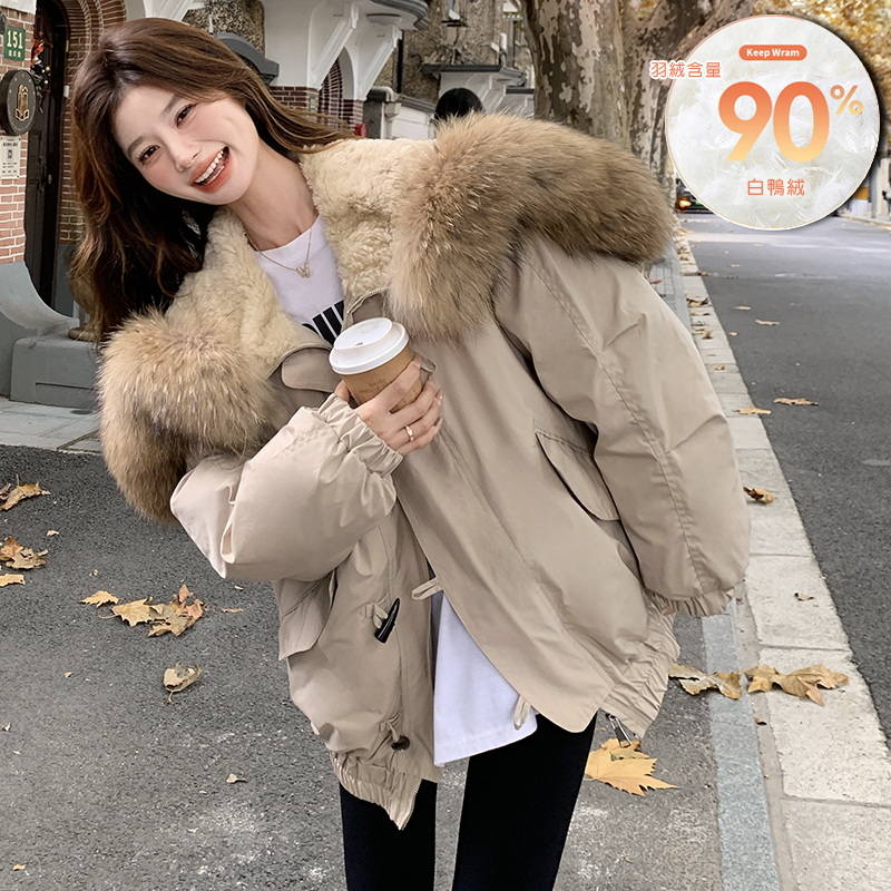 🔺面料:外層滌綸+內層填充:90%白鴨絨+仿貉子毛領(可拆)+帽裡仿兔毛絨